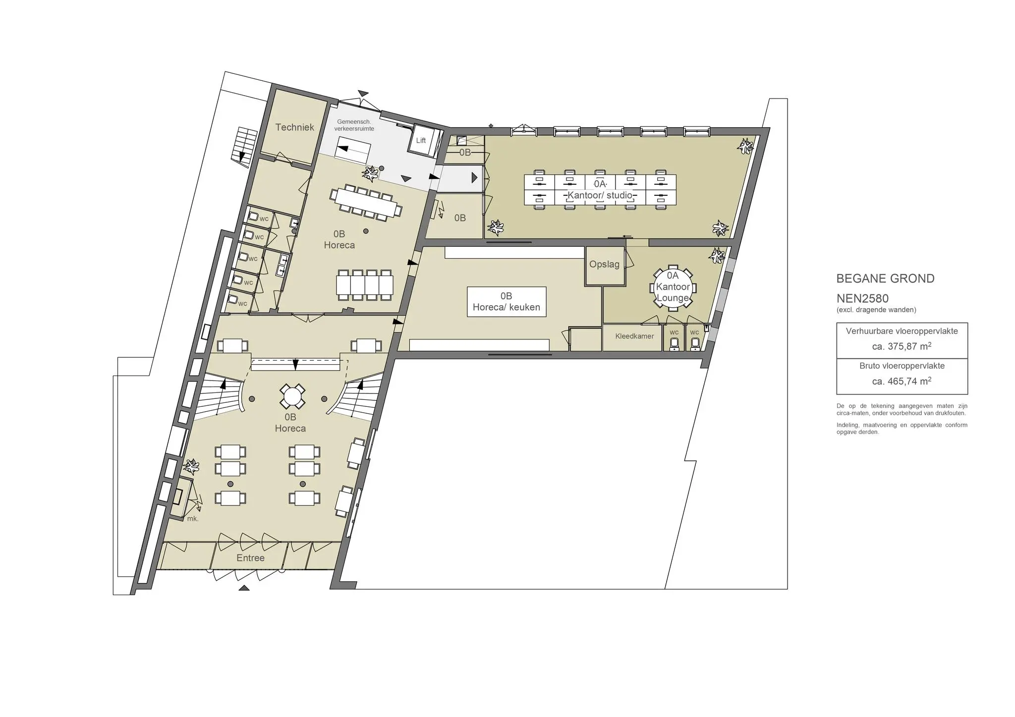 Op de begane grond is een kantoor/studioruimte aanwezig met hoge ramen en derhalve veel licht inval. De zelfstandige horecaruimte op de begane grond is tot 16 mei 2025 in gebruik door Restaurant Coulisse. Dit betreft de voormalige foyer met prachtige trappen naar de eerste verdieping vanwaar toegang tot de theaterzaal mogelijk is. Kenmerkend is de geheel glazen voorzijde met een indrukwekkend lichtinval.