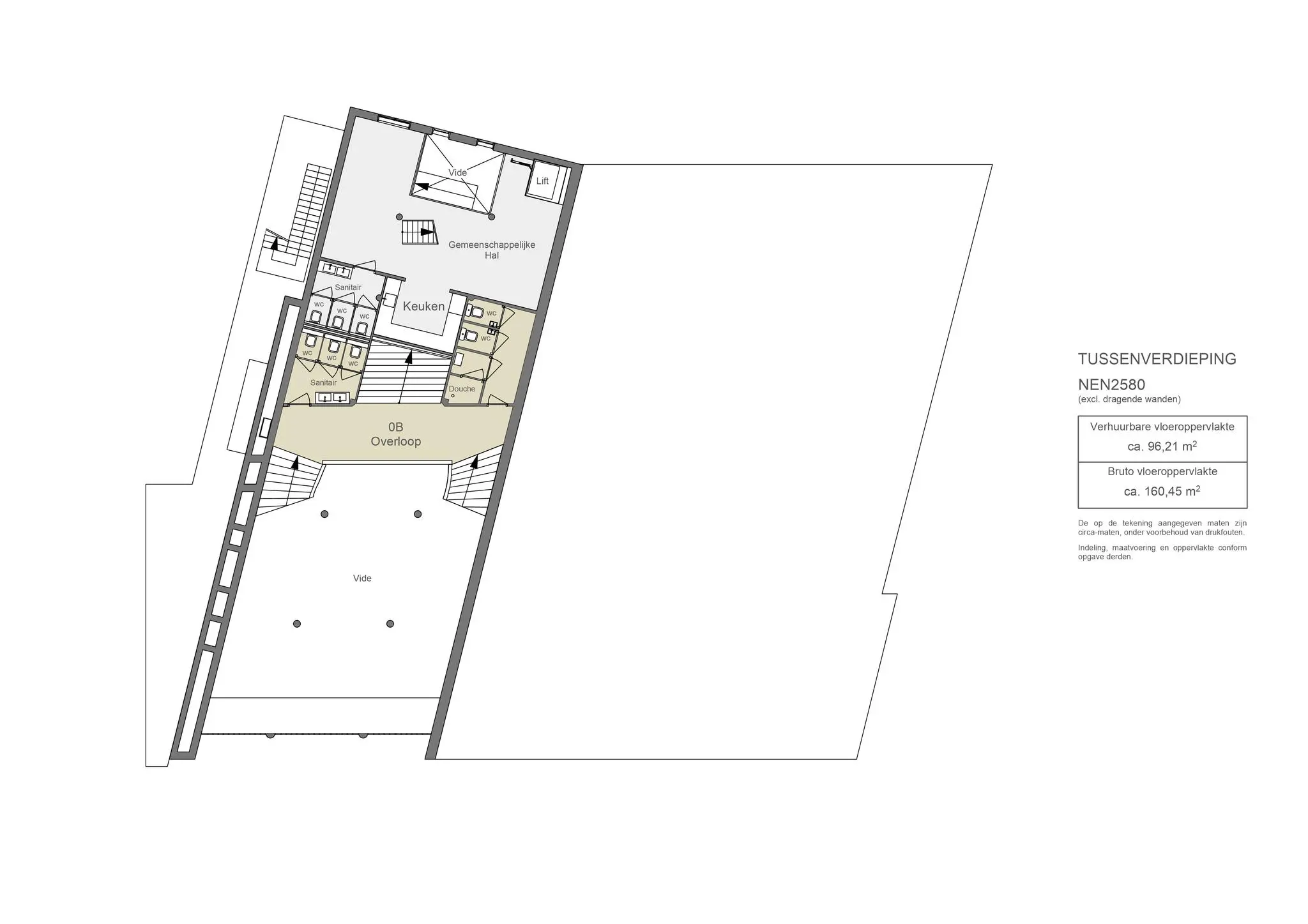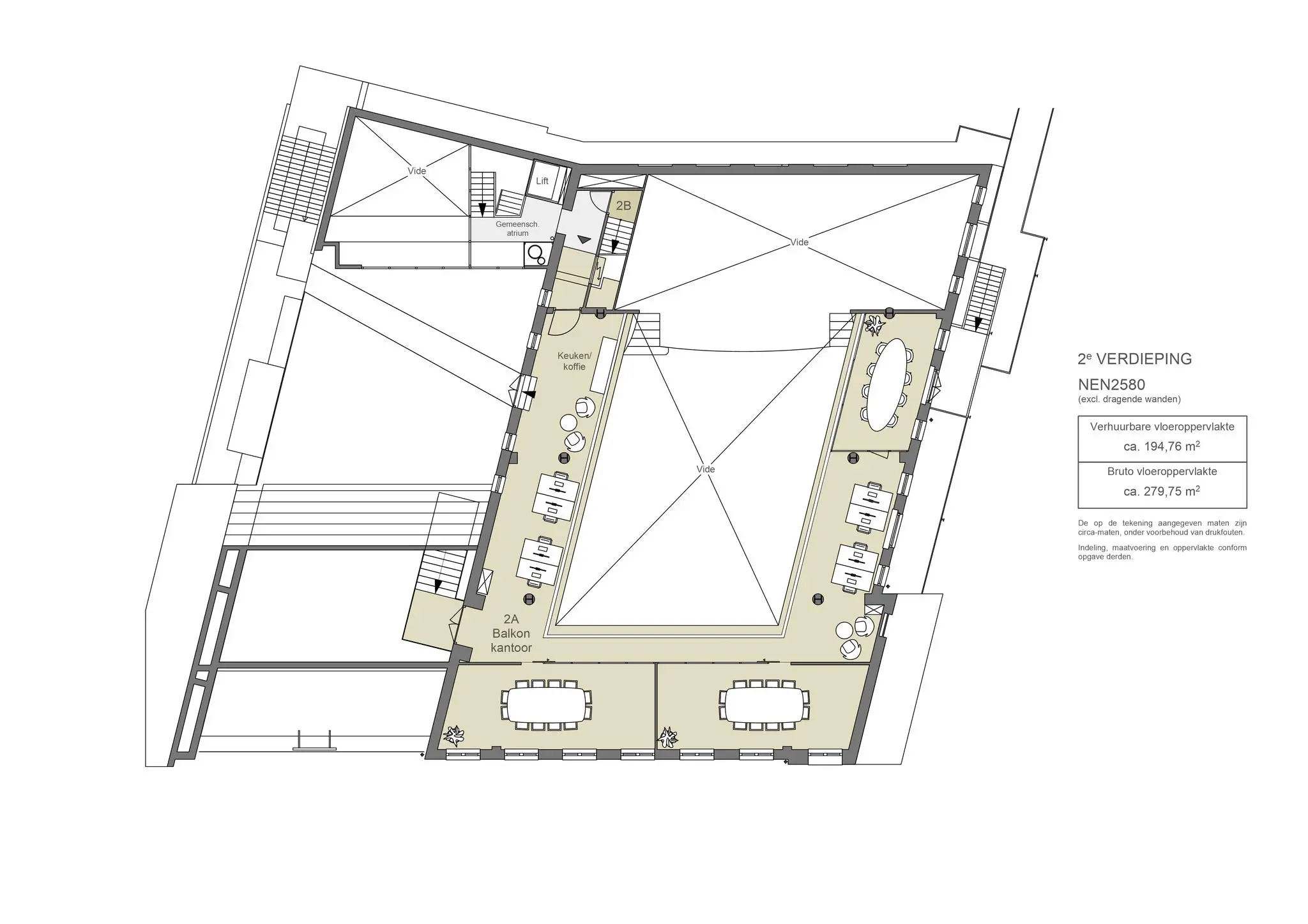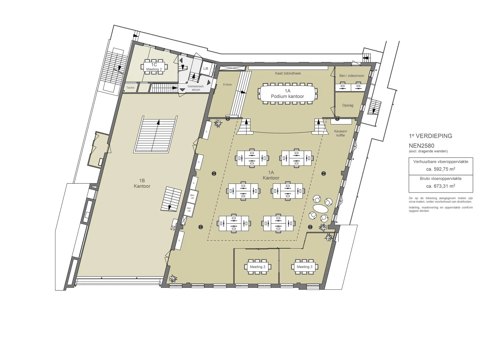 De voormalige theaterzaal met prachtig, nog zeer herkenbaar podium is in gebruik als kantoor. Rondom is een entresol waar diverse spreekkamers met transparante scheidingswanden zijn gerealiseerd. In de theaterzaal zijn werkplekken, een pantry en diverse werk-/ en spreekkamers gerealiseerd. Aan drie zijden zijn grote raampartijen en enkele openslaande deuren naar een balkon. Bijzonder is de zeer ruime vrije hoogte. Er is tevens een zolderverdieping met indrukwekkende kapconstructie waar eveneens voldoende ruimte is voor werkplekken.
