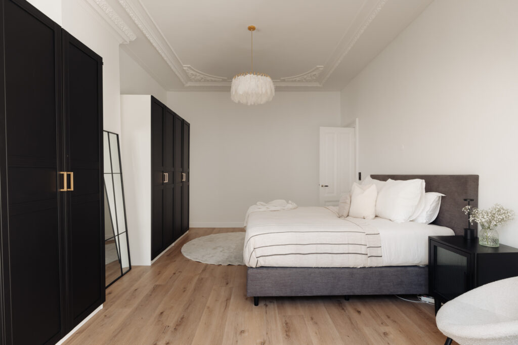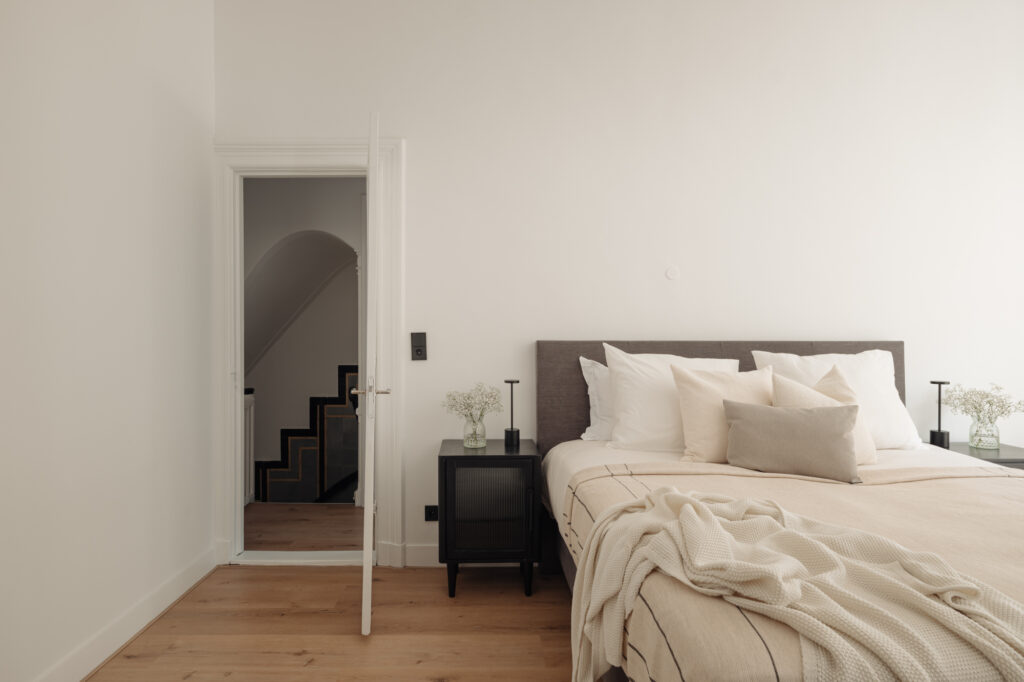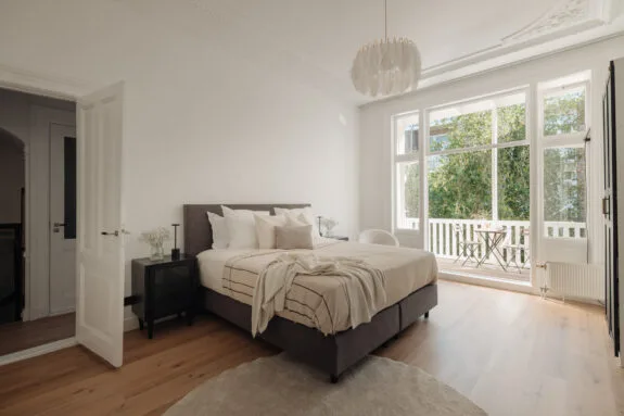 De hoofdslaapkamer, gesitueerd aan de achterzijde, beschikt over een fraai ornamentenplafond en aan beide zijden van de oorspronkelijke schouw zijn kledingkasten geplaatst. Vanuit deze kamer is via openslaande deuren een overdekt balkon op het zuiden toegankelijk. Hier kun je overdag heerlijk van de zon genieten. De centraal gelegen badkamer is uitgerust met een ligbad, inloopdouche, dubbel wastafelmeubel en een kast voor de wasmachine en droger. Op de overloop bevindt zich nog een separaat toilet. De overige drie slaapkamers variëren in grootte, waarvan één toegang biedt tot een balkon.
