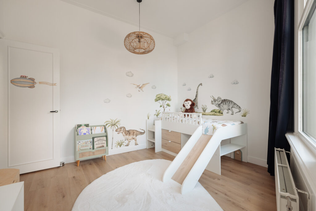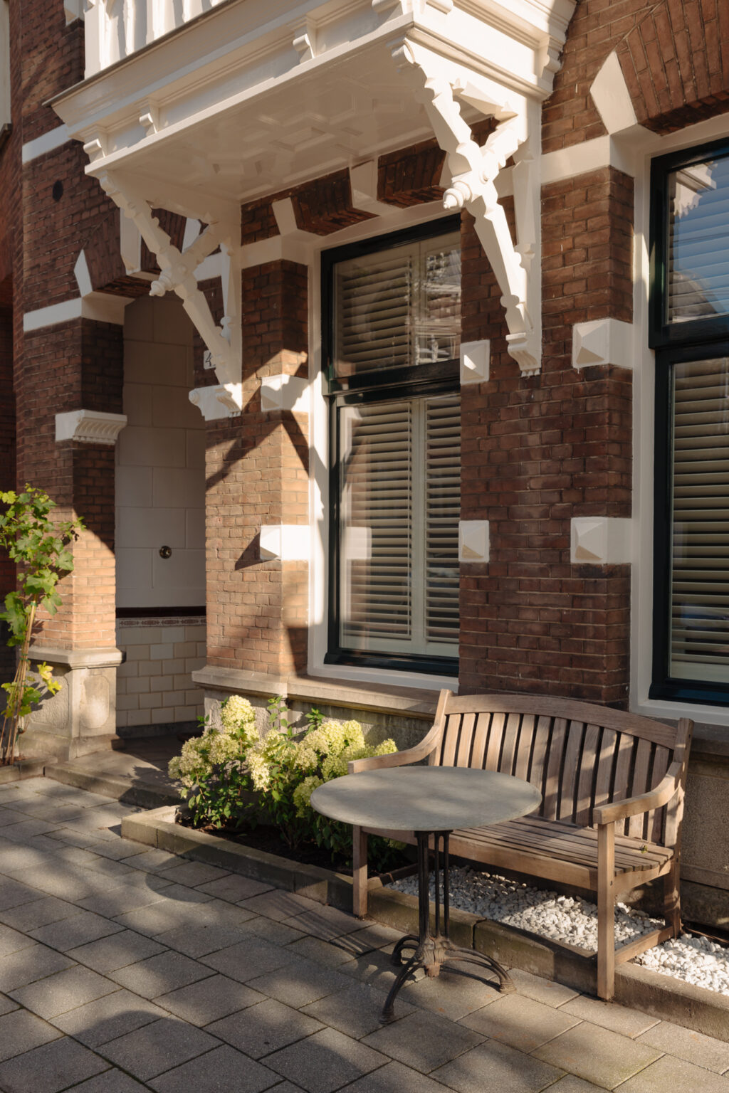 De entree biedt een rijk gedetailleerde hal met origineel tegelwerk en glas-in-lood, die doorloopt in de kamer-en-suite met schuifdeuren. Het woongedeelte aan de voorzijde beschikt over een open haard, terwijl de eetkamer aan de achterzijde grenst aan een serre met openslaande deuren naar de zonnige tuin op het zuiden. De eikenhouten vloer loopt door in het gehele woon- en eetgedeelte. De halfopen keuken in L-vorm staat in verbinding met de eetkamer en biedt toegang tot de tuin. Er is een mogelijkheid om de keuken verder te openen naar de woonkamer, mits een vergunning. Op de eerste verdieping bevindt zich de hoofdslaapkamer met ornamentenplafond en een overdekt balkon op het zuiden. De badkamer is voorzien van een ligbad, inloopdouche en dubbele wastafels. Drie extra slaapkamers, variërend in grootte, bevinden zich ook op deze verdieping, waarvan één met balkon. Het souterrain bestaat uit drie ruime opslagruimtes, en de zonnige tuin op het zuiden biedt een veranda, kunstgrasveld en een speelhuisje voor kinderen. Borders met vaste planten omlijsten de tuin, waardoor het een groene, uitnodigende buitenruimte is.