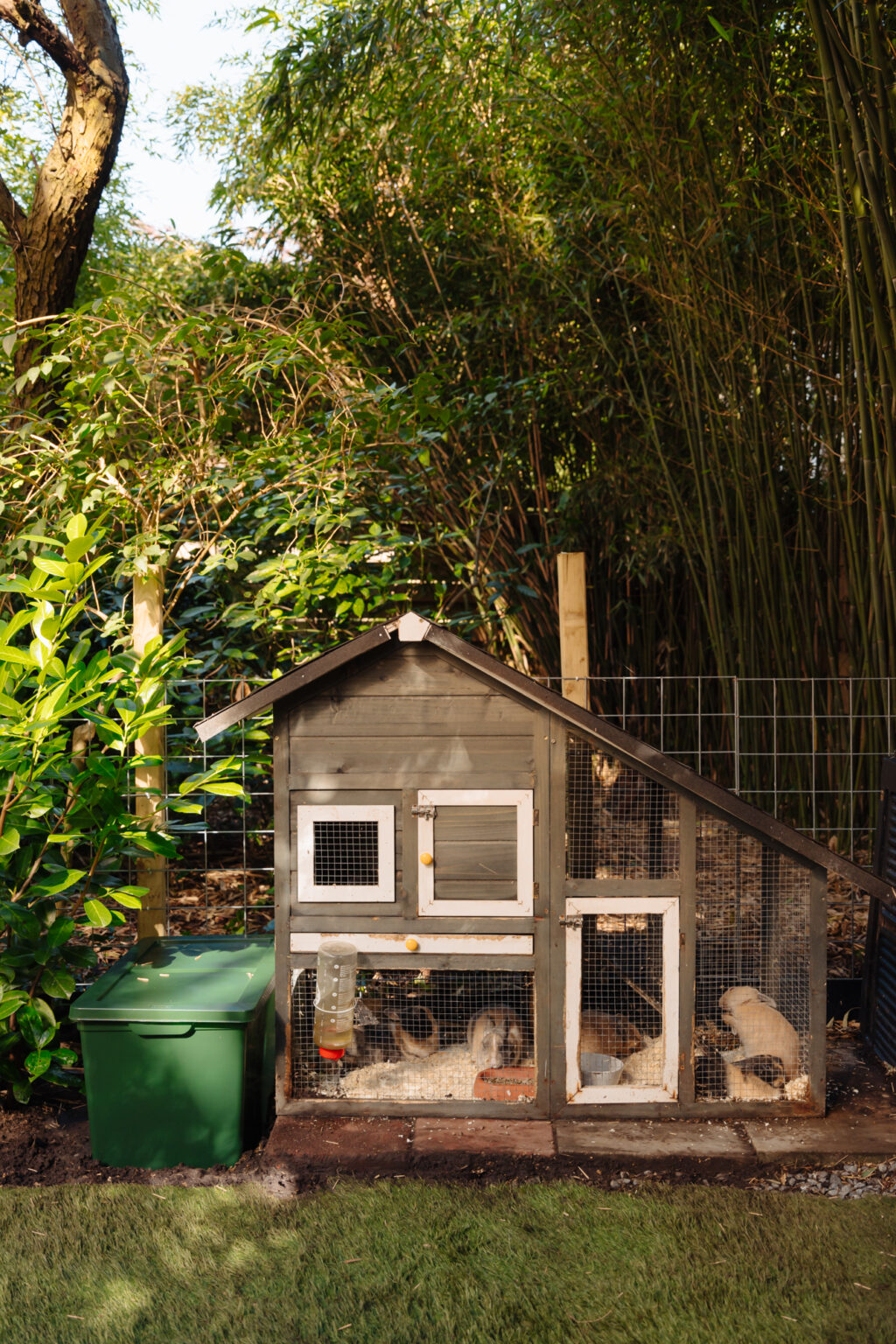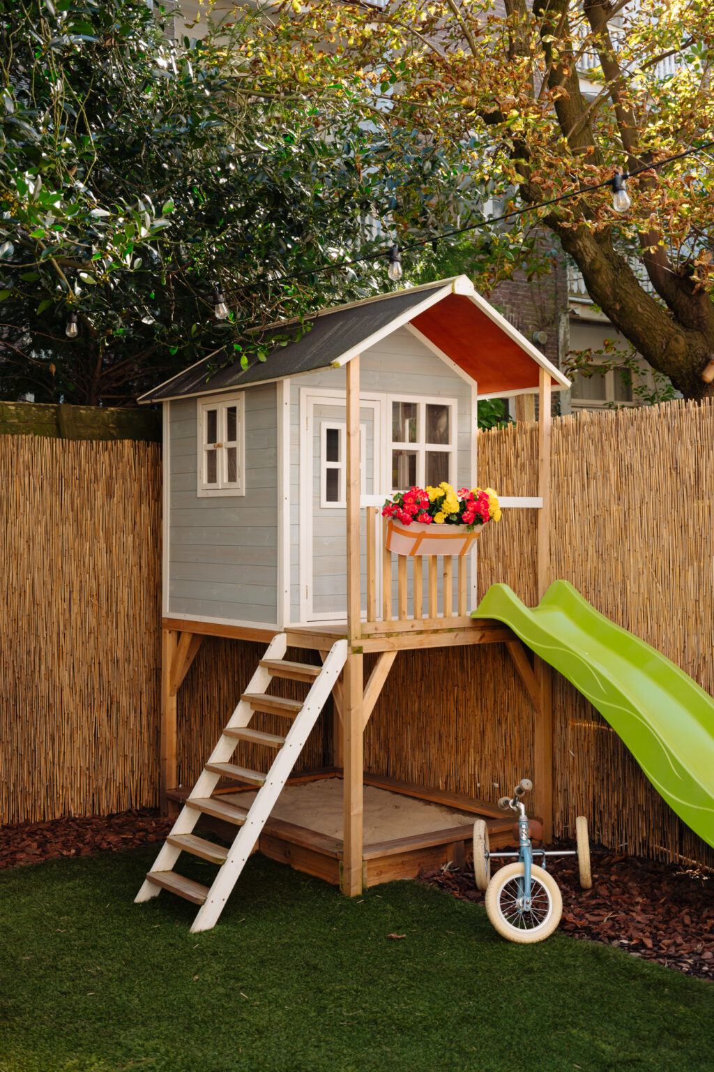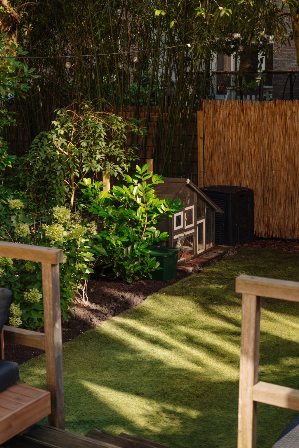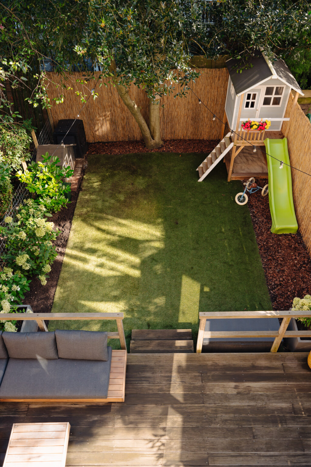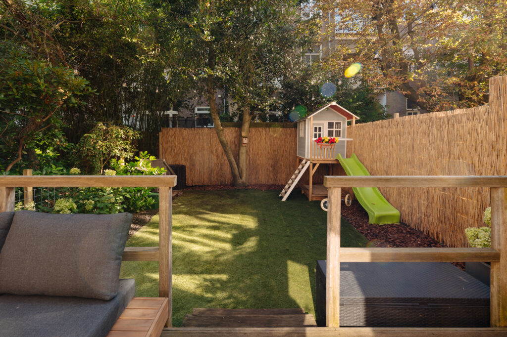 De zonnige tuin op het zuiden is toegankelijk via de serre met openslaande deuren naar de veranda. Vanuit de keuken is er ook een toegangsdeur naar deze veranda. Vanaf de veranda is er een trap naar de tuin die is voorzien van een kunstgrasveld en een speelhuisje met glijbaan. Voorts zijn er aan beide zijden borders met vaste planten.