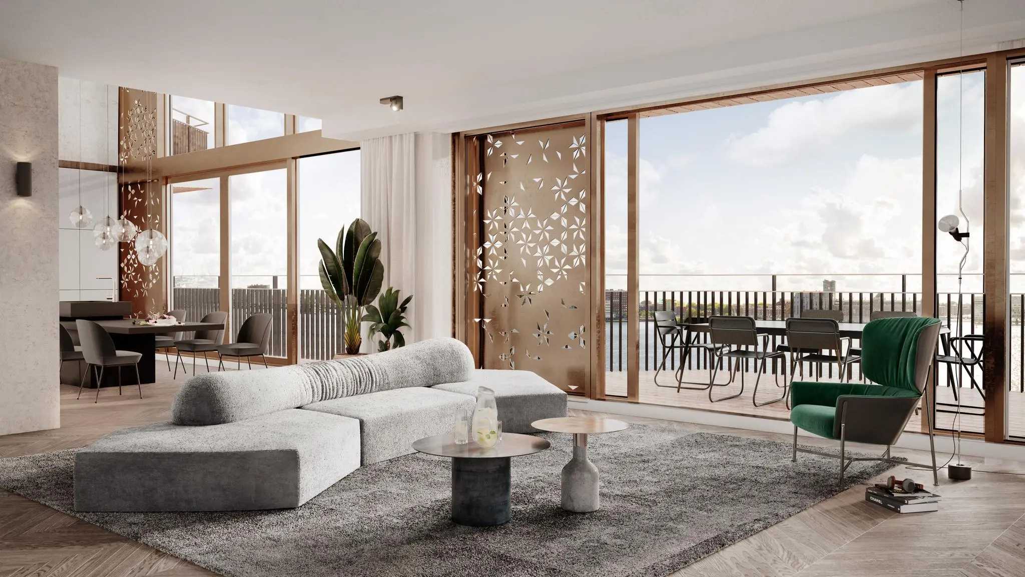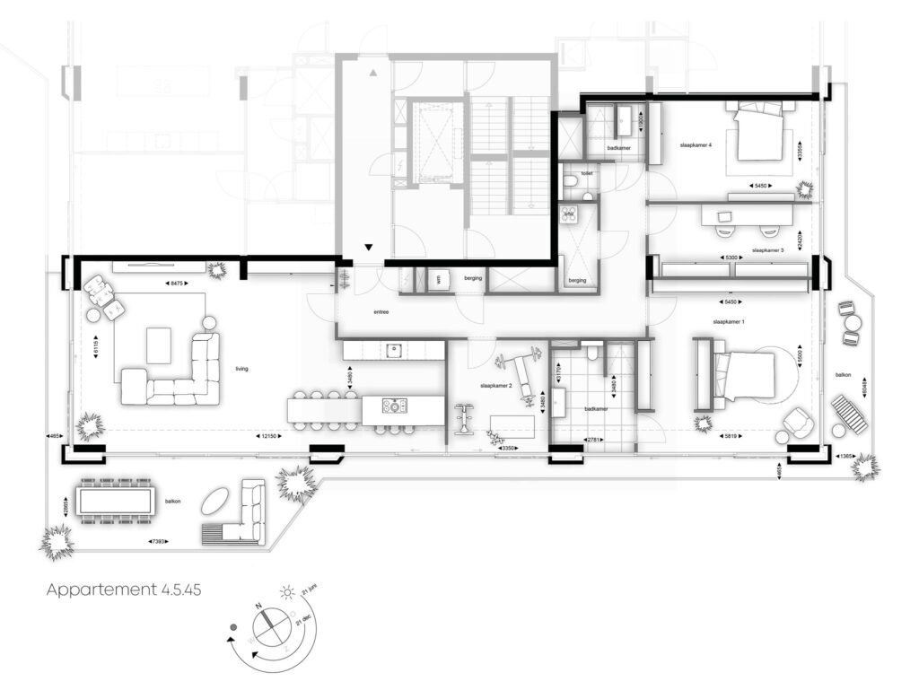 De hele voorzijde van de vijfde verdieping is voor Blanc 4.5.45. Dat betekent licht, ruimte en IJ-zicht in deze woning van ca. 198 m2. De living in de zuid westhoek van het gebouw is 12 meter breed. Vanaf het ruime terras op het zuiden dat aan de living grenst, geniet u van de mooiste uitzichten (totale buitenruimte ca. 55 m2). Ook de master bedroom is heel ruimtelijk ingedeeld met een inloopkast, een aangrenzende badruimte en een eigen terras. De woning heeft nog drie (slaap)kamers en een extra badkamer. De indeling van het appartement kan in overleg naar uw wensen worden aangepast.