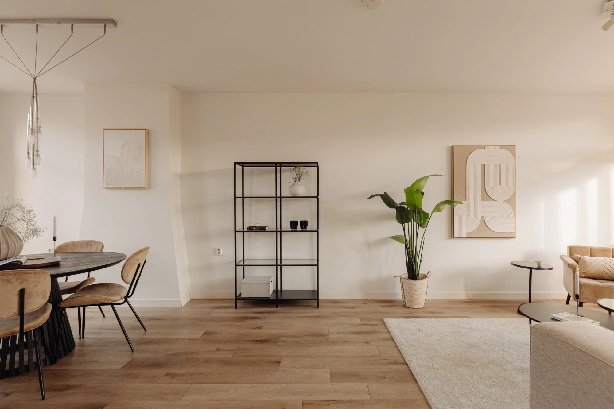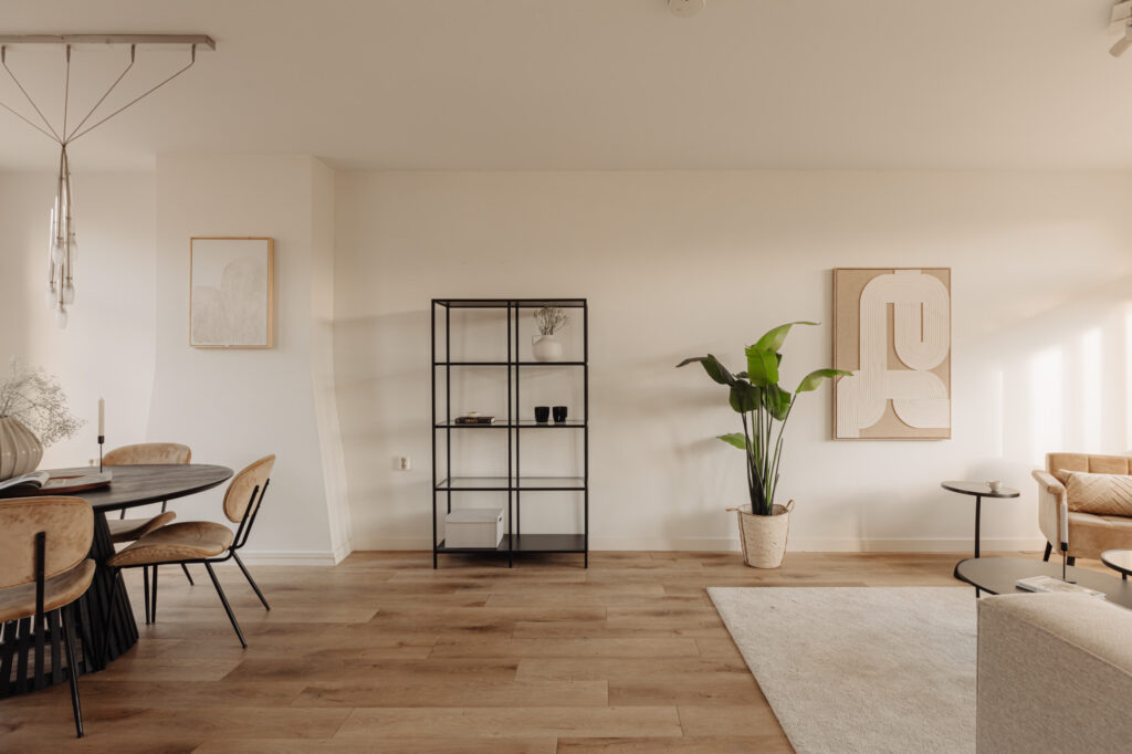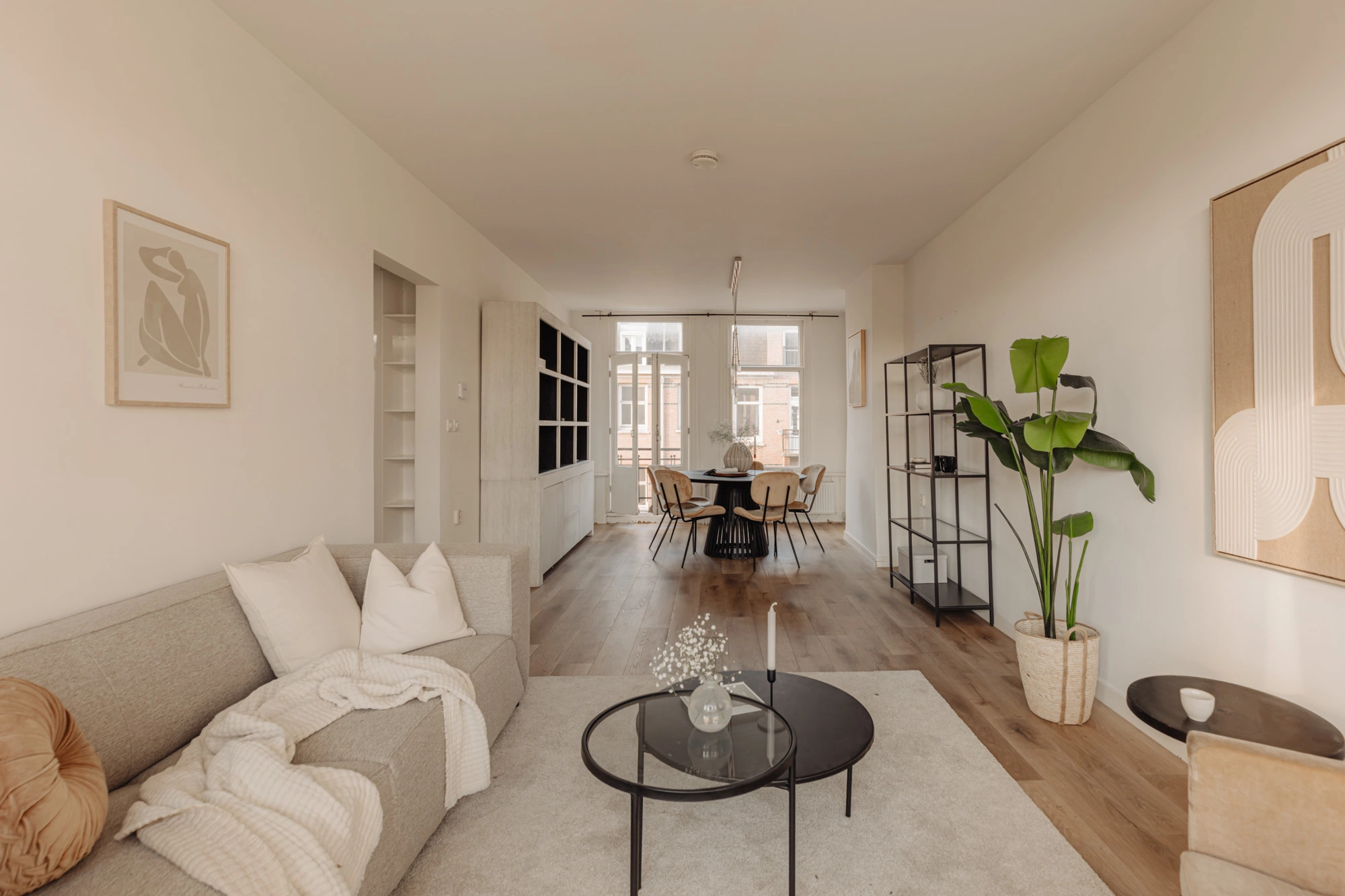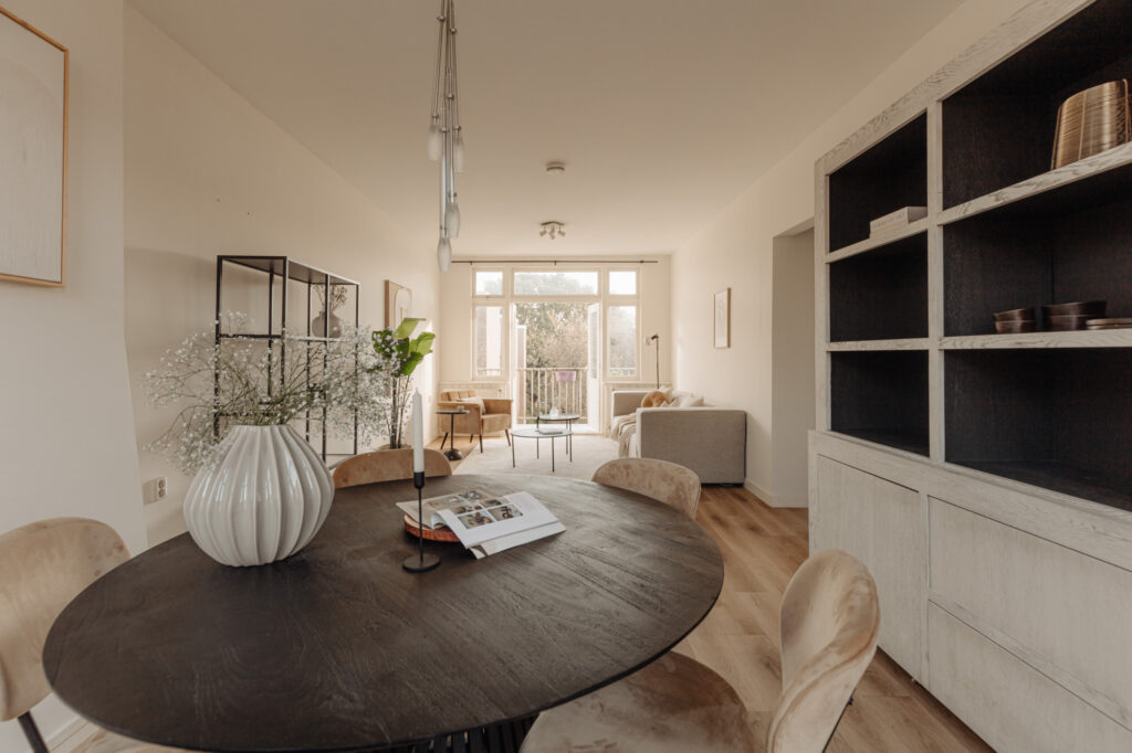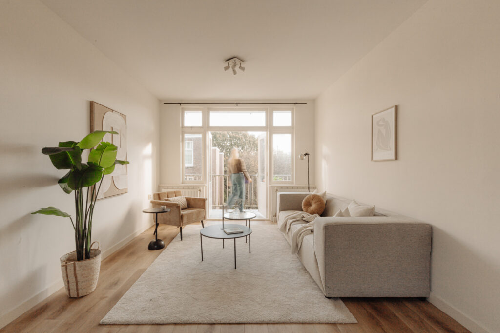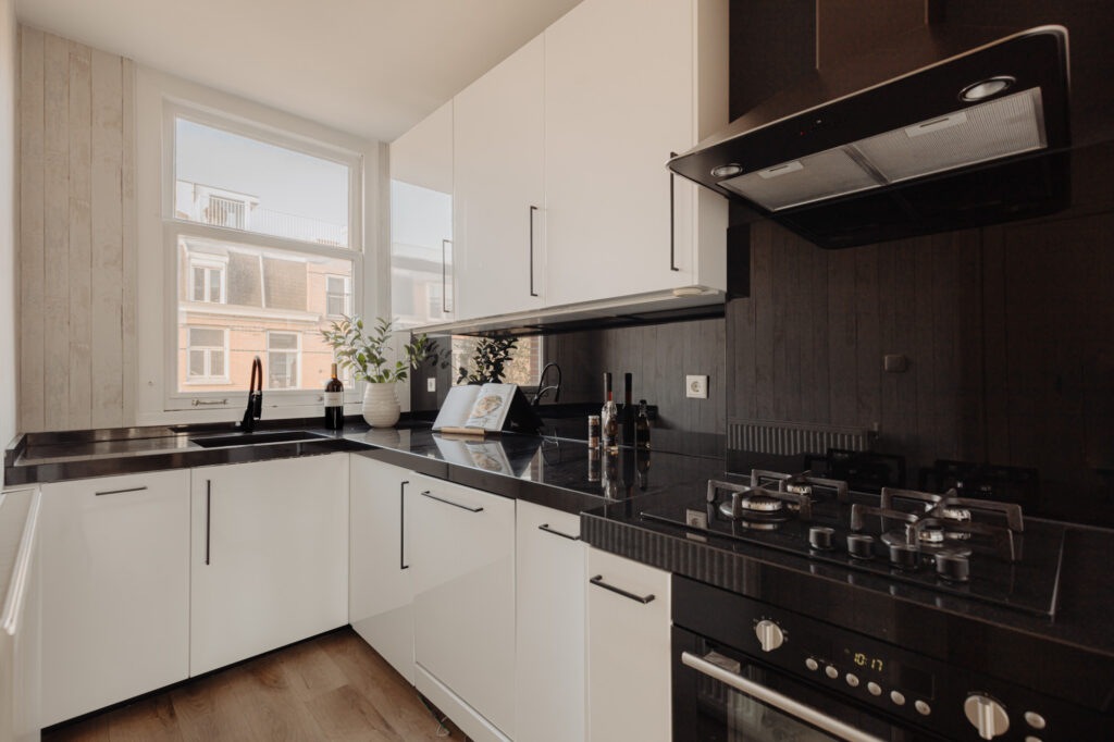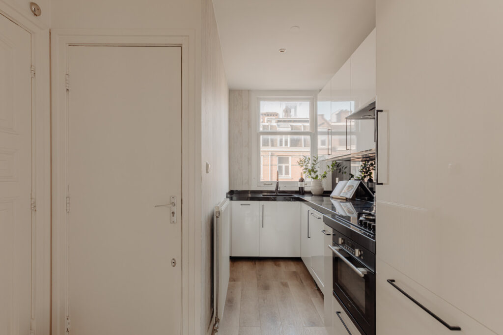 De ruime woonkamer vormt een open en uitnodigende ruimte met veel daglicht, ideaal voor zowel ontspanning als het ontvangen van gasten. Aan de voorzijde bevindt zich een Frans balkon, waar u kunt genieten van de ochtendzon en het uitzicht op de levendige straat. Aan de achterzijde biedt een royaal balkon over de volledige breedte van het appartement een rustige plek om buiten te zitten. De keuken, voorzien van diverse inbouwapparatuur, is naast de woonkamer gesitueerd. Hierdoor is de keuken eenvoudig te bereiken maar niet zichtbaar vanuit de woonkamer.