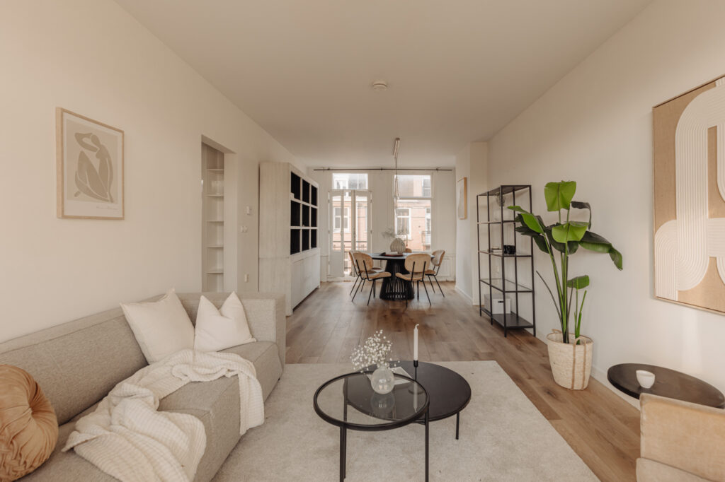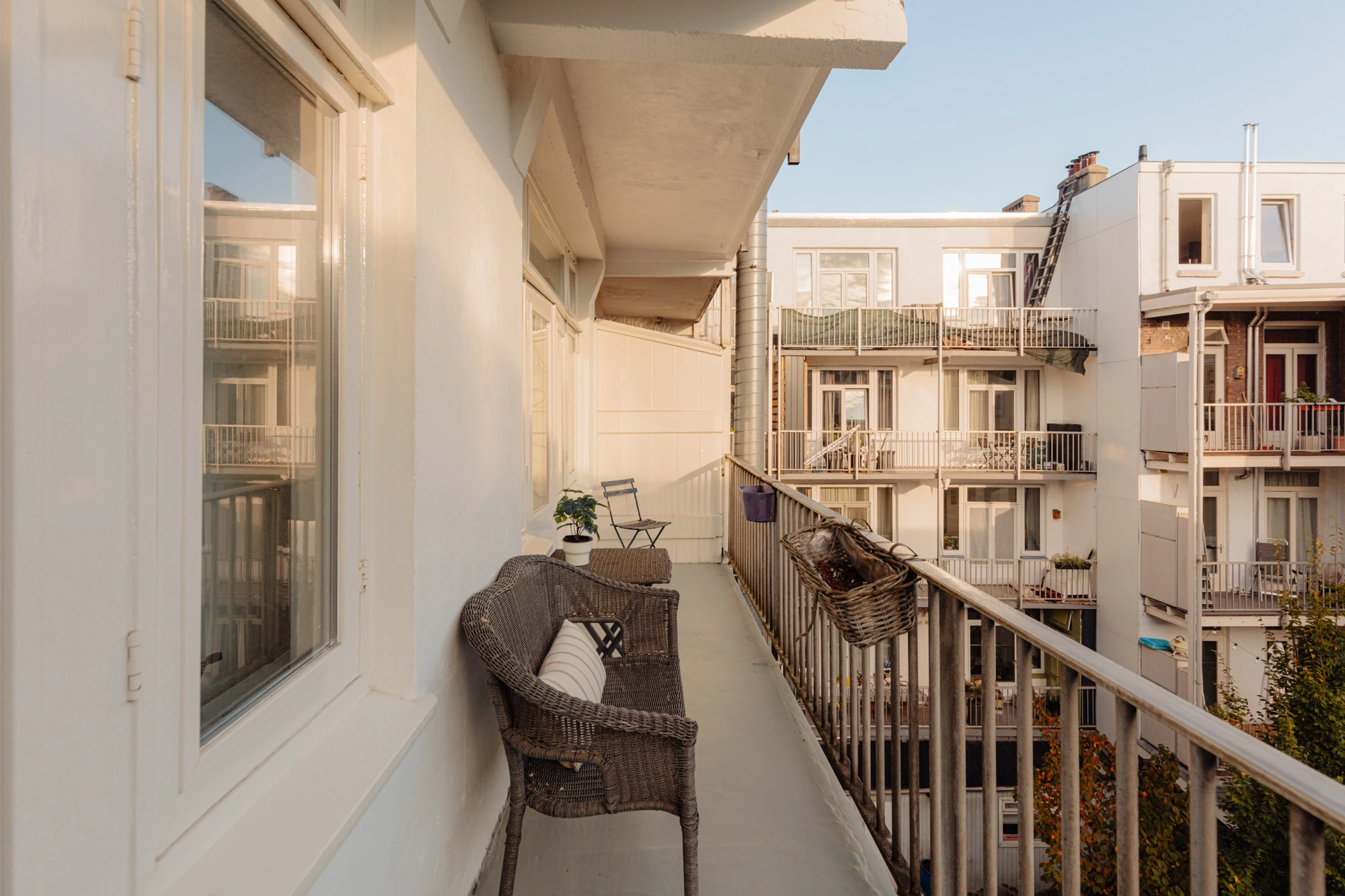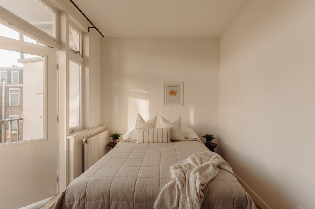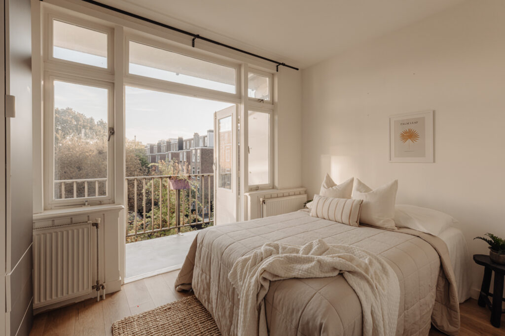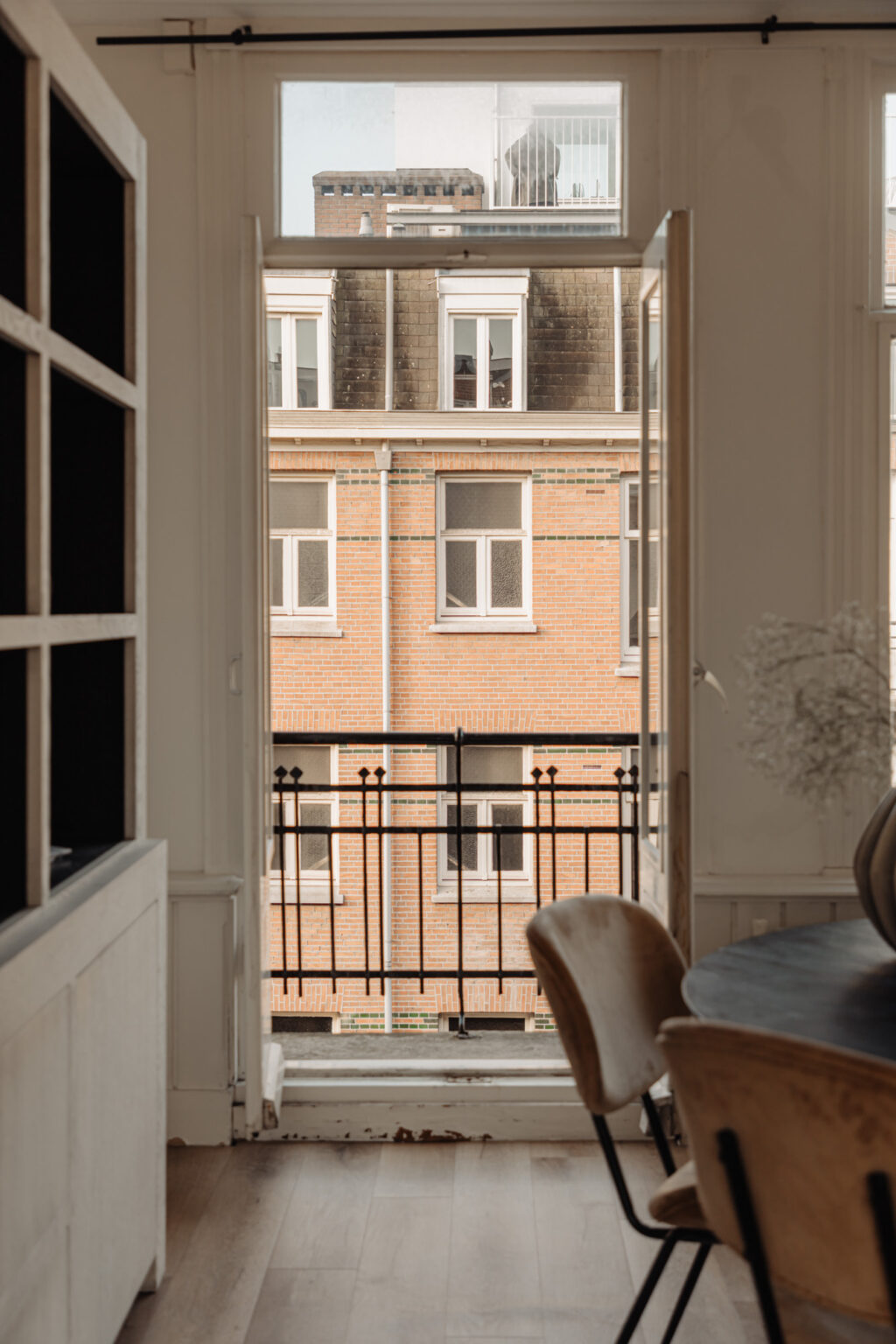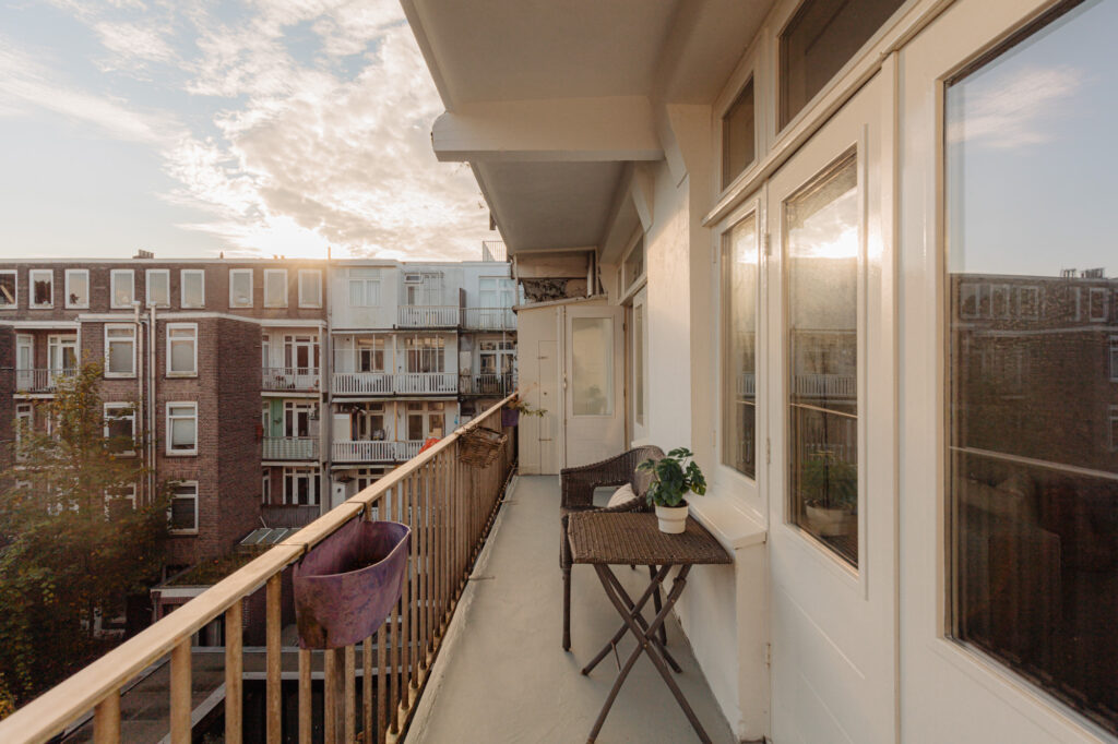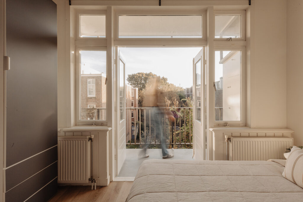 Het appartement biedt twee buitenruimtes, elk met een eigen sfeer en functie. Aan de voorzijde bevindt zich het charmante Franse balkon, perfect voor een ontspannen moment in de avondzon met uitzicht op de karakteristieke straat. Aan de achterzijde ligt een ruim balkon over de volledige breedte van de woning, een ideale plek om buiten tot rust te komen.