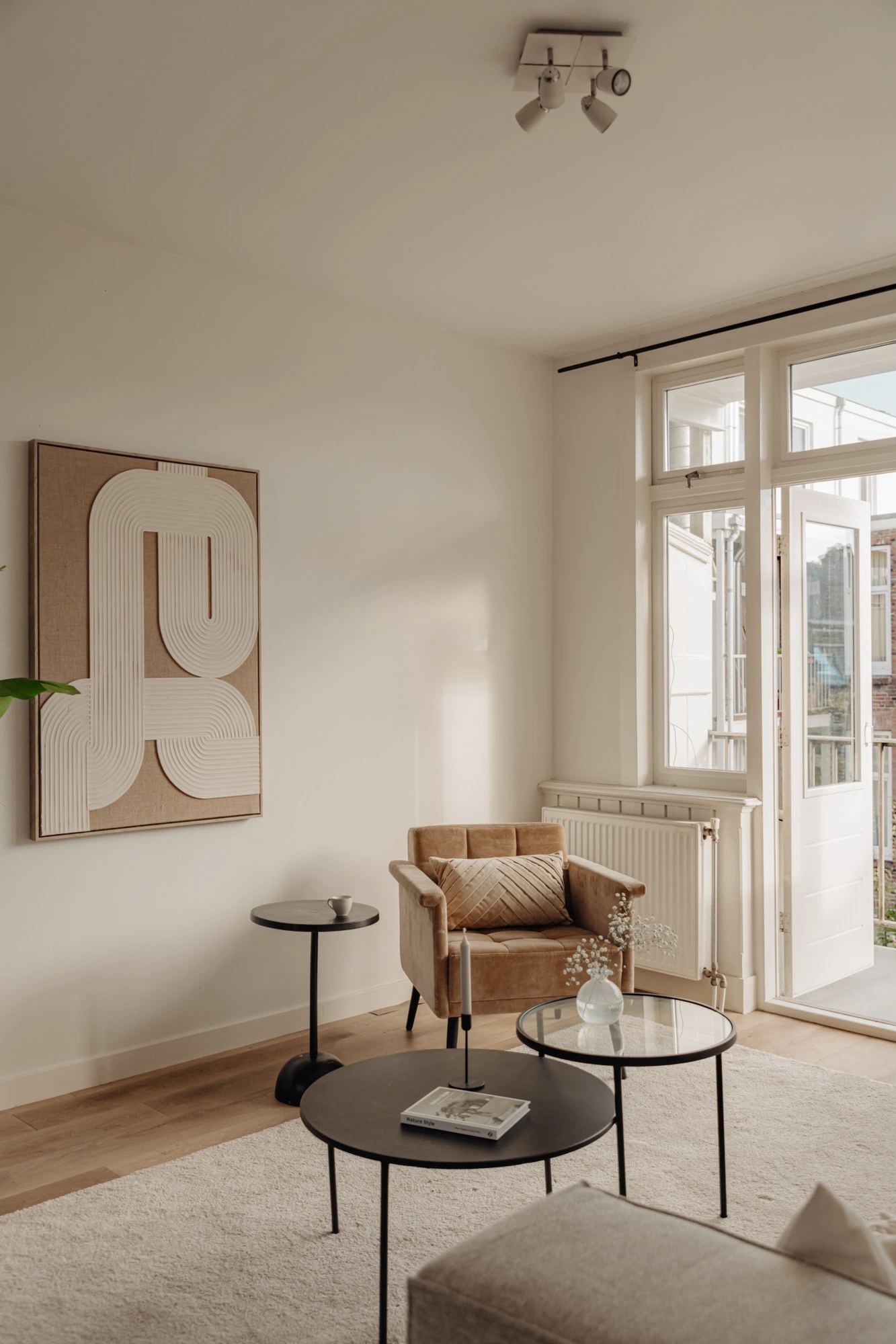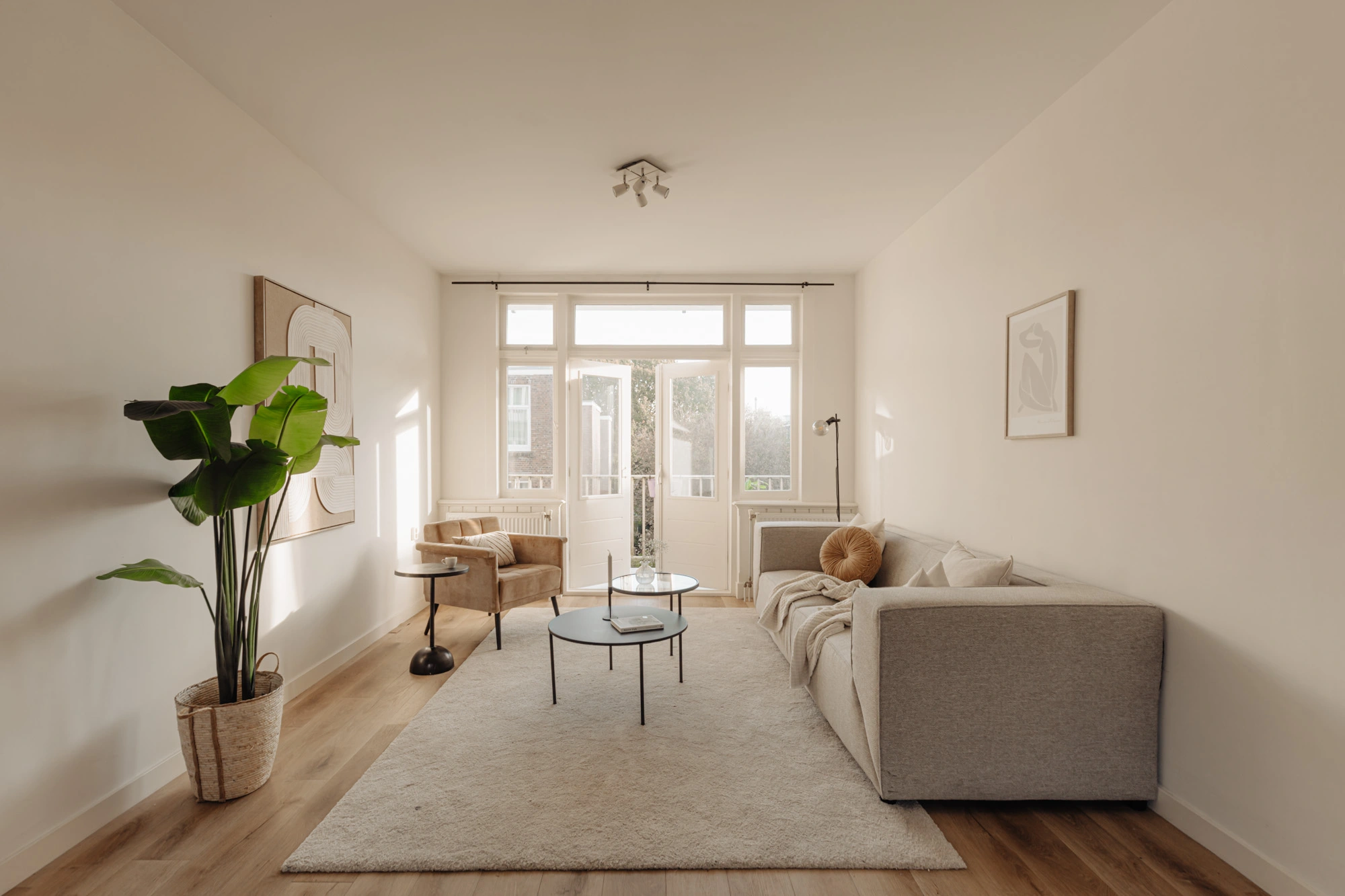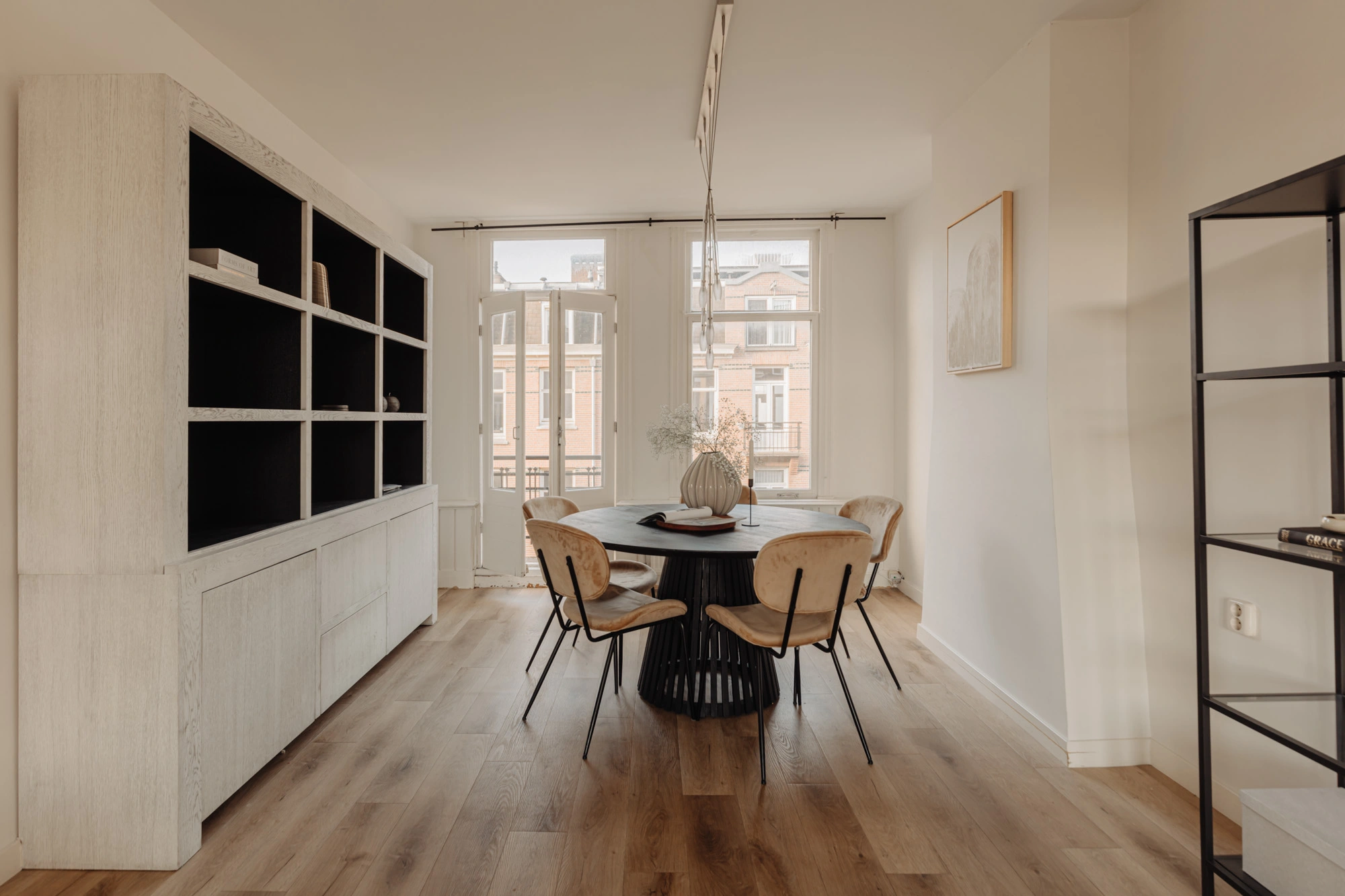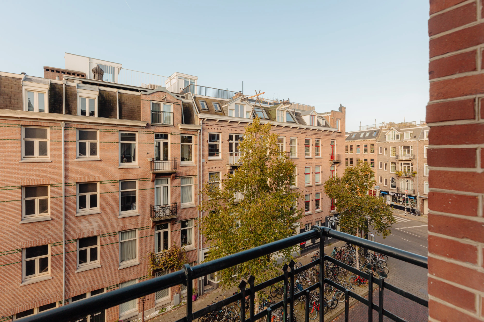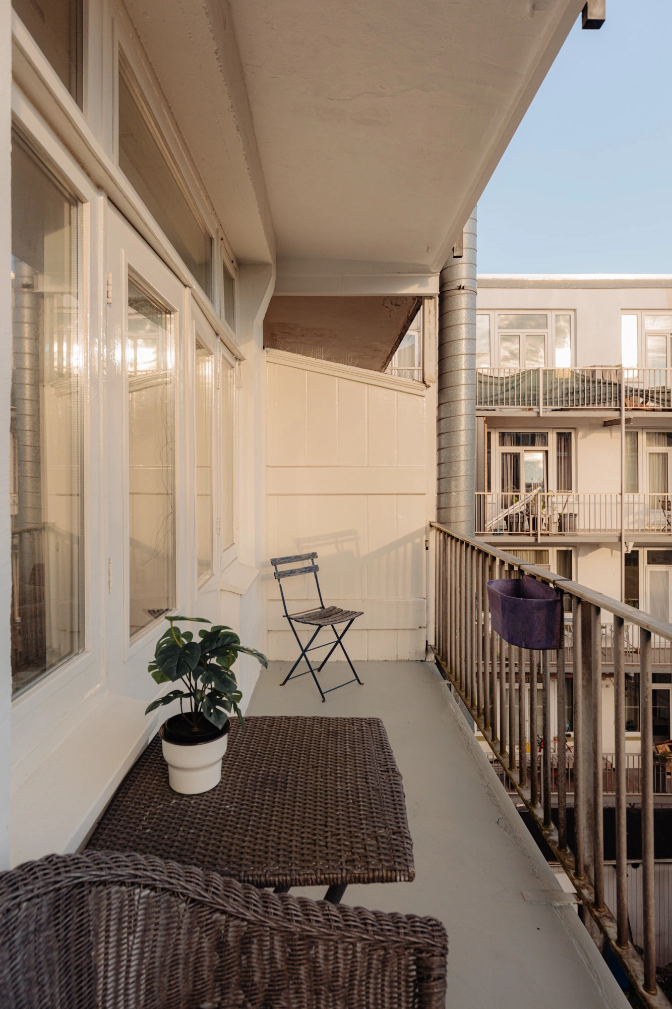 Het appartement biedt twee buitenruimtes, elk met een eigen sfeer en functie. Aan de voorzijde bevindt zich het charmante Franse balkon, perfect voor een ontspannen moment in de avondzon met uitzicht op de karakteristieke straat. Aan de achterzijde ligt een ruim balkon over de volledige breedte van de woning, een ideale plek om buiten tot rust te komen.