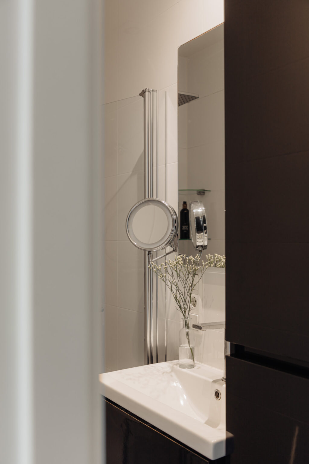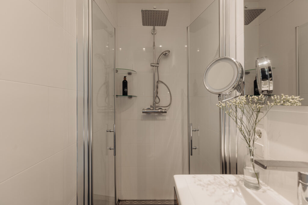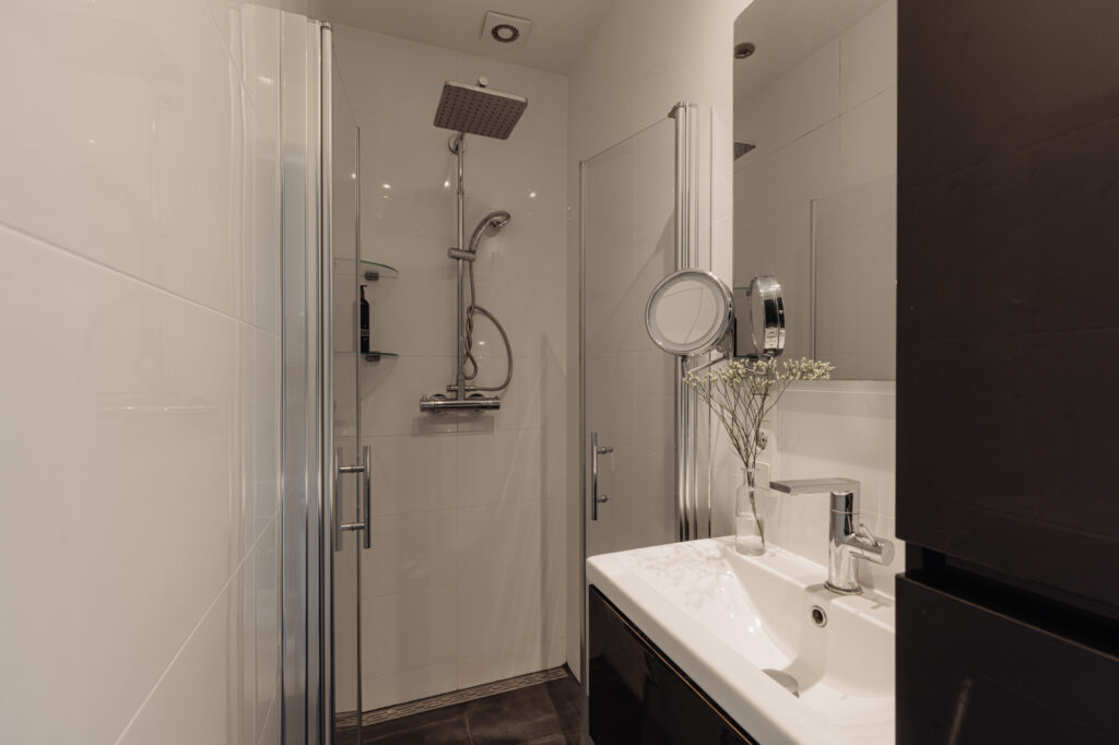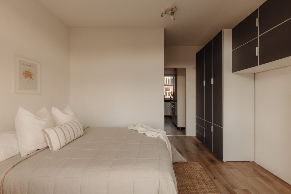 Aan de rustige achterzijde ligt de slaapkamer, compleet met een badkamer en-suite. Deze ruimte biedt privacy en is geschikt voor een tweepersoonsbed en opbergmogelijkheden. De badkamer is modern afgewerkt en beschikt over een inloopdouche en wastafelmeubel, ideaal voor een comfortabele start van de dag. Het aparte toilet bevindt zich in de centrale hal bij de entree.