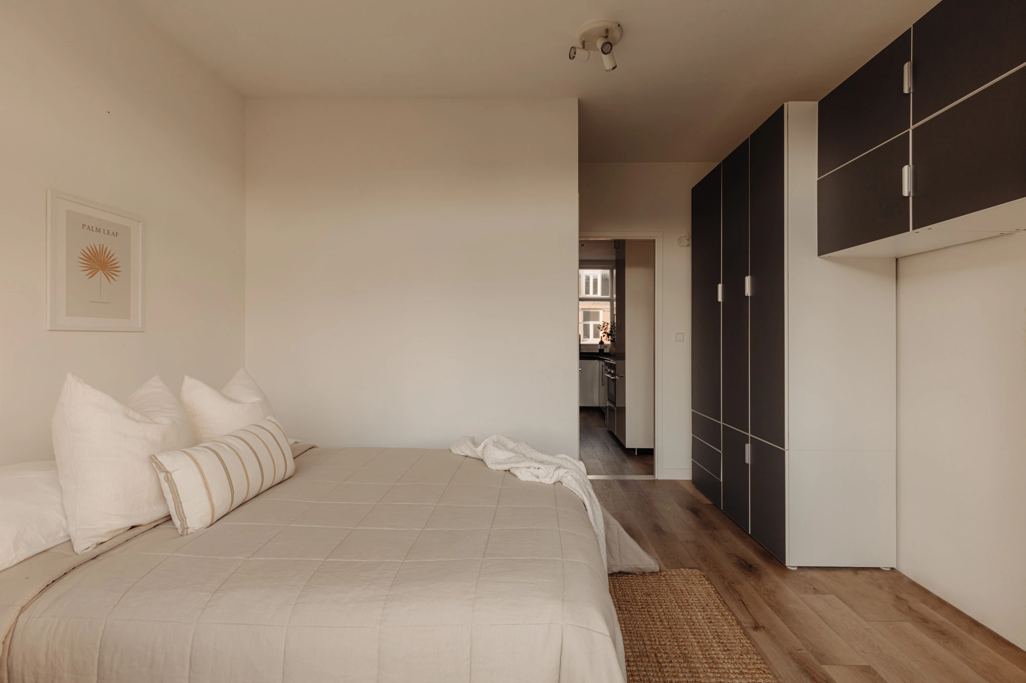Bij binnenkomst leidt de hal naar de keuken, die direct naast de entree ligt en praktisch is ingericht voor comfortabel koken. Via de hal is de rustige slaapkamer aan de achterzijde bereikbaar, compleet met en-suite badkamer, voorzien van een inloopdouche en wastafelmeubel. Aan het einde van de hal bevindt zich de lichte woonkamer, die aan de voorzijde toegang biedt tot een charmant Frans balkon. Het ruime balkon aan de achterzijde, bereikbaar via de woonkamer, biedt een rustige buitenplek over de volledige breedte van het appartement.