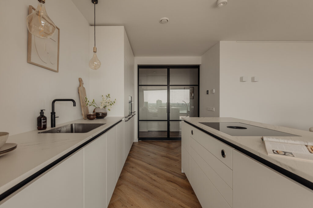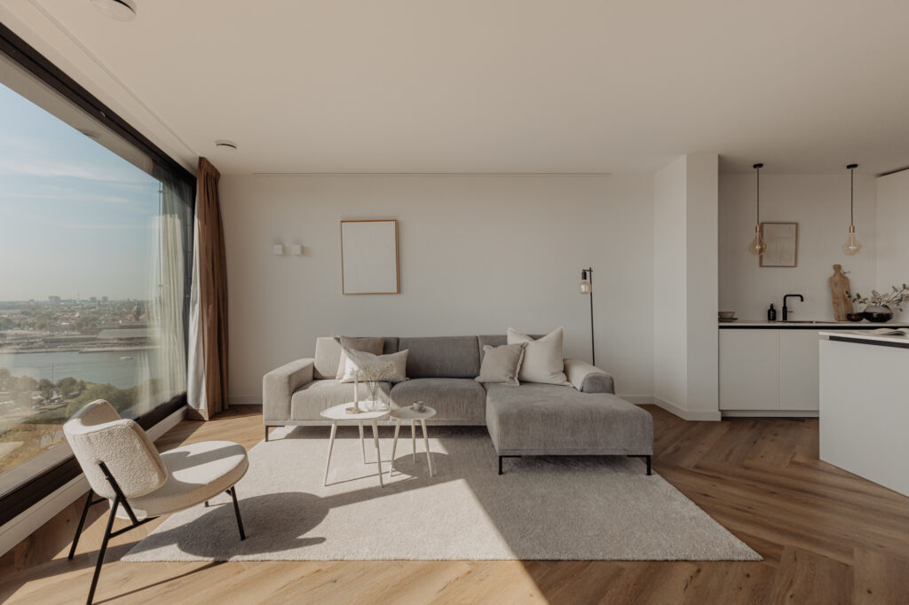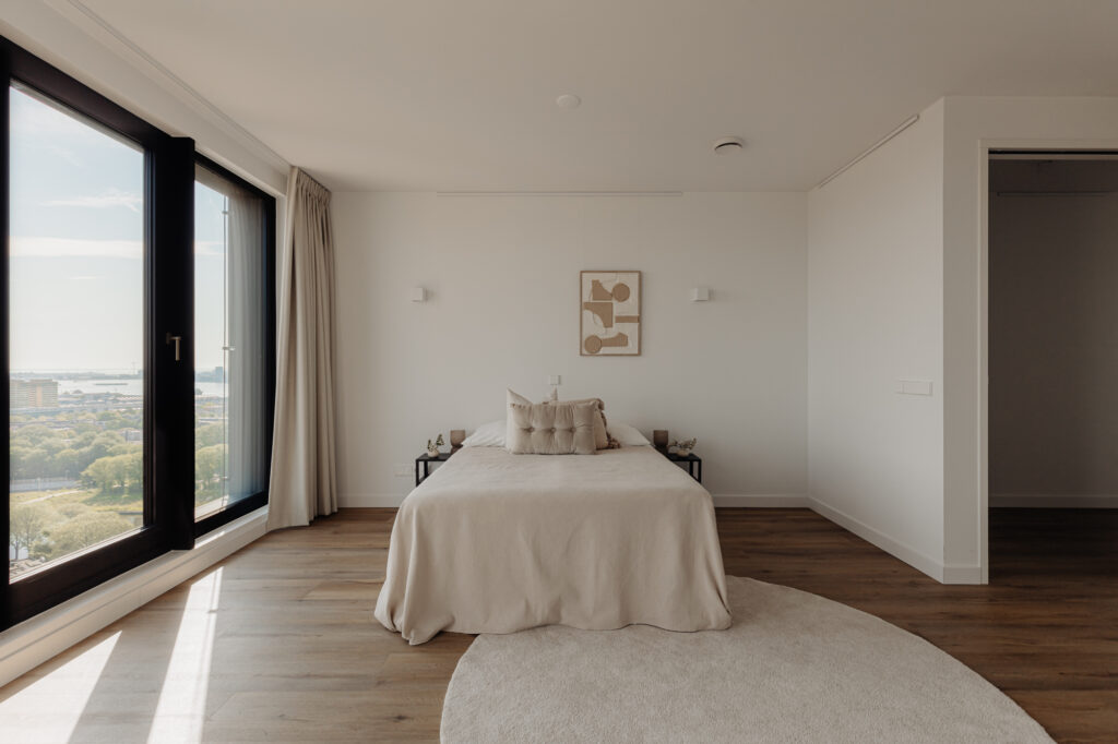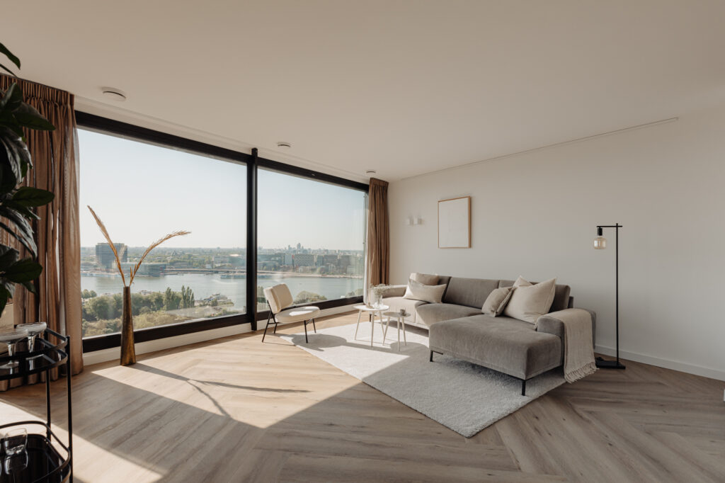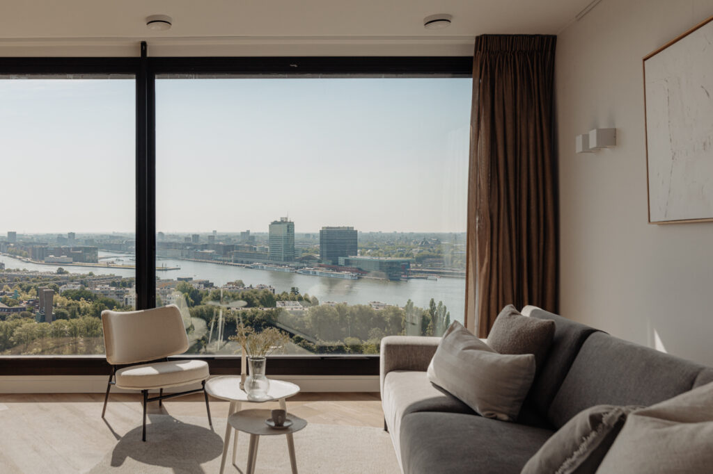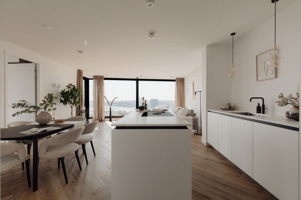 “Wonen in een levend schilderij” zou de slogan van deze woning kunnen zijn. De grote raampartijen in de woonkamer, die van vloer tot plafond en bijna 5,5 meter breed zijn, bieden een prachtig uitzicht over de binnenstad. Door de wisseling van de seizoenen en het uitzicht over het IJ is het uitzicht elke dag anders. Het uitzicht vanaf de 21e verdieping zal nooit vervelen. Het is een hele fijne ruimte om te verblijven. De strak gestucte plafonds en de luxe keuken van Poggenpohl maken de sfeer in het appartement compleet. Luxe en beleving komen hier samen. De keuken met kookeiland is voorzien van diverse inbouwapparatuur, zoals een Bora-kookplaat, vaatwasser, Quooker, Miele-stoomoven en koel-/vriescombinatie. In de gehele woning ligt een hoogwaardige laminaatvloer in visgraatmotief. De ruim opgezette entreehal geeft toegang tot het gastentoilet, de interne berging, de tweede (kleinere) badkamer en de hoofdslaapkamer. De woonkamer geeft toegang tot de overige twee slaapkamers.