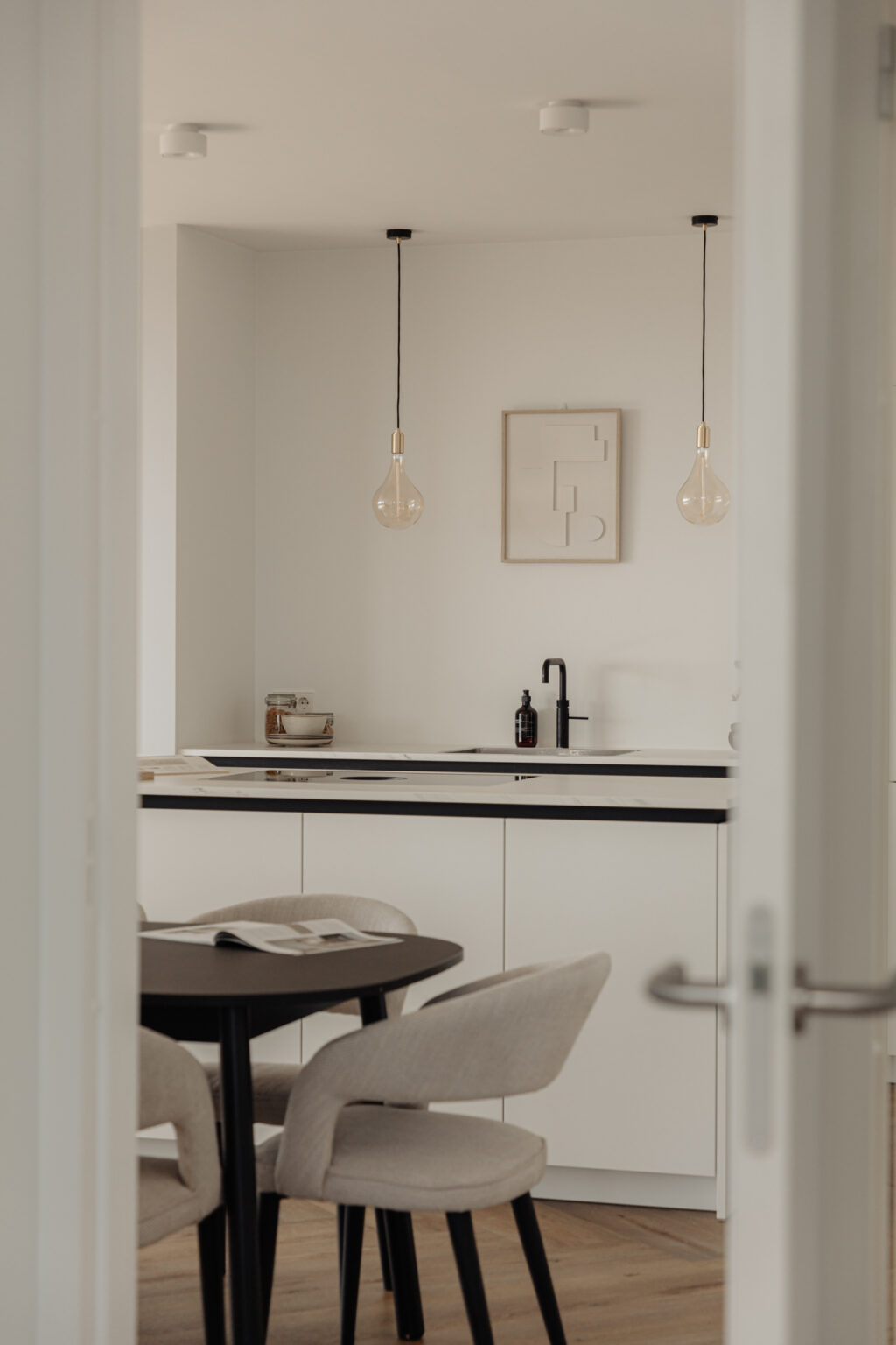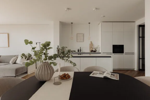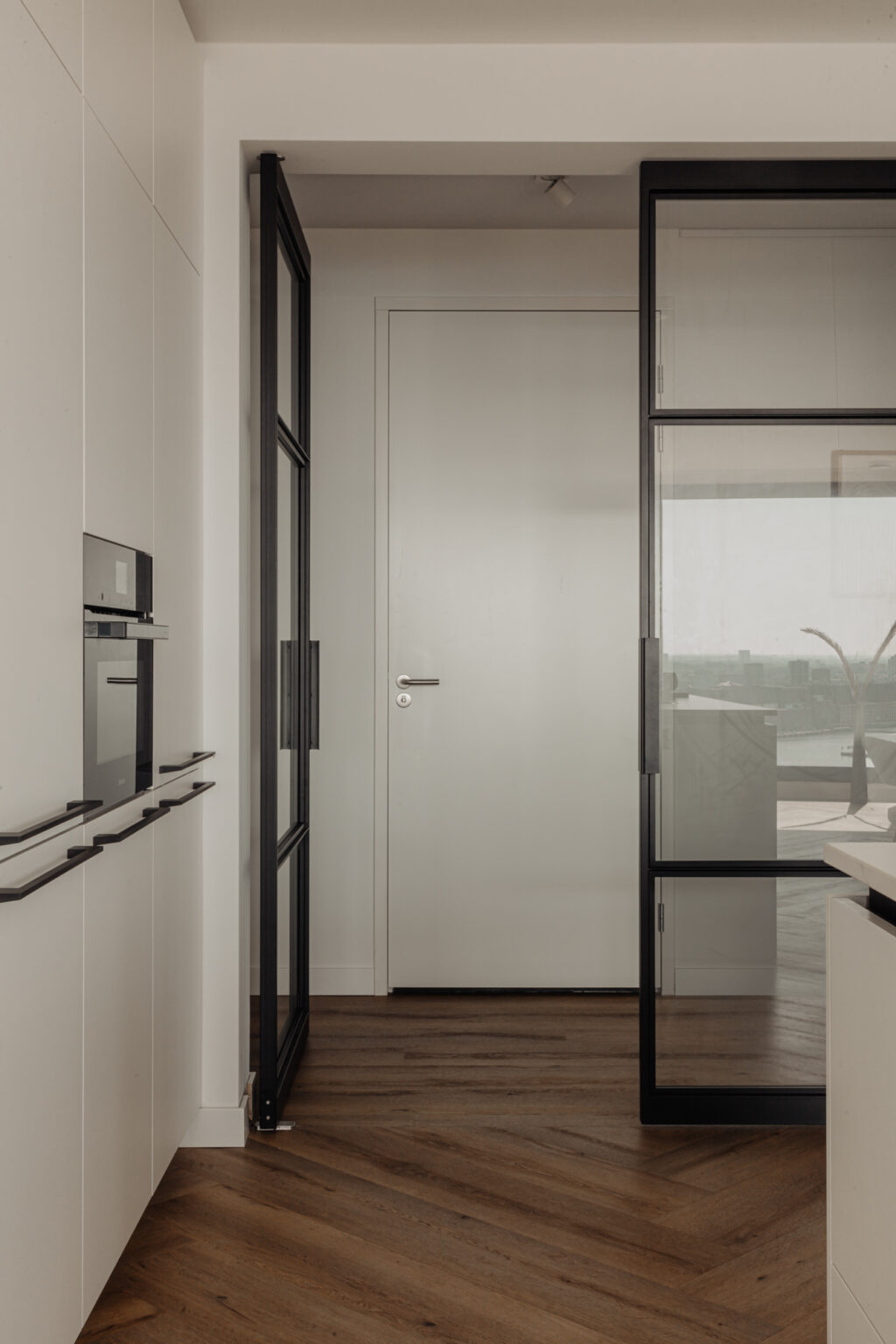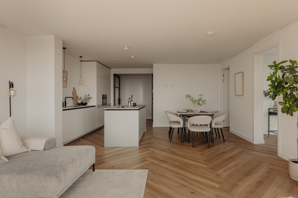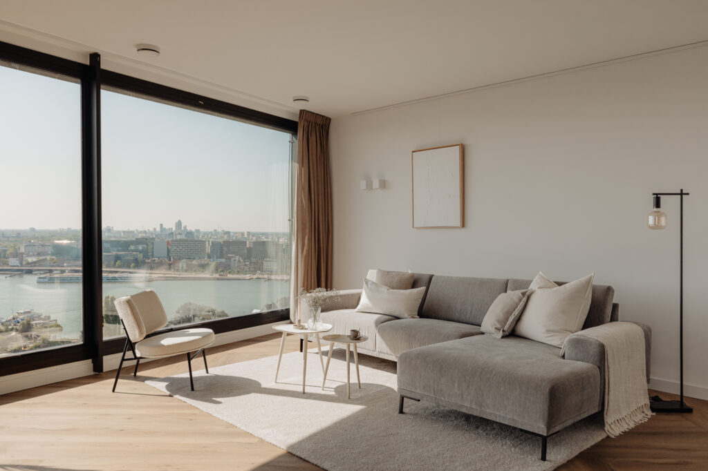 “Wonen in een levend schilderij” zou de slogan van deze woning kunnen zijn. De grote raampartijen in de woonkamer, die van vloer tot plafond en bijna 5,5 meter breed zijn, bieden een prachtig uitzicht over de binnenstad. Door de wisseling van de seizoenen en het uitzicht over het IJ is het uitzicht elke dag anders. Het uitzicht vanaf de 21e verdieping zal nooit vervelen. Het is een hele fijne ruimte om te verblijven. De strak gestucte plafonds en de luxe keuken van Poggenpohl maken de sfeer in het appartement compleet. Luxe en beleving komen hier samen. De keuken met kookeiland is voorzien van diverse inbouwapparatuur, zoals een Bora-kookplaat, vaatwasser, Quooker, Miele-stoomoven en koel-/vriescombinatie. In de gehele woning ligt een hoogwaardige laminaatvloer in visgraatmotief. De ruim opgezette entreehal geeft toegang tot het gastentoilet, de interne berging, de tweede (kleinere) badkamer en de hoofdslaapkamer. De woonkamer geeft toegang tot de overige twee slaapkamers.