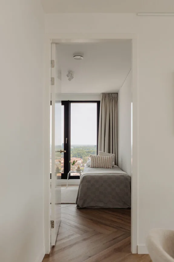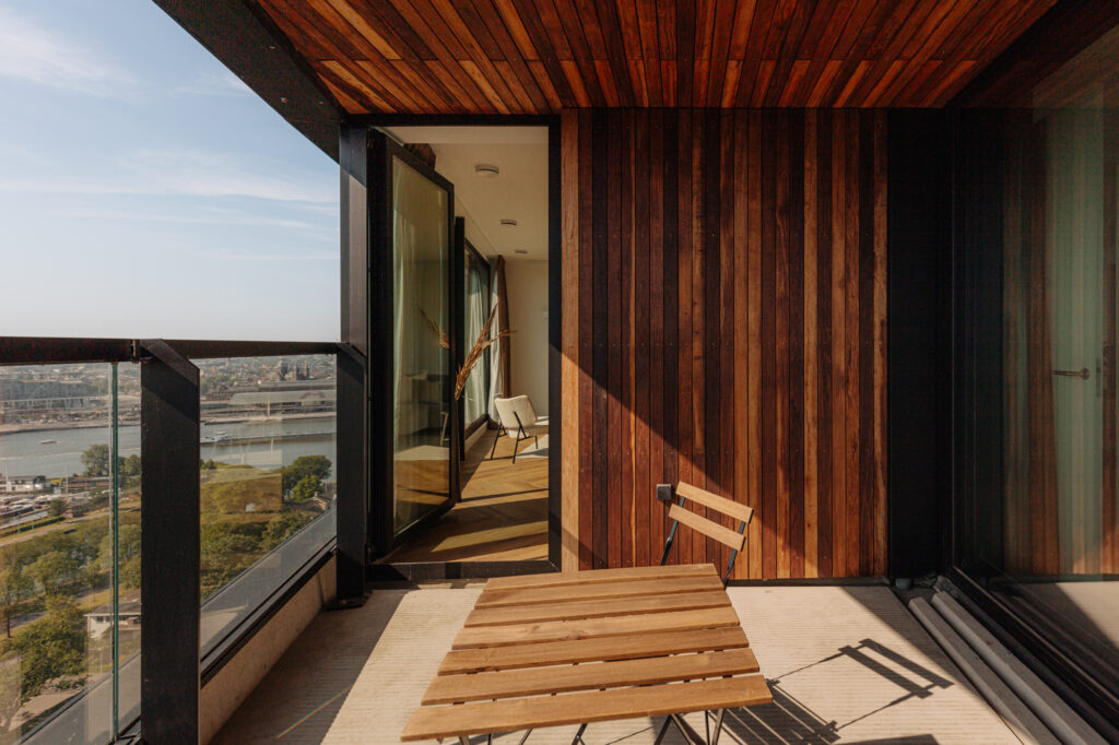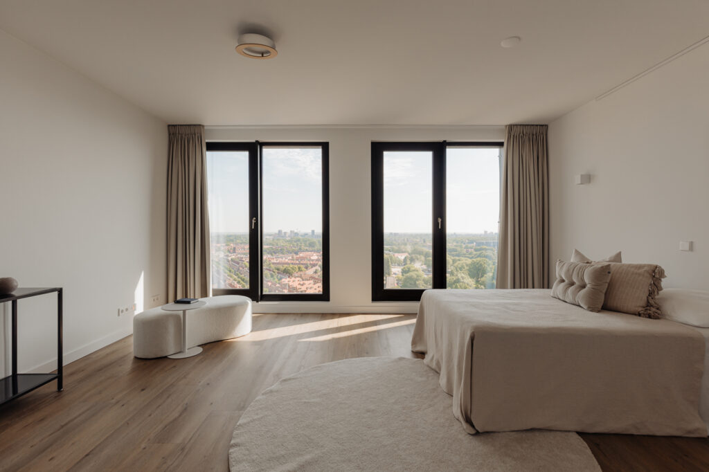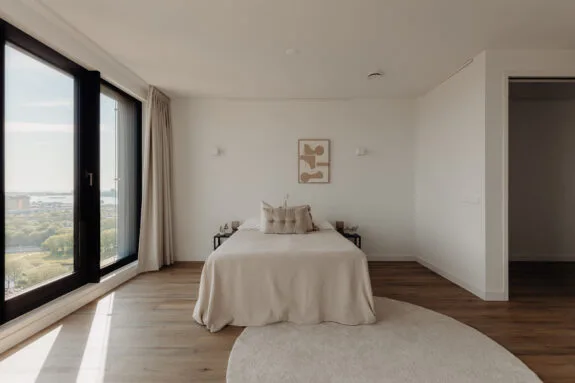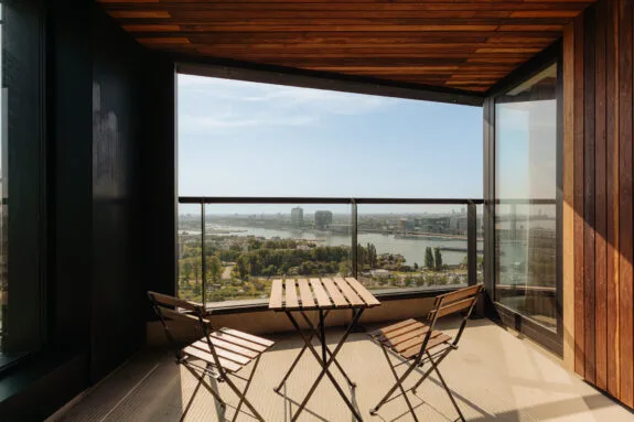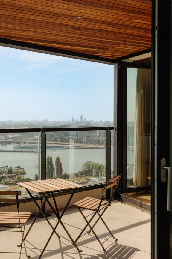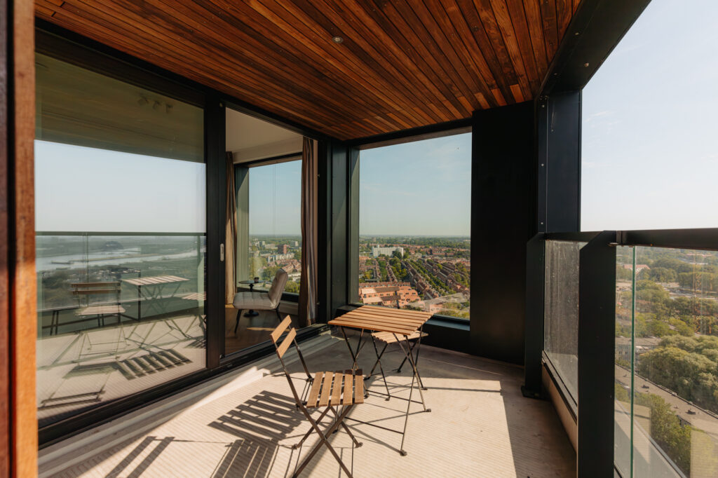 Lekker buiten in de zon zitten, dat kan hier perfect. Het terras van circa 9 m² is gelegen op het zonnige zuiden en is te bereiken via een van de slaapkamers en de woonkamer. De inpandige ligging zorgt ervoor dat er al vroeg in het jaar genoten kan worden van een spectaculair uitzicht vanaf de 21e verdieping, met vrij uitzicht over de binnenstad. Een heerlijke plek om te genieten van de rust en de dynamiek van de stad even te vergeten.