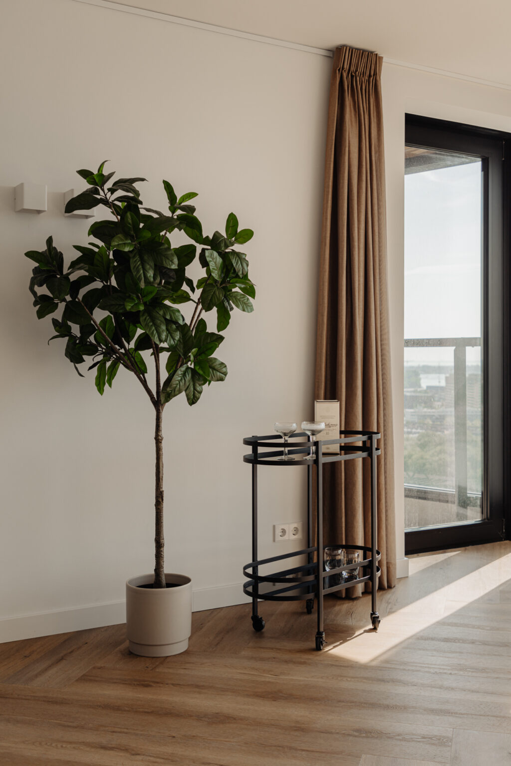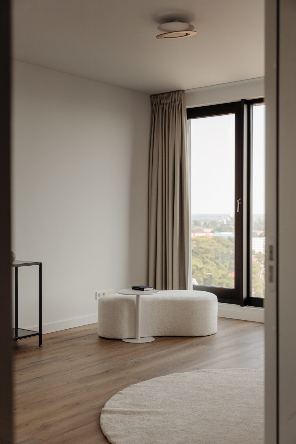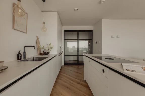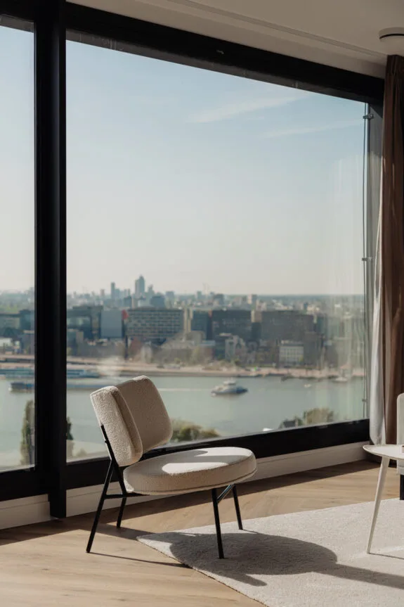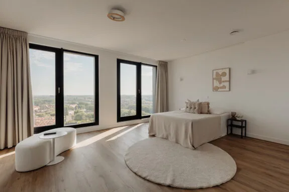 Lekker buiten in de zon zitten, dat kan hier perfect. Het terras van circa 9 m² is gelegen op het zonnige zuiden en is te bereiken via een van de slaapkamers en de woonkamer. De inpandige ligging zorgt ervoor dat er al vroeg in het jaar genoten kan worden van een spectaculair uitzicht vanaf de 21e verdieping, met vrij uitzicht over de binnenstad. Een heerlijke plek om te genieten van de rust en de dynamiek van de stad even te vergeten.