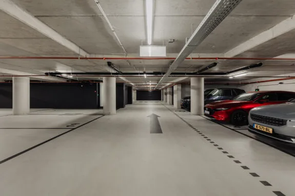 De afgesloten parkeergarage is vanaf de Badhuiskade te bereiken en voorzien van een elektrisch bedienbaar toegangspoort dat op afstand kan worden geopend. Bij thuiskomst openen de deuren automatisch en rijd je zo naar binnen. Het appartement beschikt over twee parkeerplaatsen in de garage. In de onderbouw op niveau -2 bevindt zich de extra brede parkeerplaats (5,44 x 5,34 meter), uitgerust met een elektrische laadpaal. Deze parkeerplaats (nummer 33) wordt apart aangeboden voor € 50.000,- kosten koper. De tweede parkeerplaats (nummer 101) is inbegrepen in de vraagprijs.