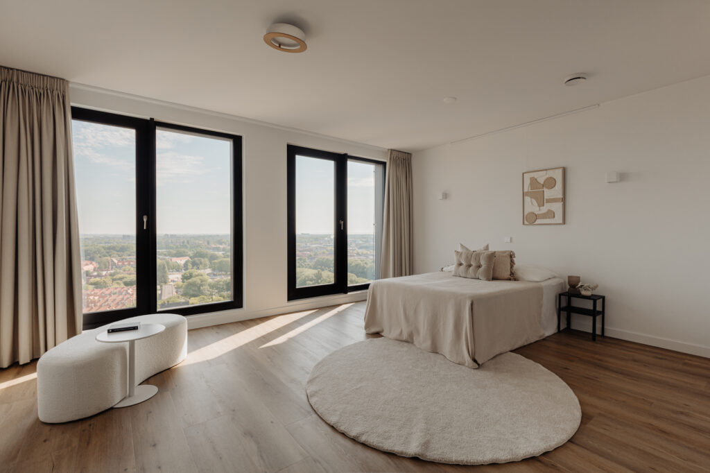 Deze woning biedt een prachtig uitzicht op de binnenstad vanuit de woonkamer en het terras op de 21e verdieping. De woonkamer heeft grote ramen, strak gestucte plafonds en een luxe keuken. De keuken is uitgerust met hoogwaardige inbouwapparatuur van onder andere Miele. Er zijn drie slaapkamers, waarvan de hoofdslaapkamer een luxe en-suite badkamer heeft met een ligbad, inloopdouche en dubbele wastafel. Een van de twee kleinere slaapkamers heeft middels een schuifpui toegang tot het terras. De tweede badkamer is bereikbaar vanuit de hal en beschikt eveneens over een inloopdouche. Het appartement wordt aangeboden inclusief één parkeerplaats (nummer 101). De tweede parkeerplaats (nummer 33) met elektrische laadpaal in de garage en de berging zijn beschikbaar tegen extra kosten (zie bijzonderheden).