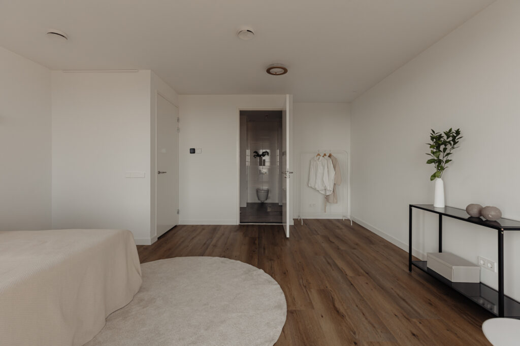 De hoofdslaapkamer is te bereiken via de hal en is zeer ruim opgezet. De slaapkamer is comfortabel en biedt voldoende ruimte voor een kingsize bed en een kastenwand. Tevens beschikt deze slaapkamer over een luxe eigen badkamer en suite, die is voorzien van een ligbad, zwevend toilet, inloopdouche, designradiator en dubbel wastafelmeubel. De twee overige slaapkamers zijn te bereiken vanuit de woonkamer, zijn wat kleiner van formaat en kunnen multifunctioneel worden gebruikt, zoals als gasten-, werk-, of kinderkamer. De tweede badkamer, te bereiken via de hal, is voorzien van een inloopdouche, wastafelmeubel en designradiator.
