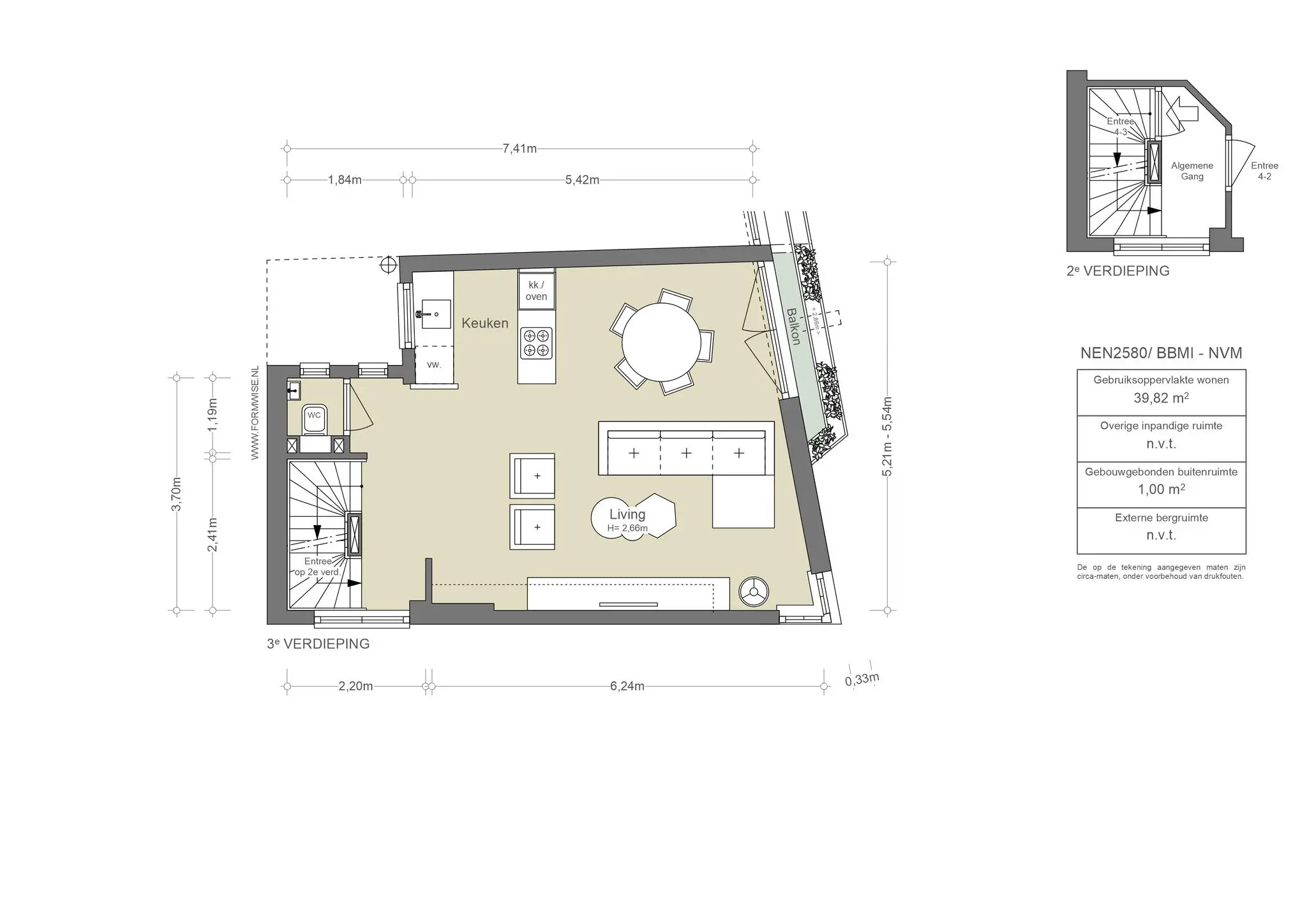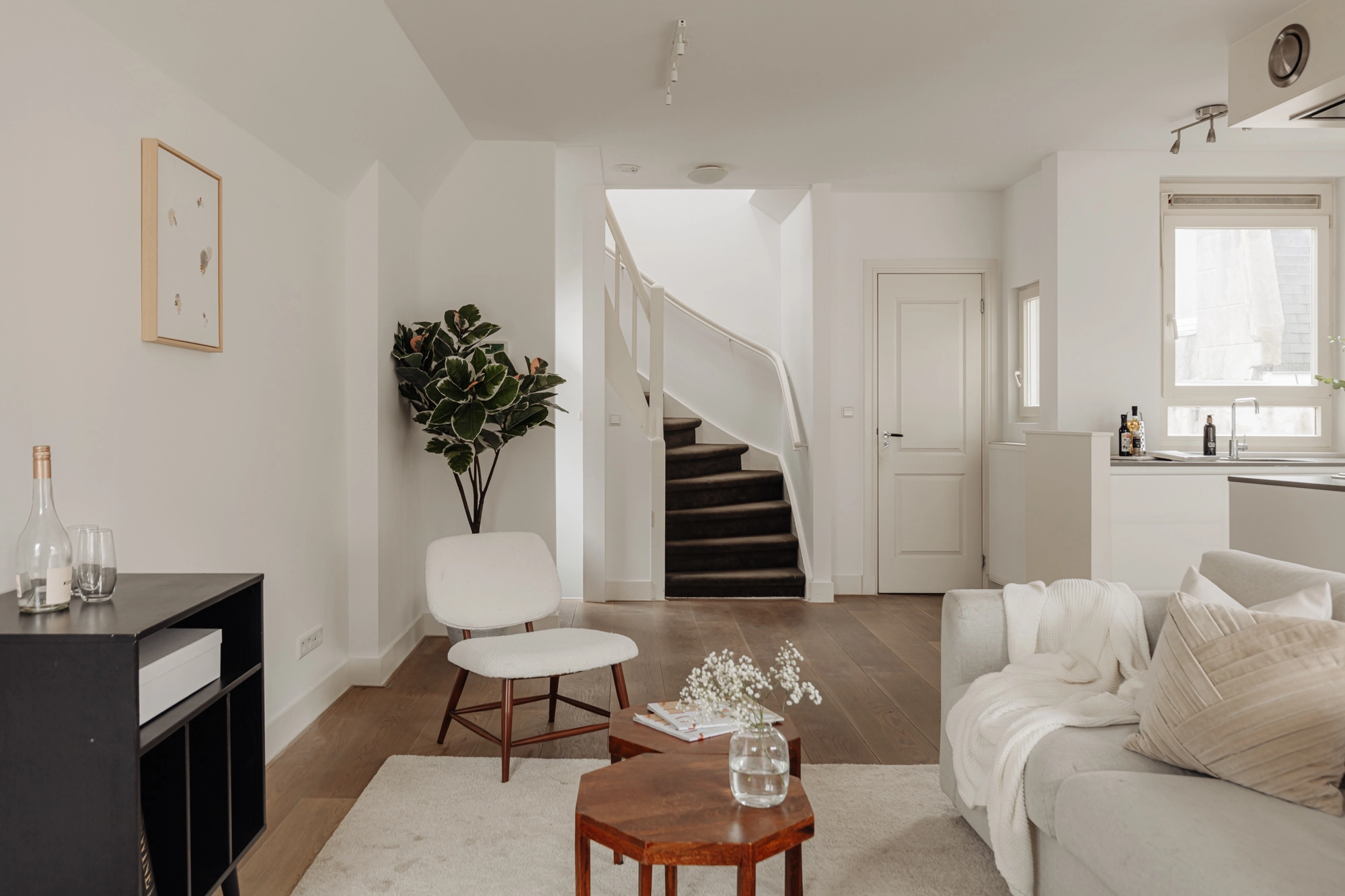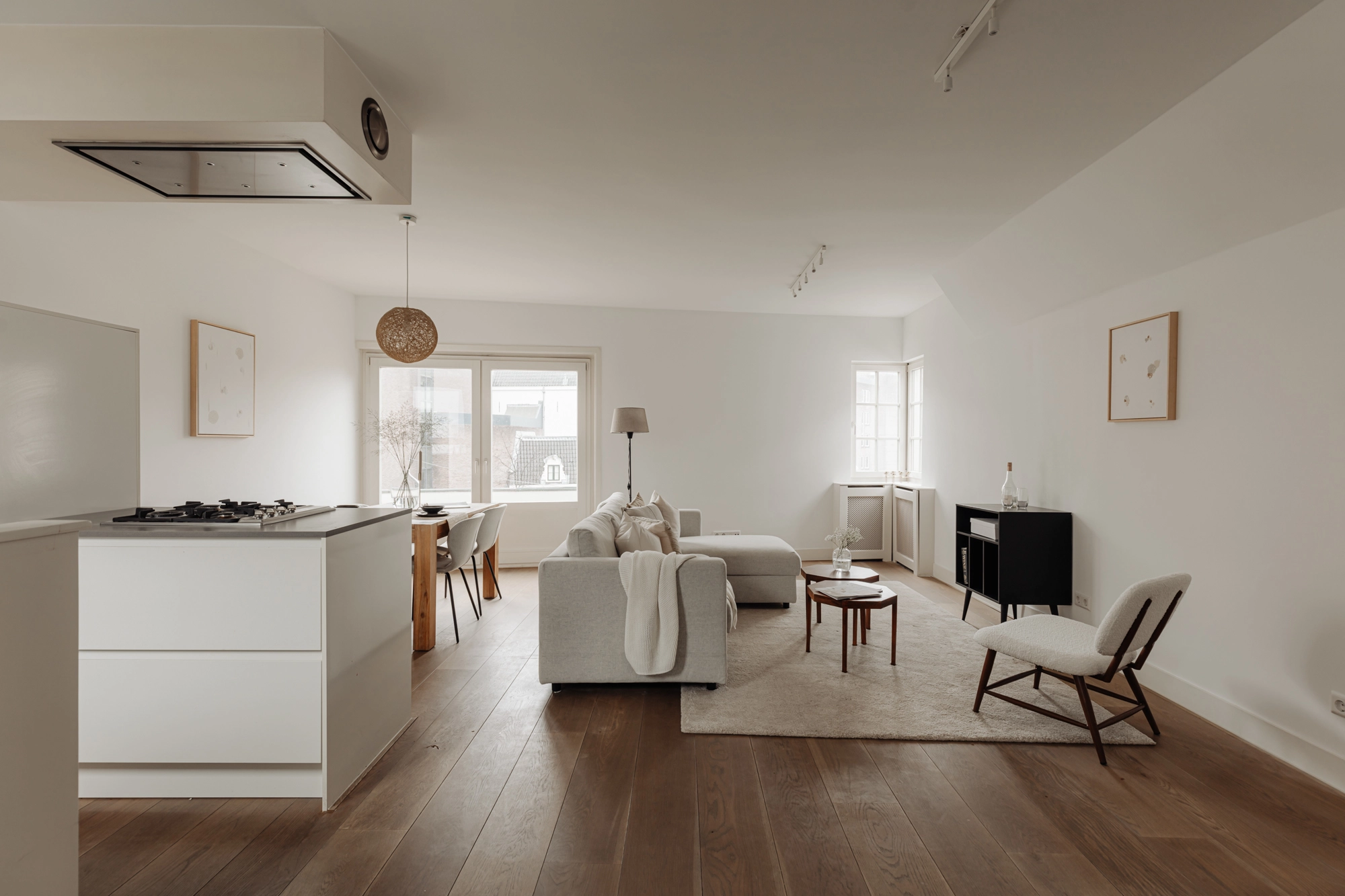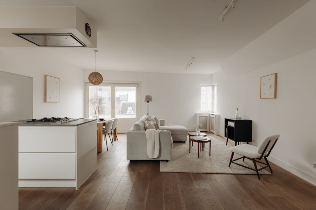 Middels de afgesloten entree op de tweede verdieping wordt het appartement, gesitueerd op de bovenste twee verdiepingen, bereikt. De woonkamer is ruim opgezet met ruimte voor een riante zithoek en een eettafel. De open keuken met kookeiland vormt het hart van het appartement. De keuken is voorzien van diverse inbouwapparatuur. De opzet van de woon- en eetkamer nodigt uit tot gezellige avonden met vrienden en familie. Mede door de grote raampartijen is er aan drie zijden natuurlijke daglichttoetreding, waardoor de woonkamer en zeer plezierige ruimte is om te verblijven. De robuuste houten vloer maakt de sfeer in de woning compleet.