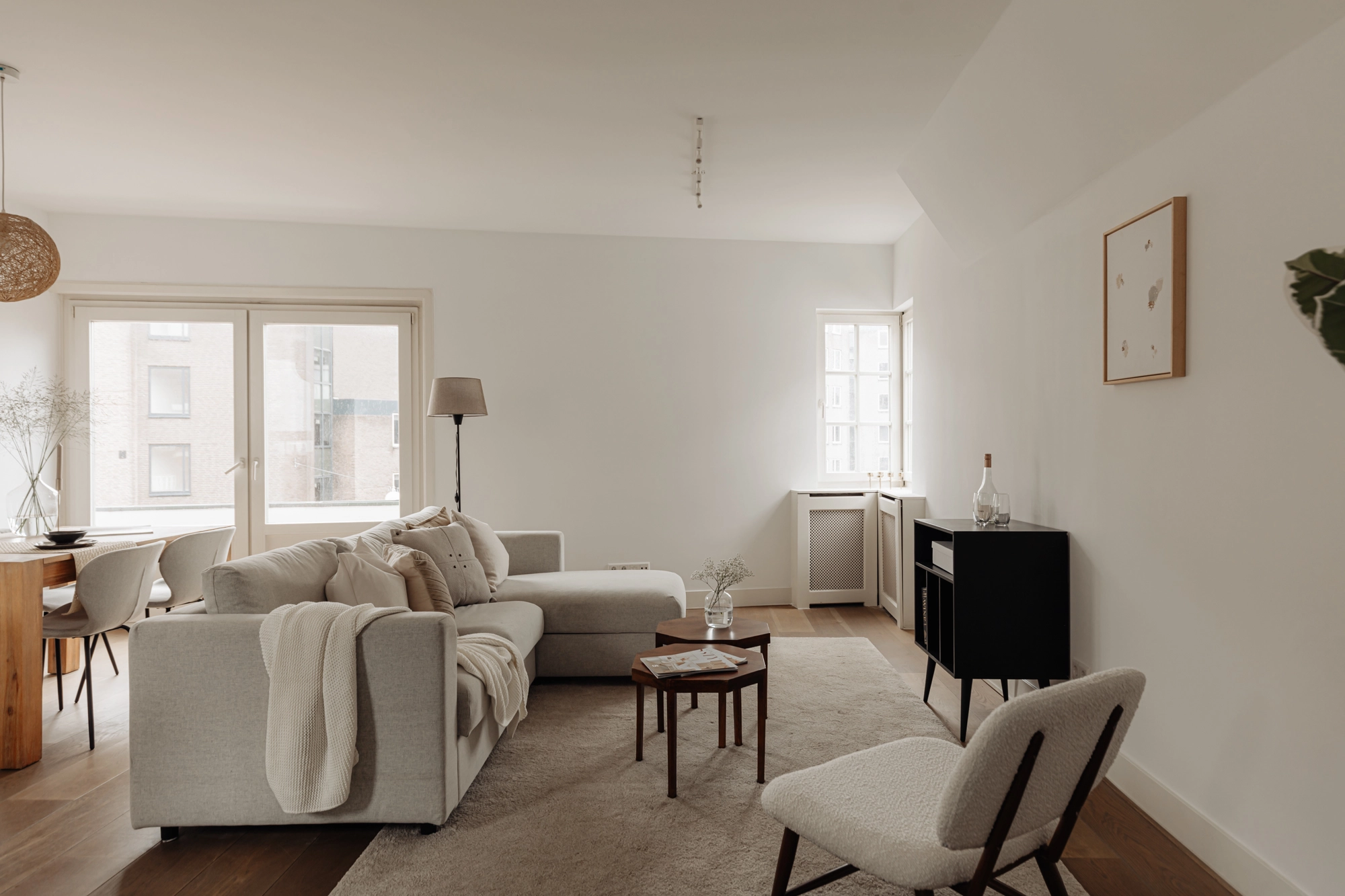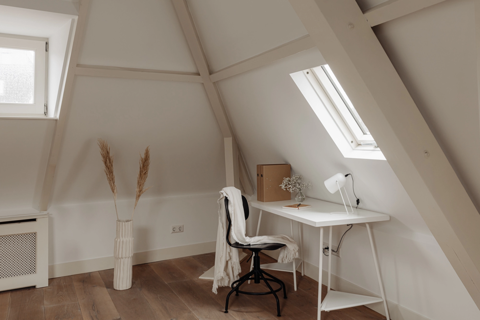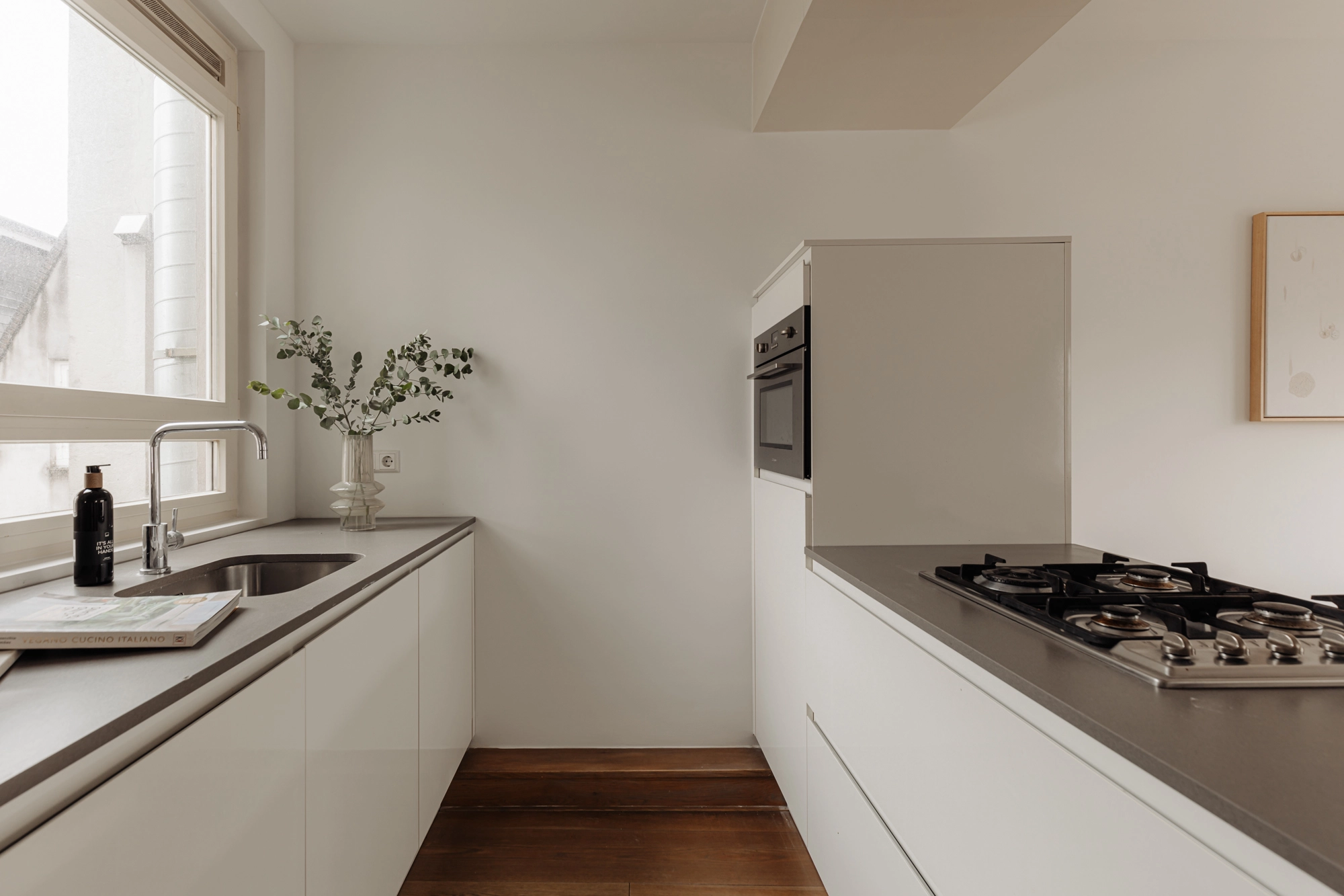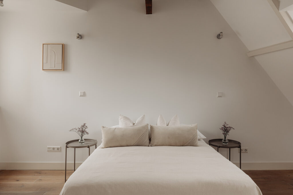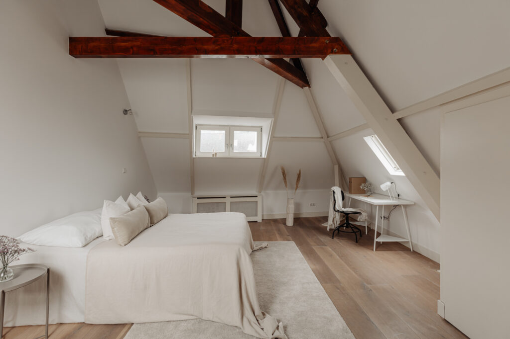 Dit appartement, gelegen op de bovenste twee verdiepingen, kenmerkt zich door een ruime woonkamer met een open keuken voorzien van inbouwapparatuur en een groot kookeiland, ideaal voor gezellige avonden. De slaapkamer beslaat de volledige bovenste verdieping, inclusief een moderne badkamer en suite en extra bergruimte onder de unieke kapconstructie. Er is een optie voor het creëren van een tweede werk-/kinderkamer. Een Frans balkon biedt een intieme buitenruimte met panoramisch uitzicht over de oude binnenstad en is perfect voor het genieten van de ochtendzon.