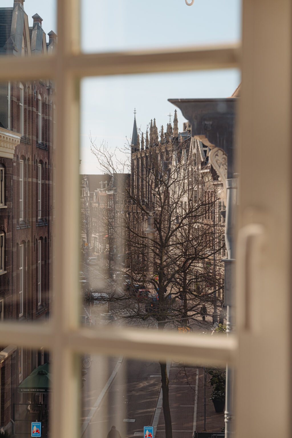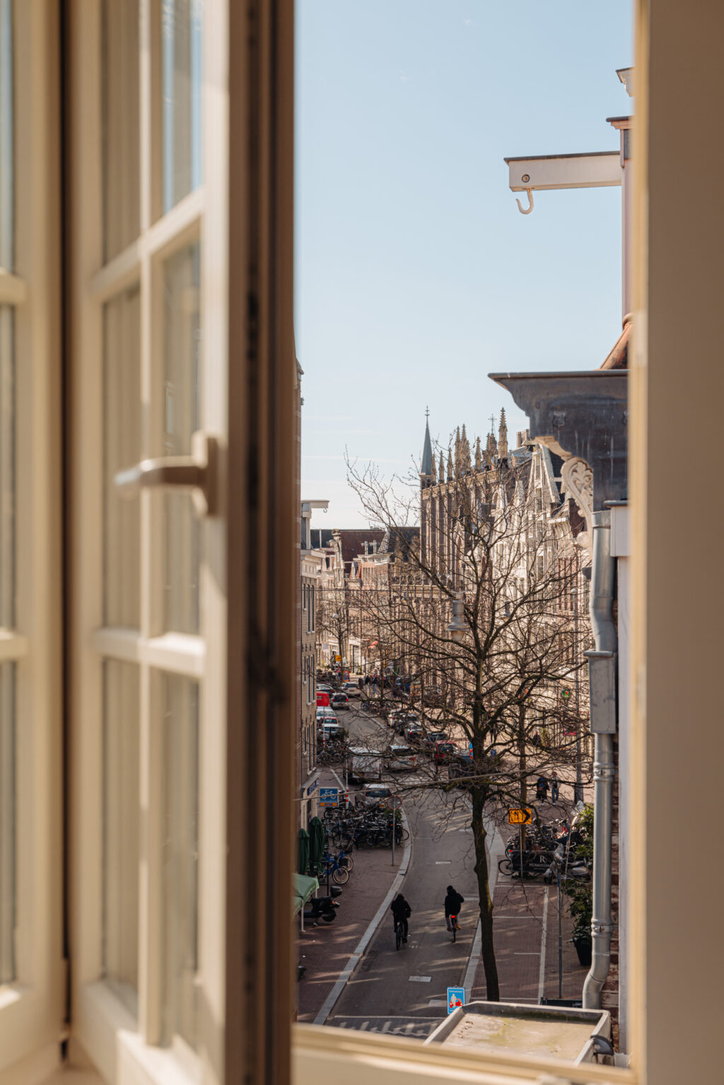Het Franse balkon, gelegen op het oosten, biedt een intieme buitenruimte waar heerlijk genoten kan worden van de rustige ochtenduren en de opkomende zon. Uniek is het panoramisch uitzicht over de oude binnenstad richting Amsterdam Centraal, Spuistraat en de Nieuwezijds Voorburgwal.