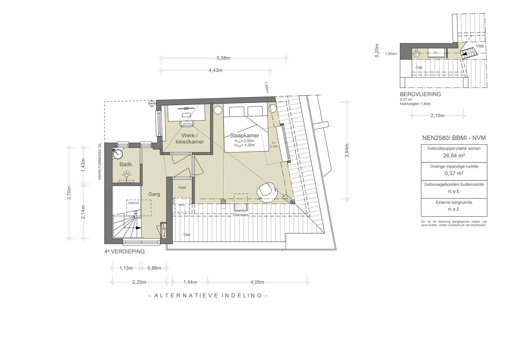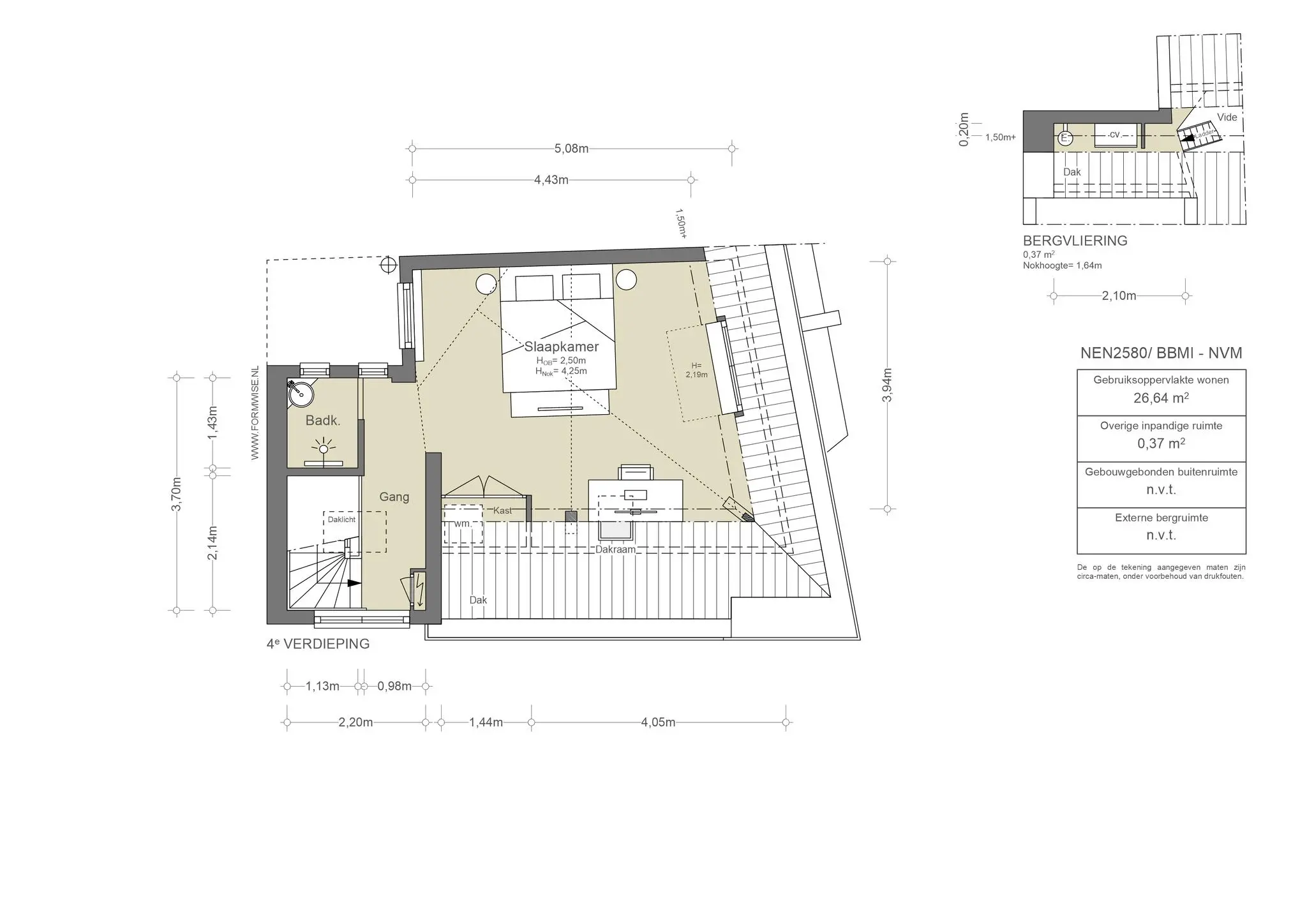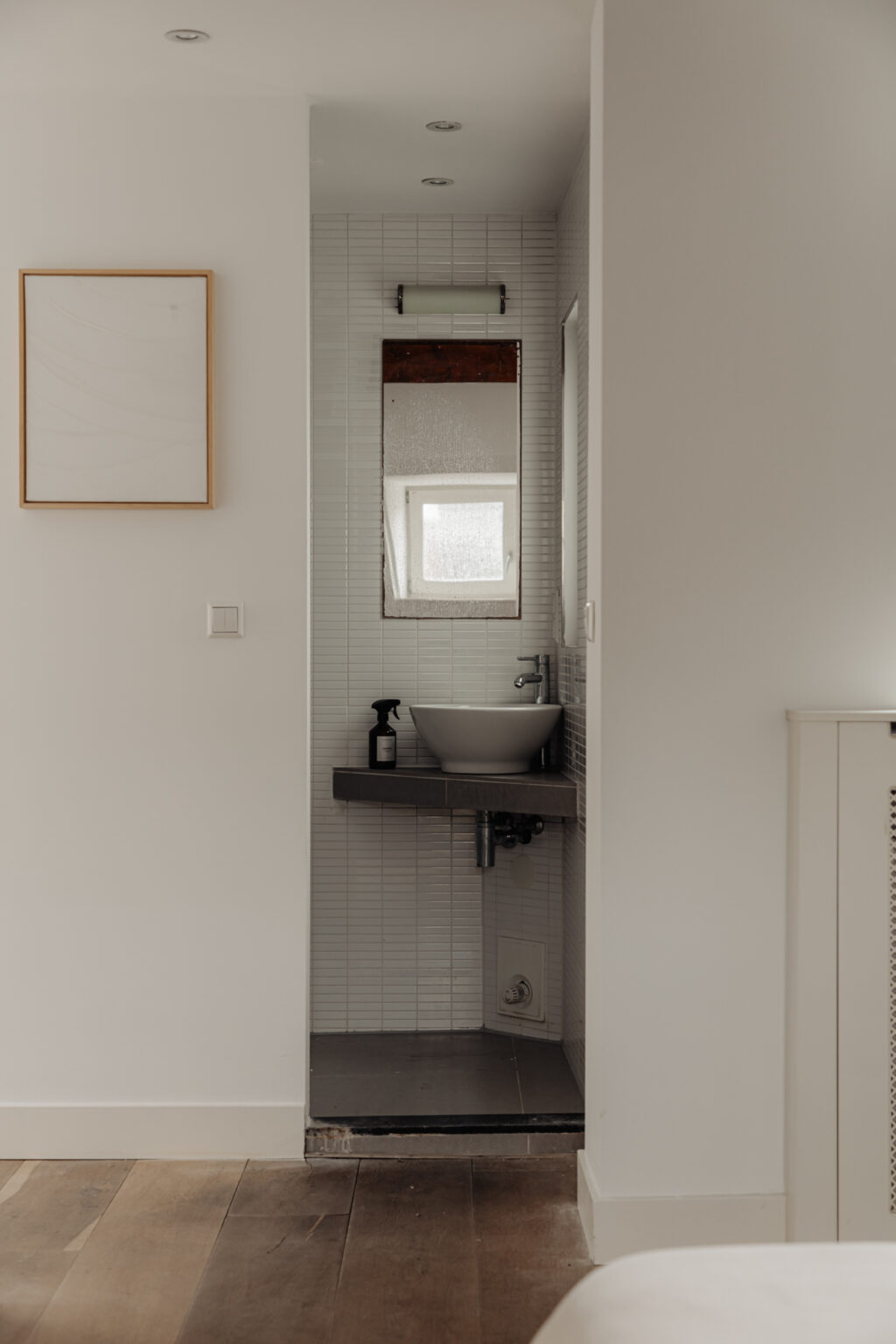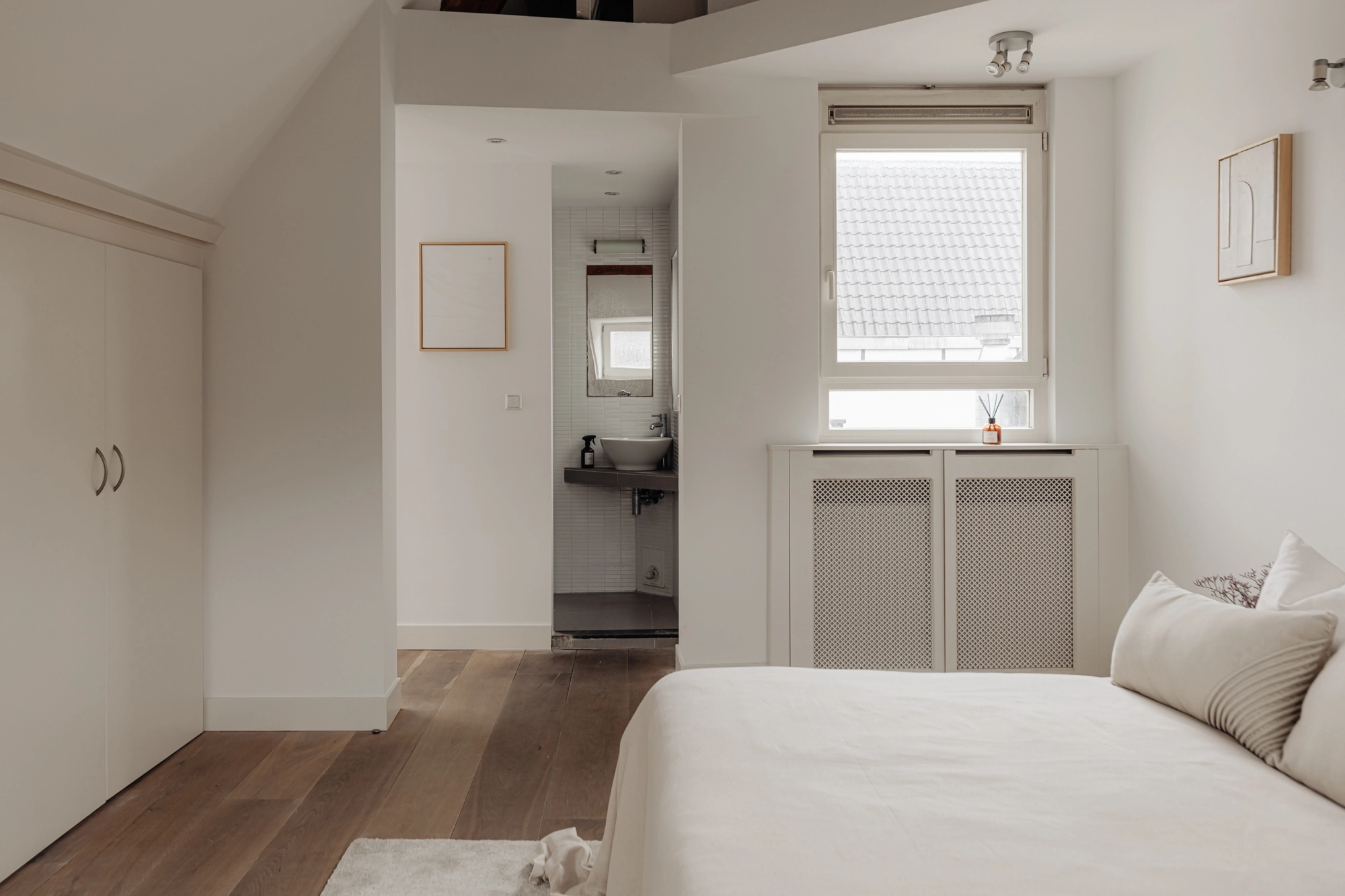 De slaapkamer is gesitueerd op de volledige vierde verdieping en biedt voldoende ruimte voor een kingsize bed en een grote kledingkast. De badkamer en-suite is voorzien van een moderne inloopdouche en wastafel. De entresol, waar de cv ketel zich bevindt, voorziet in extra bergruimte. De mooie kapconstructie geven deze kamer een unieke sfeer en hoogte.