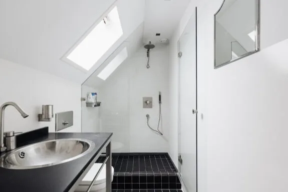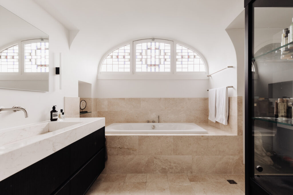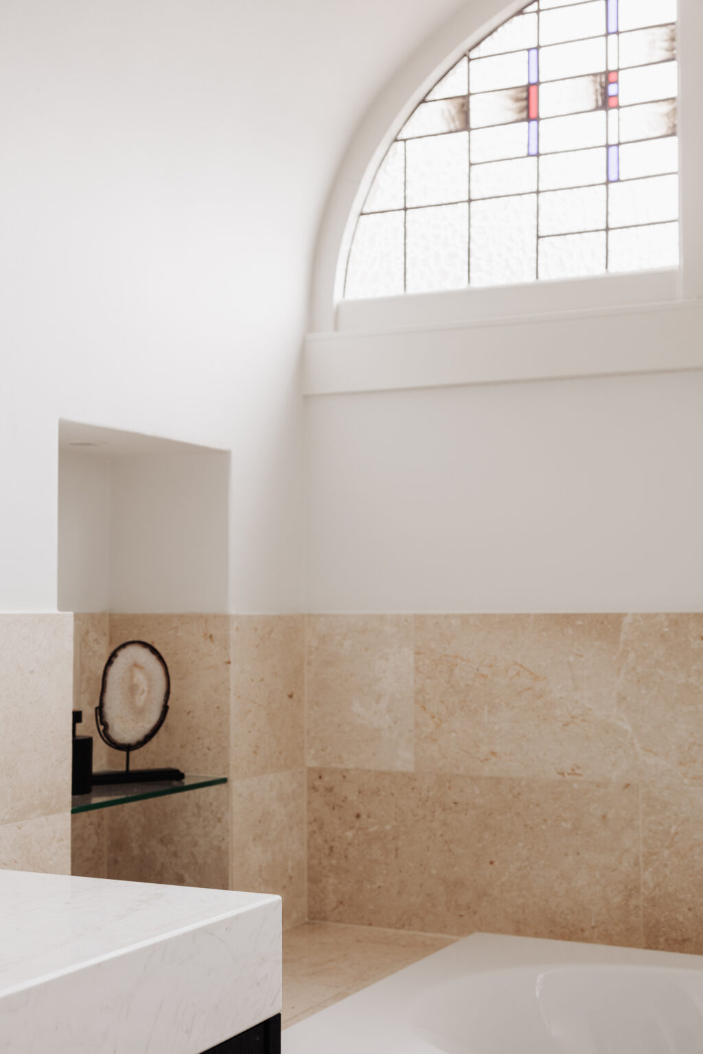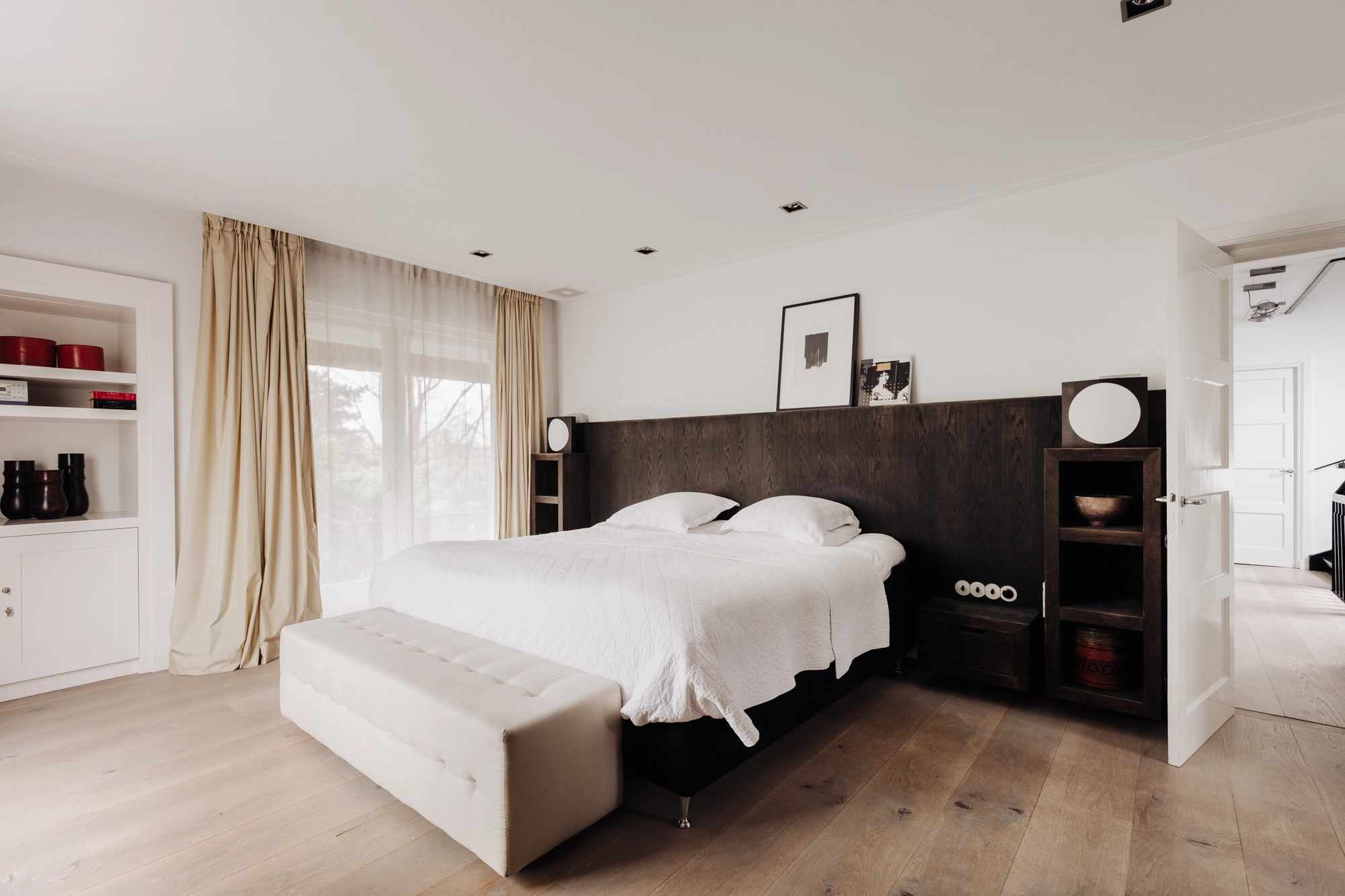 De hoofdslaapkamer heeft een ligging aan de achterzijde van het huis met een balkon en is voorzien van een elegante privé badkamer met natuurstenen ligbad, ruime douche, wastafelmeubel en een vaste kast.