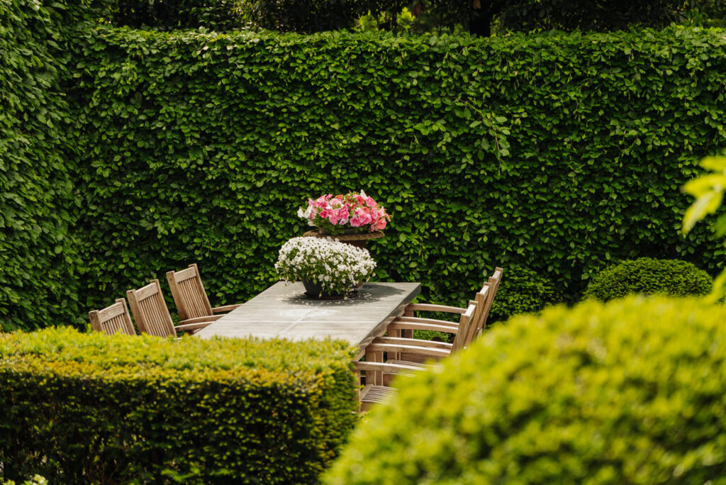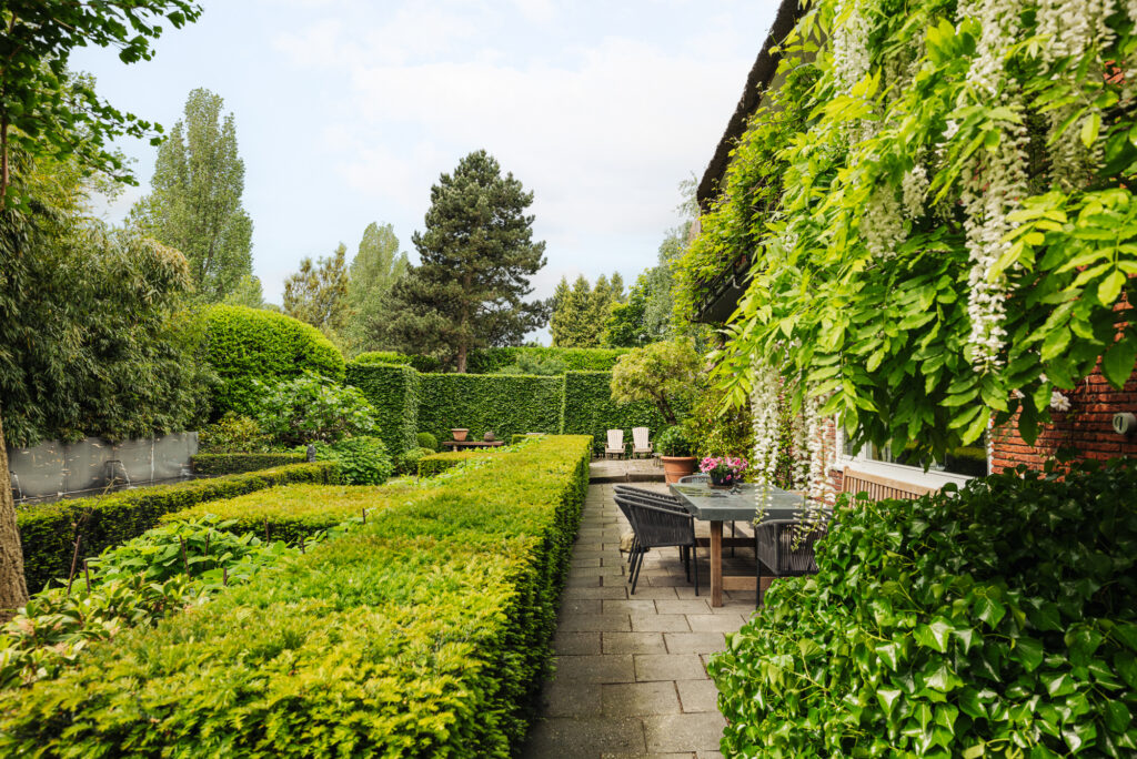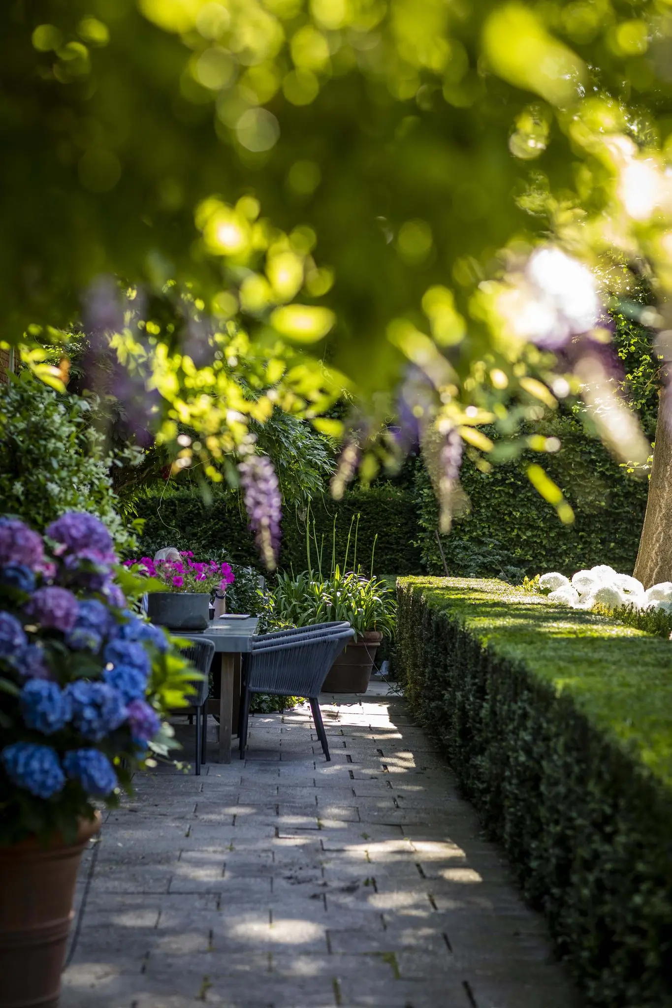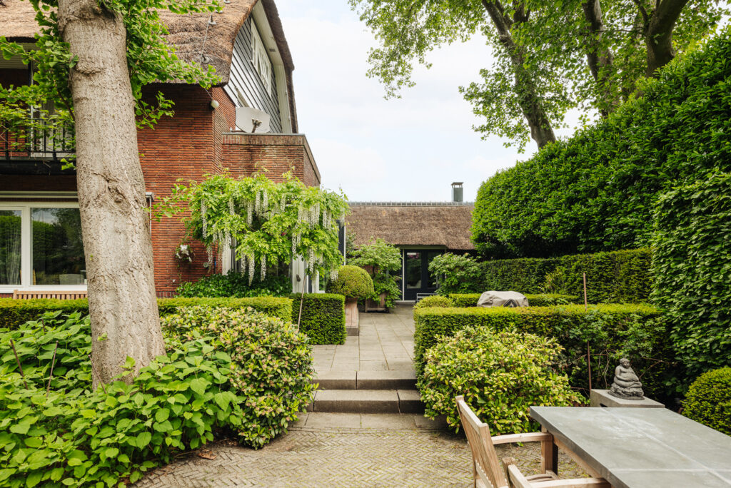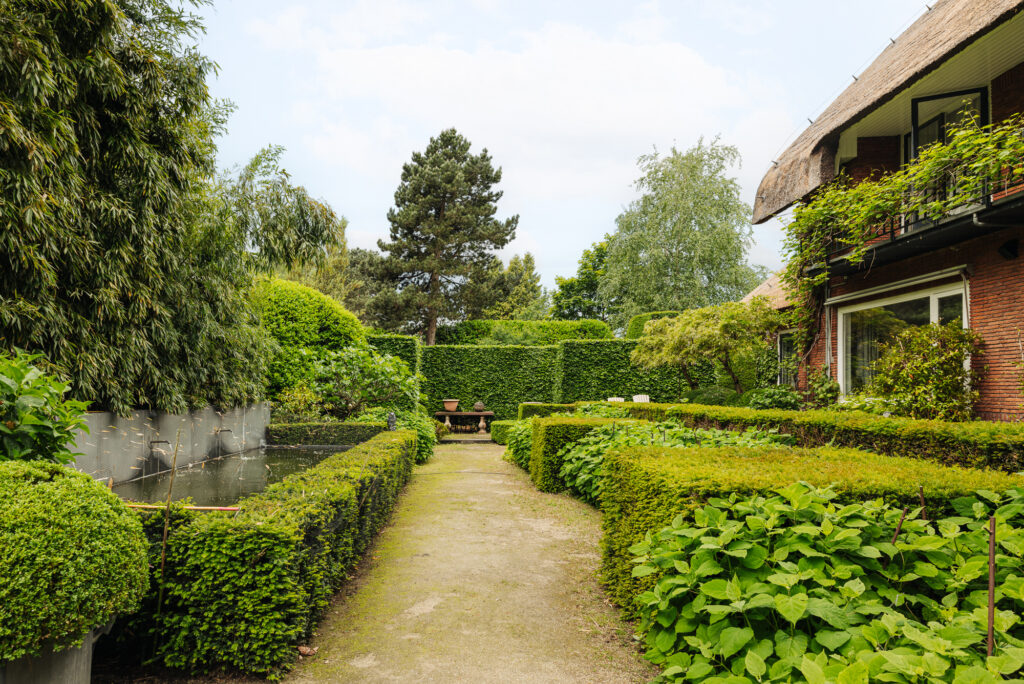 De tuinarchitect heeft echt de tuin om het huis heen ontworpen. Op verschillende plekken kan men dineren met het hele gezin, of zich even terug trekken met een kop koffie op een zitje in de zon, met zicht op de vijver.