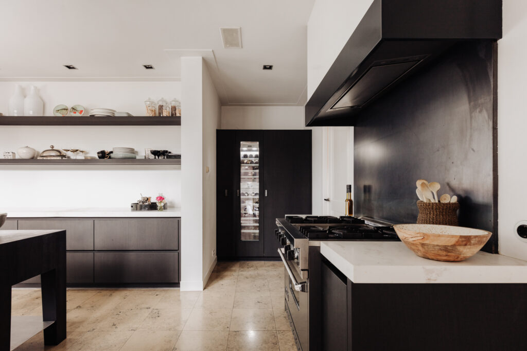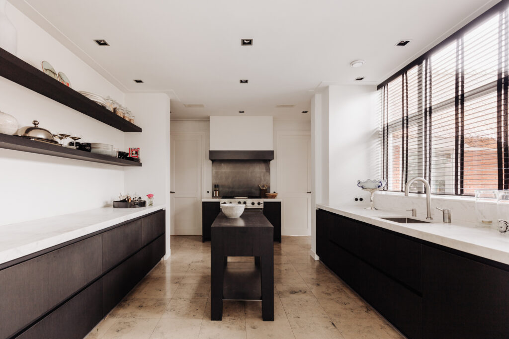 De luxe woonkeuken is naar ontwerp van Piet Boon. Centraal is het groot fornuis en aan beide zijden bevindt zich een wandopstelling met een marmeren aanrecht. In het midden staat een hakblok. Verder is er een grote wijnklimaatkast en diverse luxe inbouwapparatuur. Achter de keuken is er een praktische bijkeuken. Deze wordt gebruikt om voorraden op te slaan en er is een extra aanrecht met spoelbak. Verder een tweede koelkast en extra kastruimte. Hier is ook een extra entreedeur vanuit buiten.