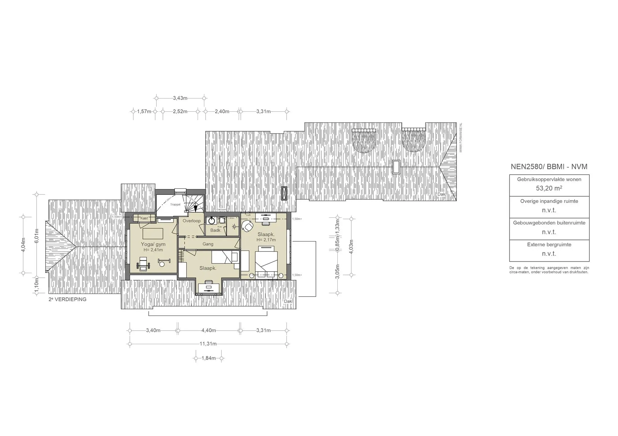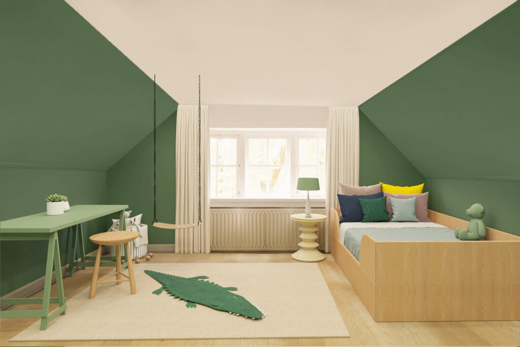 Op de bovenste etage liggen aan de voor-, midden- en achterzijde slaapkamers. Er is een badkamer met een douche, toilet en wastafel. De kamer aan de voorzijde zou ook goed als yoga of gym gebuikt kunnen worden. Van de achterzijde is een impressie gemaakt van een mogelijke kinderkamer.