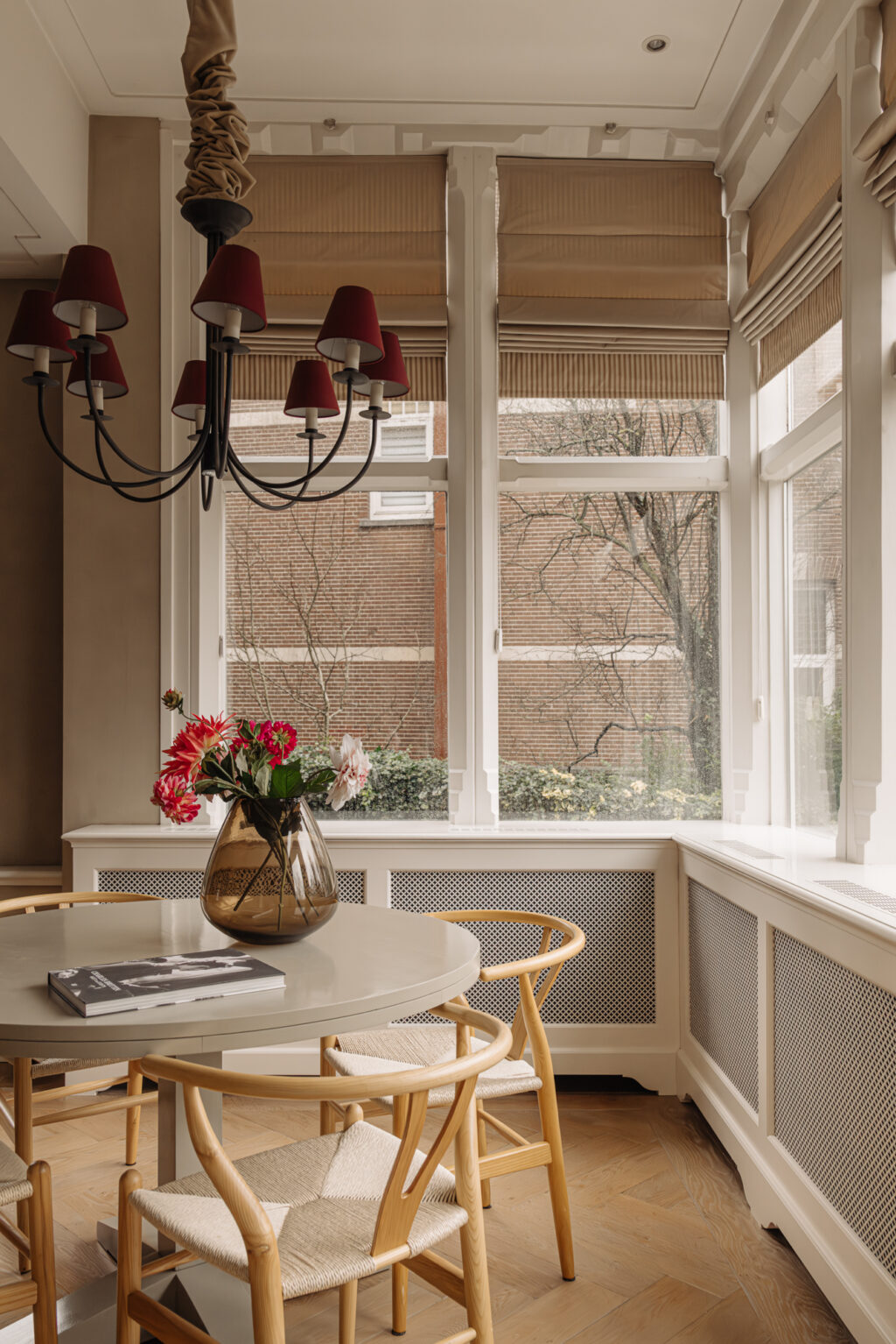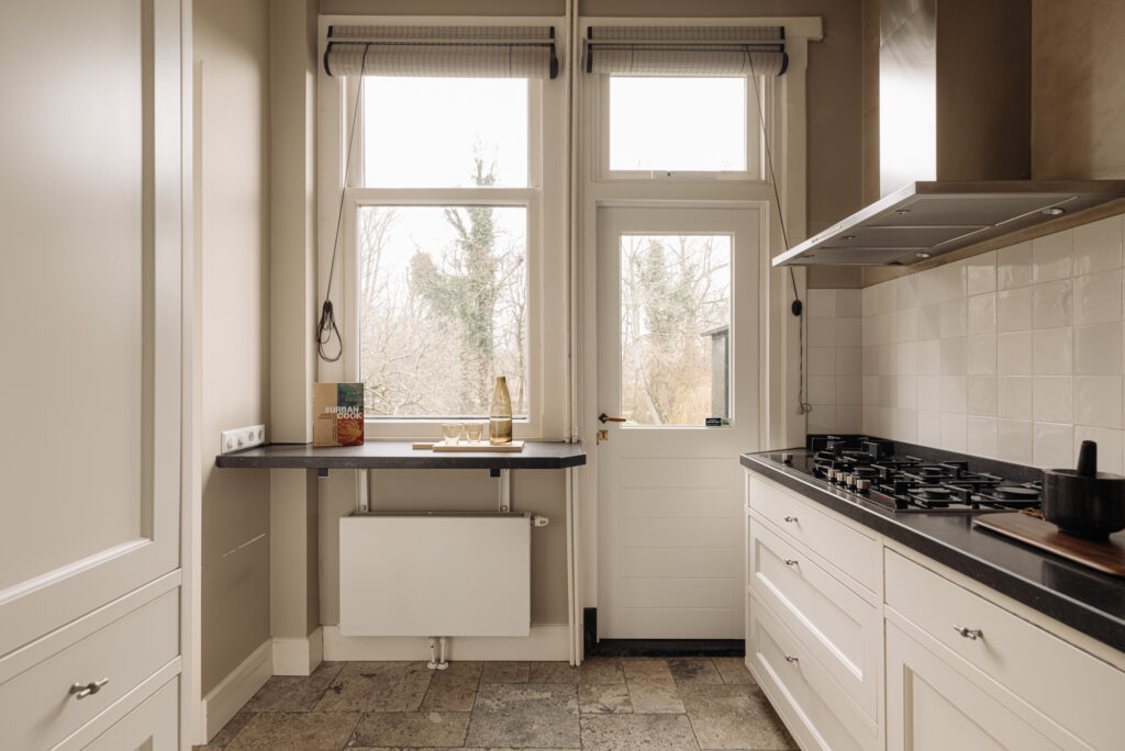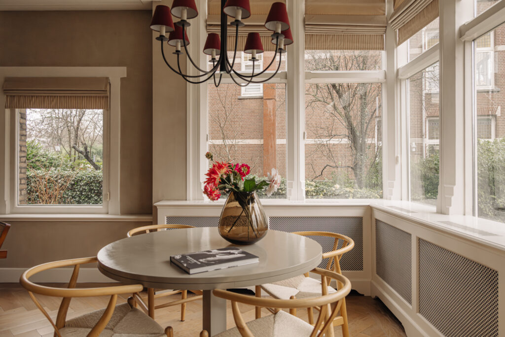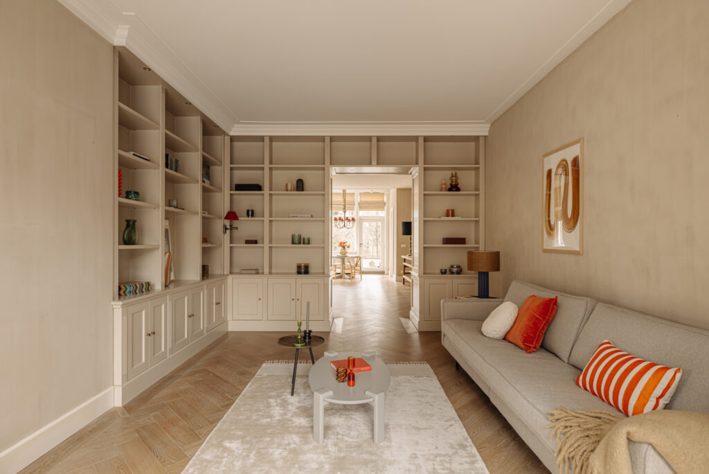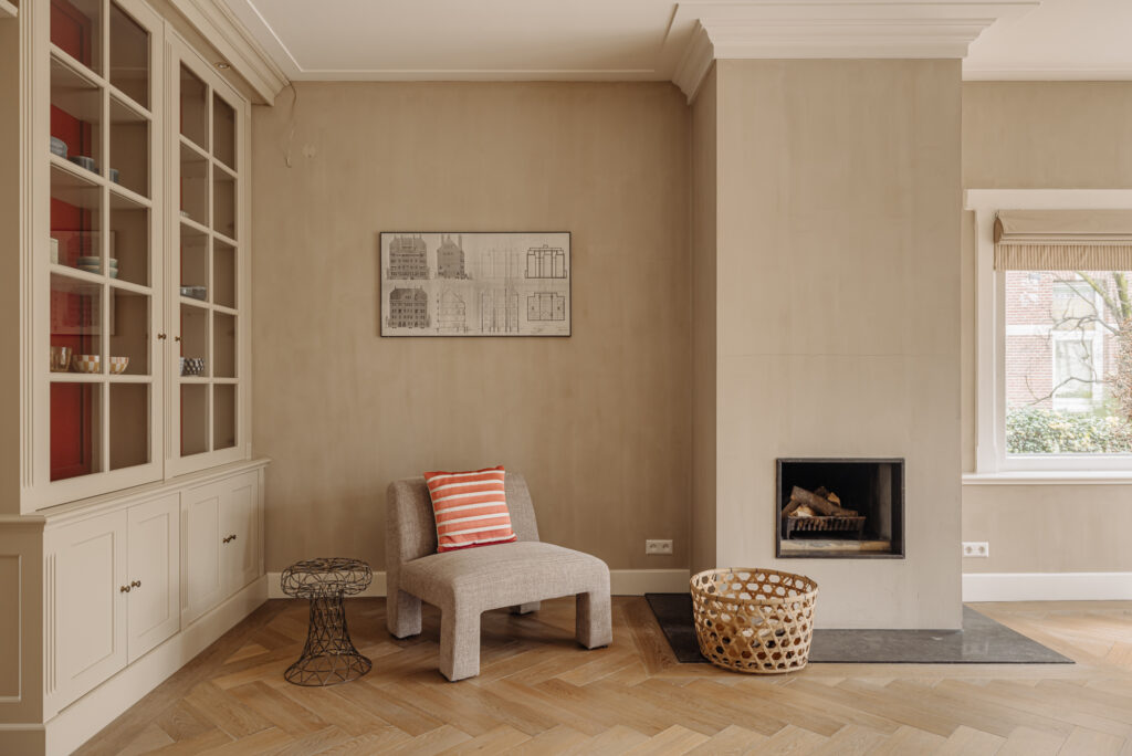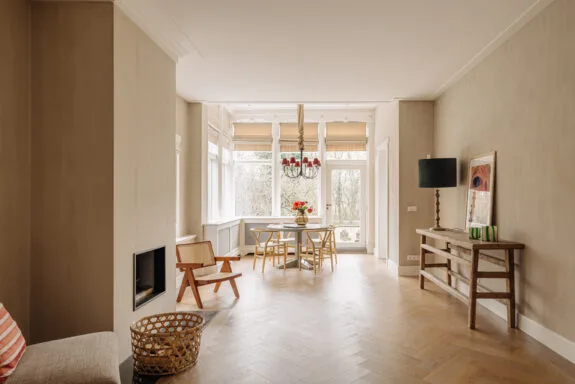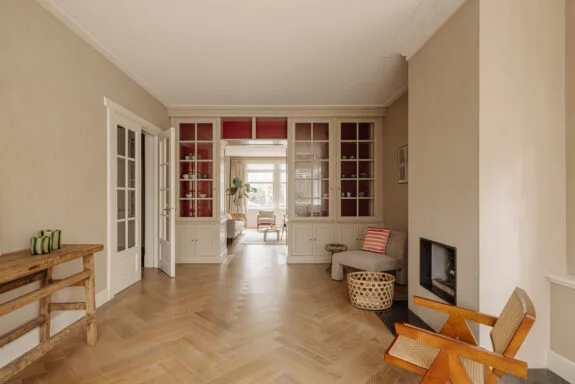 Bij binnenkomst voel je meteen de ruimte en het comfort van deze woning. De royale hal met een tochtportaal zorgt voor een prettige entree. De woonkamer, gelegen aan de rustige straatzijde, strekt zich uit over de volledige breedte van het huis, wat zorgt voor een ruimtelijk gevoel. Extra lichtinval komt binnen via het zijraam, waardoor de sfeer nog aangenamer wordt. Een stijlvolle, op maat gemaakte kastenwand in de sfeer van de oorspronkelijke en-suite zorgt voor een natuurlijke verdeling van de ruimte. Aan de ene kant functioneert deze als boekenkast in de woonkamer, aan de andere kant als servieskast in de eetkamer. De eetkamer zelf biedt volop ruimte om gezellig te tafelen, met een sfeervolle open haard als middelpunt. Grenzend aan de tuin en omringd door grote ramen is deze ruimte heerlijk licht en biedt het een prachtig uitzicht op de tuin en het Vondelpark. De halfopen keuken is van alle gemakken voorzien en heeft een directe verbinding met zowel de eetkamer als de tuin. Hierdoor ontstaat een fijne binnen-buitenbeleving, perfect voor lange zomeravonden of een ontspannen start van de dag. Daarnaast bevindt zich in de hal een apart gastentoilet.
