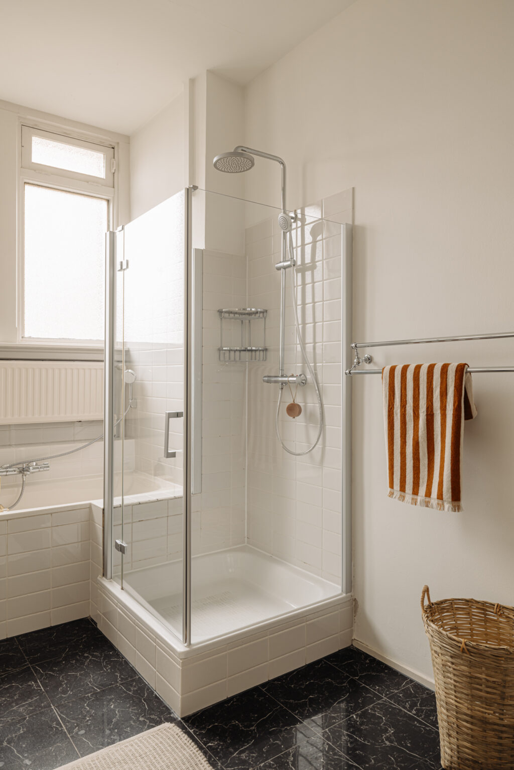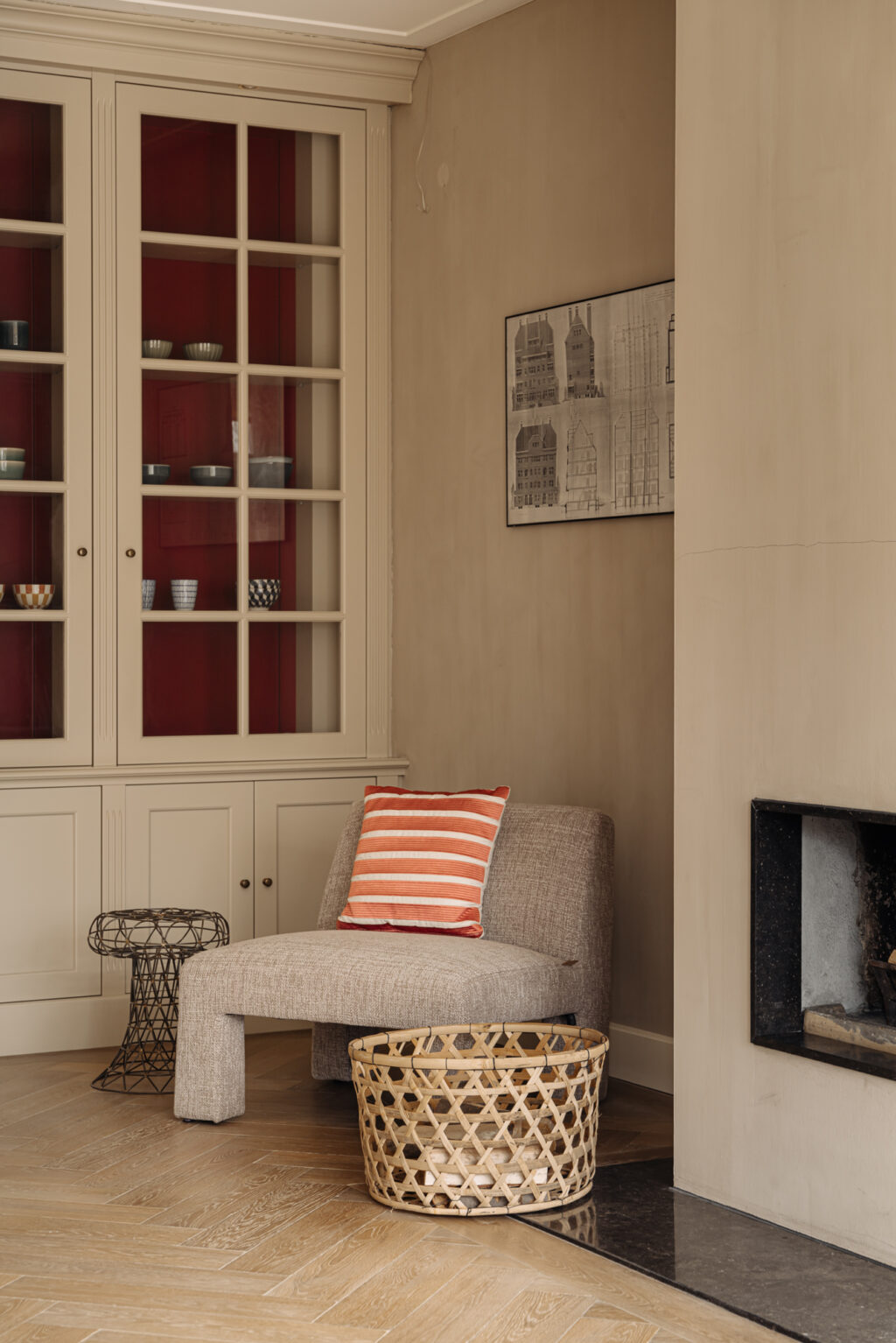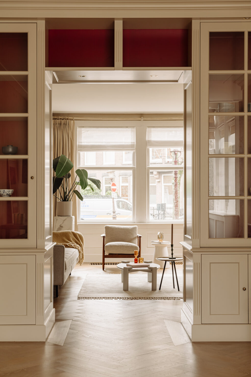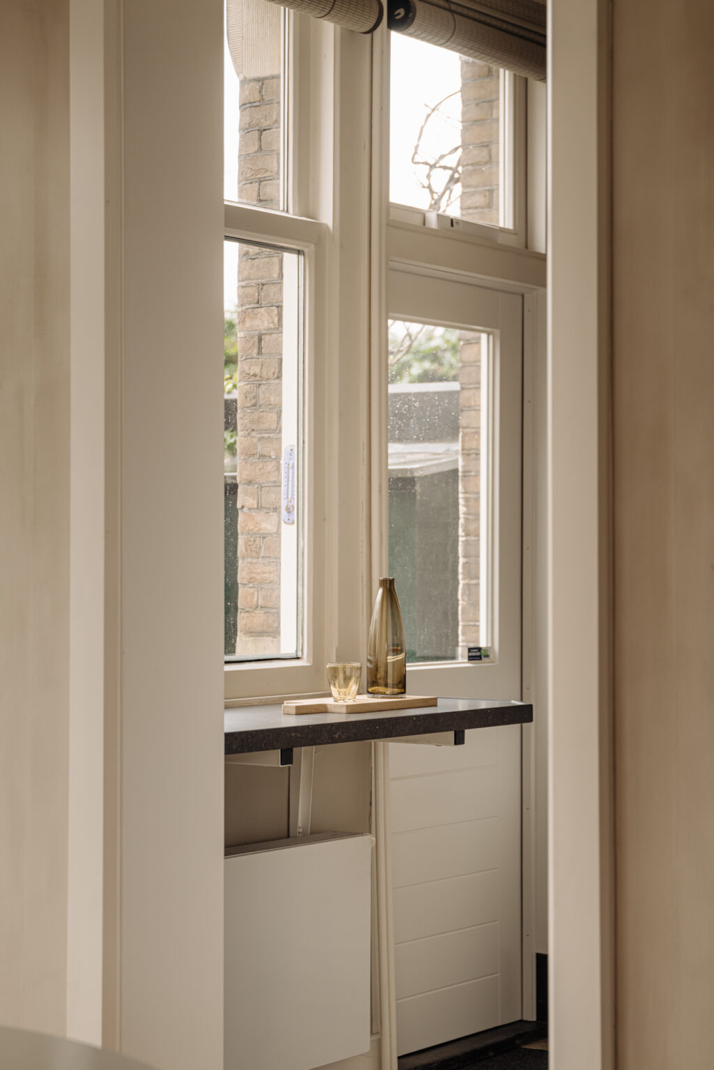 Bij binnenkomst voel je meteen de ruimte en het comfort van deze woning. De royale hal met een tochtportaal zorgt voor een prettige entree. De woonkamer, gelegen aan de rustige straatzijde, strekt zich uit over de volledige breedte van het huis, wat zorgt voor een ruimtelijk gevoel. Extra lichtinval komt binnen via het zijraam, waardoor de sfeer nog aangenamer wordt. Een stijlvolle, op maat gemaakte kastenwand in de sfeer van de oorspronkelijke en-suite zorgt voor een natuurlijke verdeling van de ruimte. Aan de ene kant functioneert deze als boekenkast in de woonkamer, aan de andere kant als servieskast in de eetkamer. De eetkamer zelf biedt volop ruimte om gezellig te tafelen, met een sfeervolle open haard als middelpunt. Grenzend aan de tuin en omringd door grote ramen is deze ruimte heerlijk licht en biedt het een prachtig uitzicht op de tuin en het Vondelpark. De halfopen keuken is van alle gemakken voorzien en heeft een directe verbinding met zowel de eetkamer als de tuin. Hierdoor ontstaat een fijne binnen-buitenbeleving, perfect voor lange zomeravonden of een ontspannen start van de dag. Daarnaast bevindt zich in de hal een apart gastentoilet.