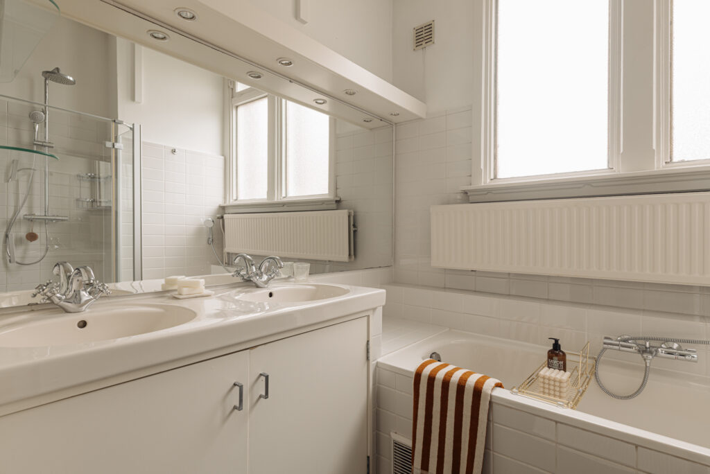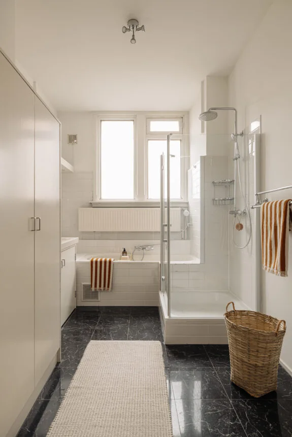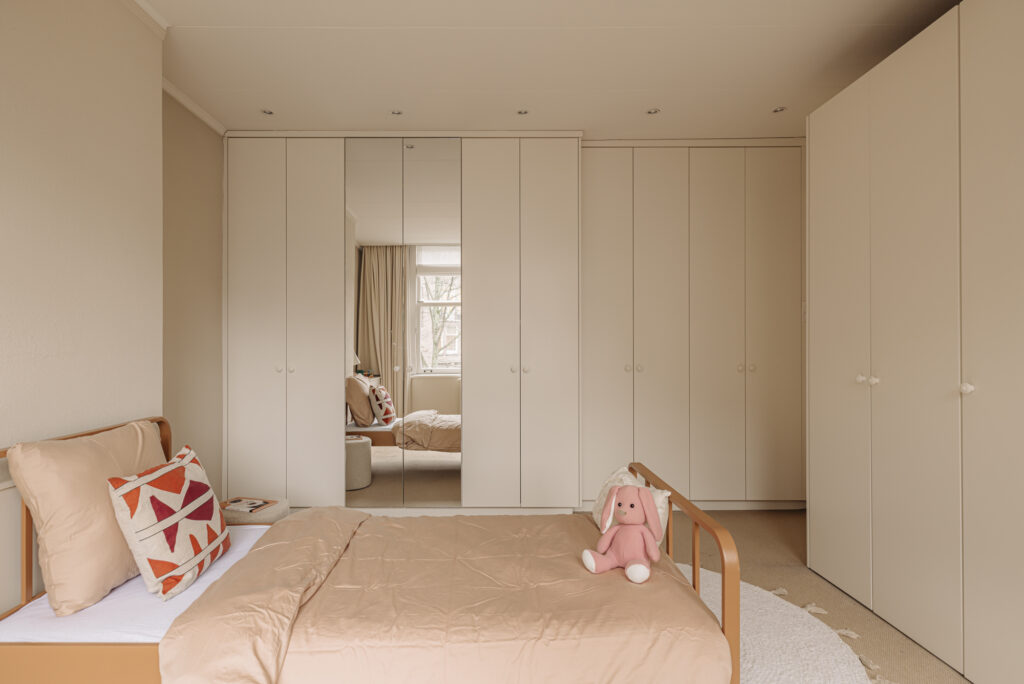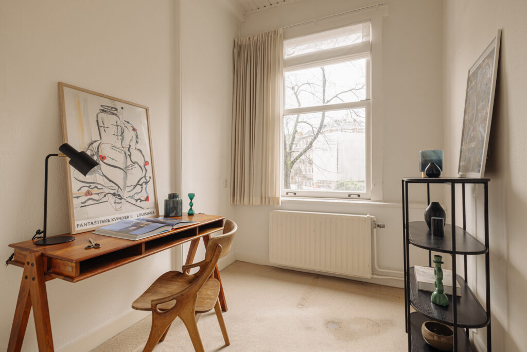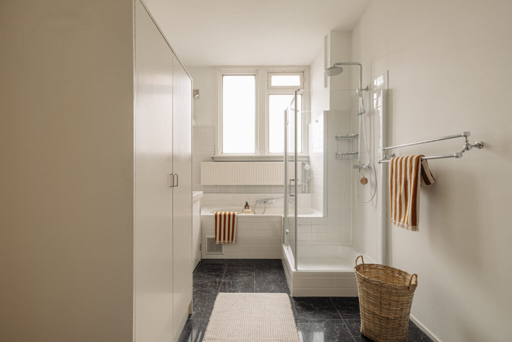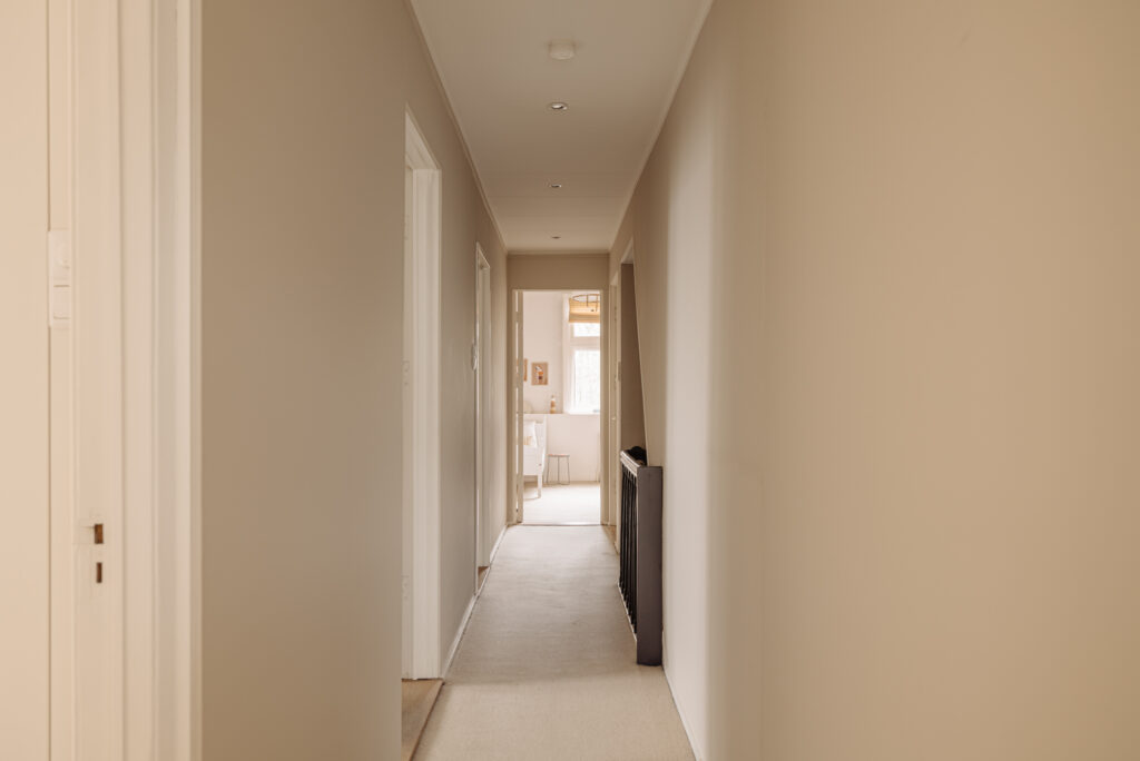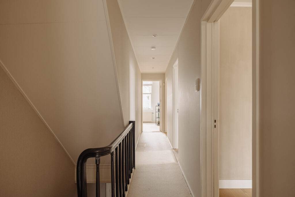 Op de eerste verdieping bevinden zich twee ruime slaapkamers, twee werkkamers en een royale badkamer. De hoofdslaapkamer, gelegen aan de rustige achterzijde, heeft als extra luxe een overdekt balkon/terras. Een ideale plek om de dag in alle rust te beginnen of ’s avonds af te sluiten met een goed boek. De tweede grote slaapkamer ligt aan de voorzijde en beschikt over een inbouwkastenwand. Dankzij de breedte van het pand zijn ook de twee extra kamers volwaardige ruimtes, momenteel ingericht als werkkamers maar ook perfect geschikt als kinderkamers. De centraal gelegen badkamer is ruim en comfortabel, met een ligbad, een aparte douche en een dubbel wastafelmeubel. Dankzij de hoekligging beschikt de badkamer bovendien over een raam, wat zorgt voor natuurlijk daglicht en ventilatie. Daarnaast is er op de overloop nog een separaat toilet.