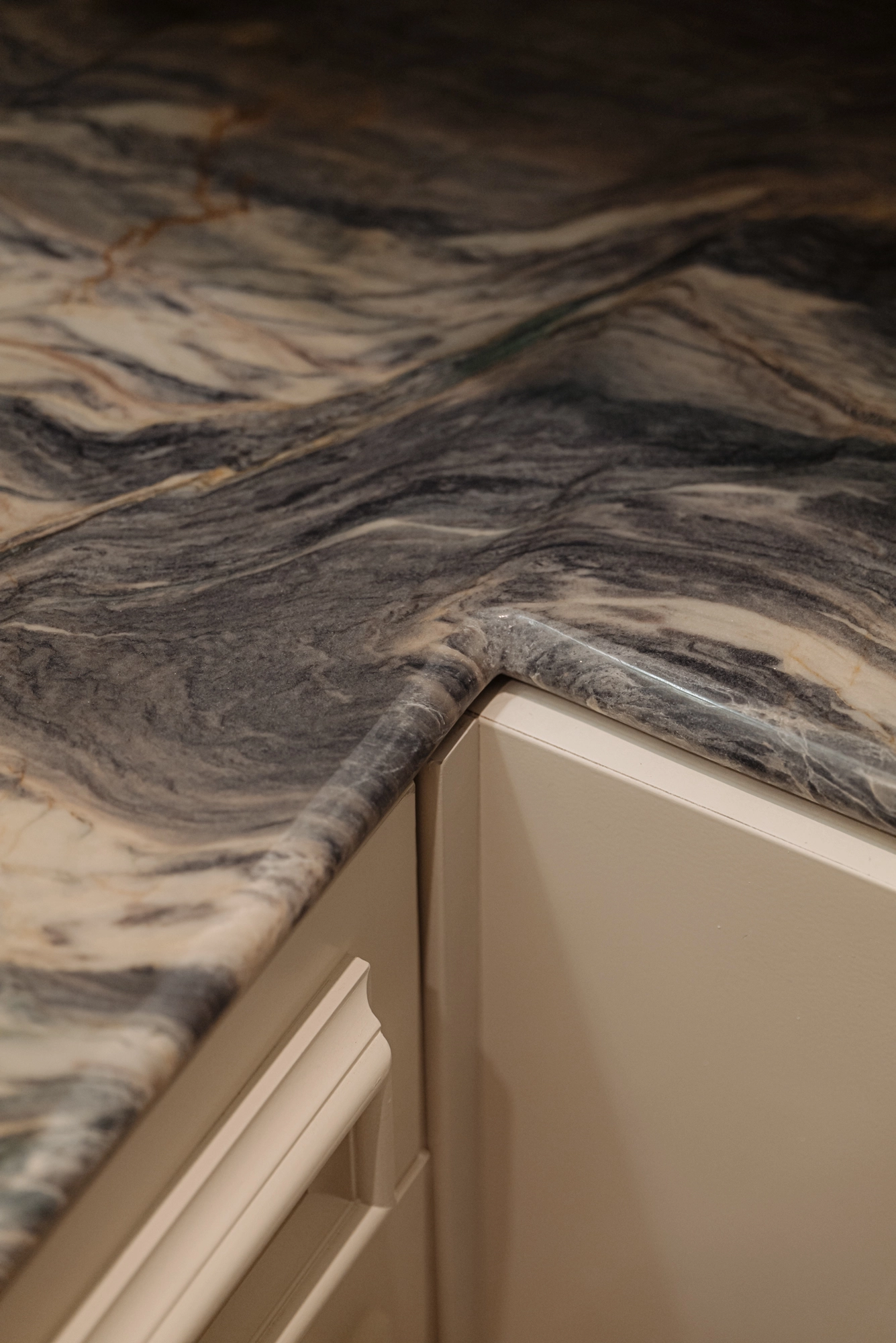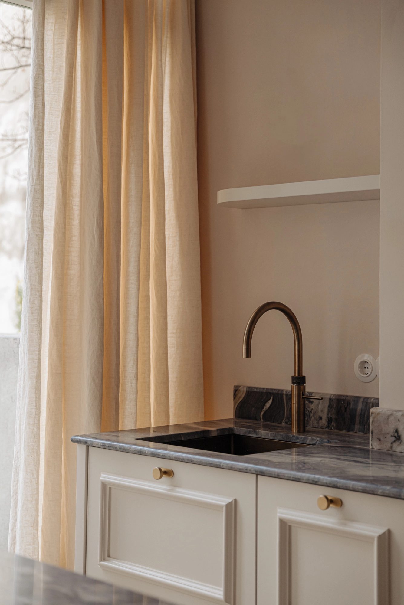 De luxe keuken is uitgevoerd in authentiek marmer, voorzien van mooie klassieke lijsten en luxe apparatuur zoals een Quooker, vaatwasser en ijskast van Siemens. Deze centrale plek in het huis is een belangrijk onderdeel van de beleving en gezelligheid van de ruimte. Er is slim nagedacht over de indeling, er is een eettafel met ingebouwde zitbank, werkplek en een apart loungegedeelte.
