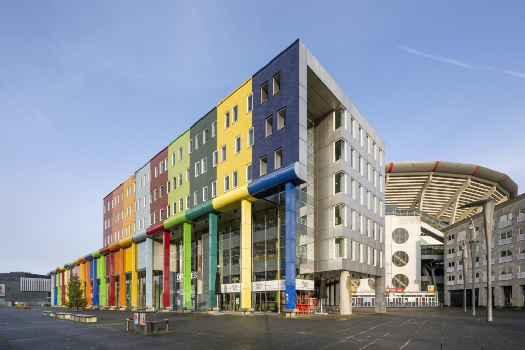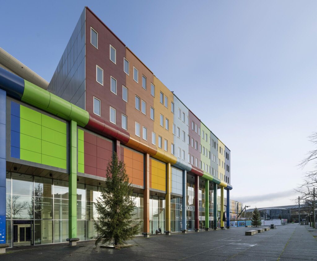 De gekleurde bebouwing wordt onderbroken door twee kantoorgebouwen in natuursteen, die haaks op het stadion staan. Deze twee volumes markeren de zuidelijke entree van het stadion en vormen een vierkant voorplein. Het plintgebouw fungeert in feite als stedelijke poché, een vulling van de ruimte tussen het stadion en de openbare ruimte.