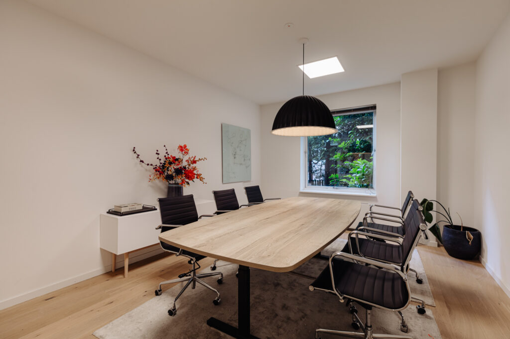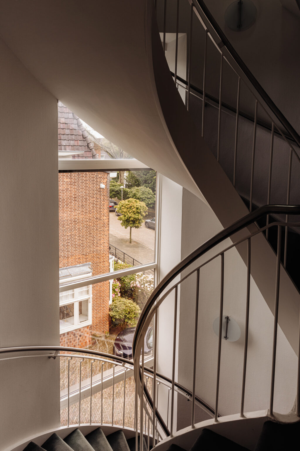 Een bezoeker wordt verwelkomd via een imposante entree met brede voordeur die toegang geeft tot een ruime en lichte hal. Opvallend is de wenteltrap met bovenaan een lichtkoepel. Deze biedt een fraaie doorkijk, zowel van beneden naar boven als andersom. In de hal is tevens een lift aanwezig. De vijf verdiepingen kennen uiteenlopende indelingen met kantoorkamers, een gemeenschappelijke pantry en sanitaire ruimtes. Vanwege de vrijstaande ligging zijn rondom het pand een grote hoeveelheid ramen. Hierdoor zijn alle ruimtes voorzien van een veel daglicht toetreding. Deze bieden aan de achterzijde prachtig uitzicht op de Noorder Amstelkanaal. Aan de voorzijde zijn markiezen aanwezig.