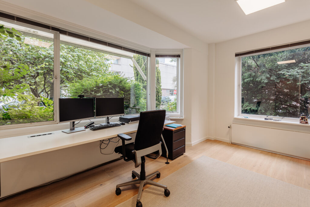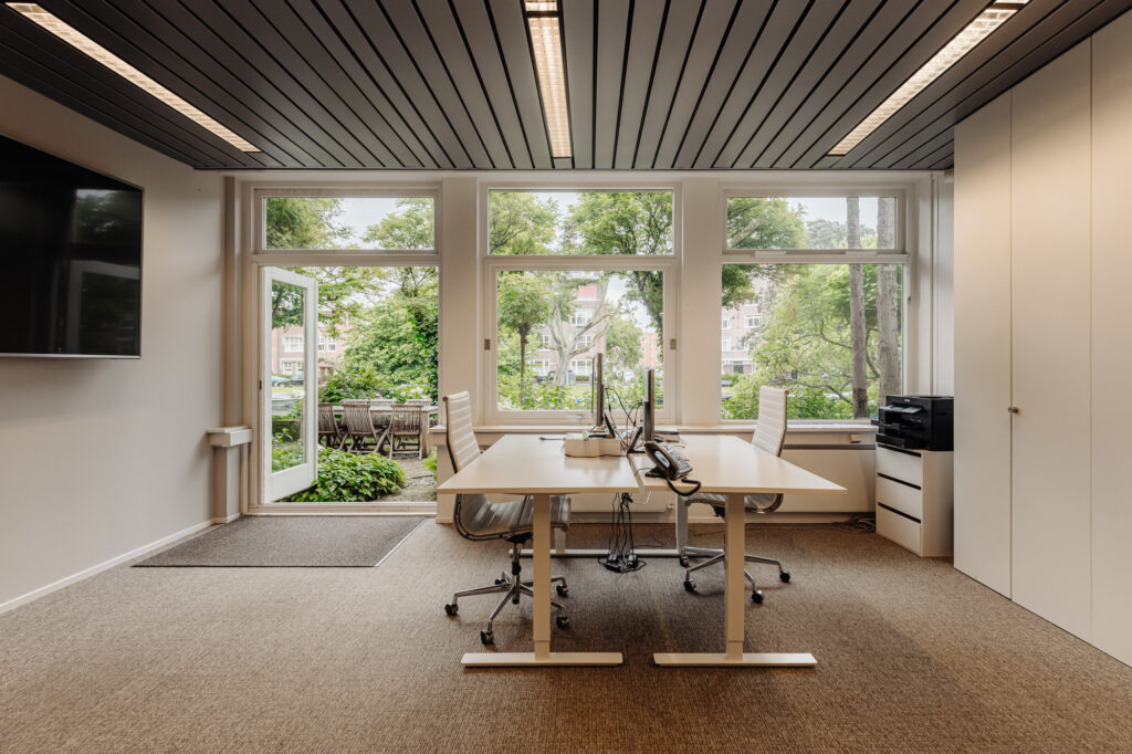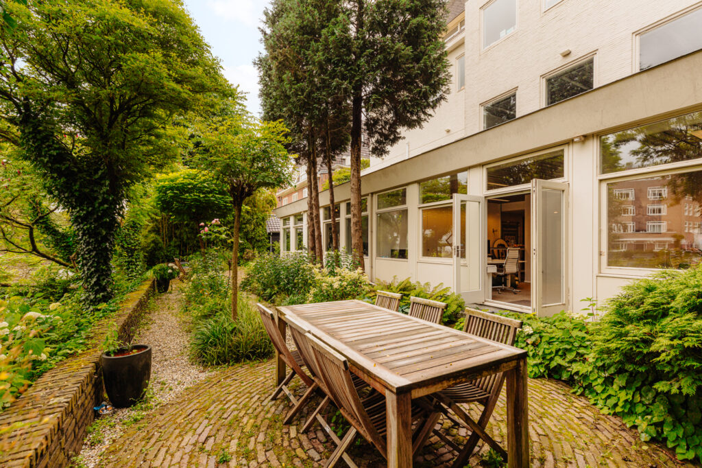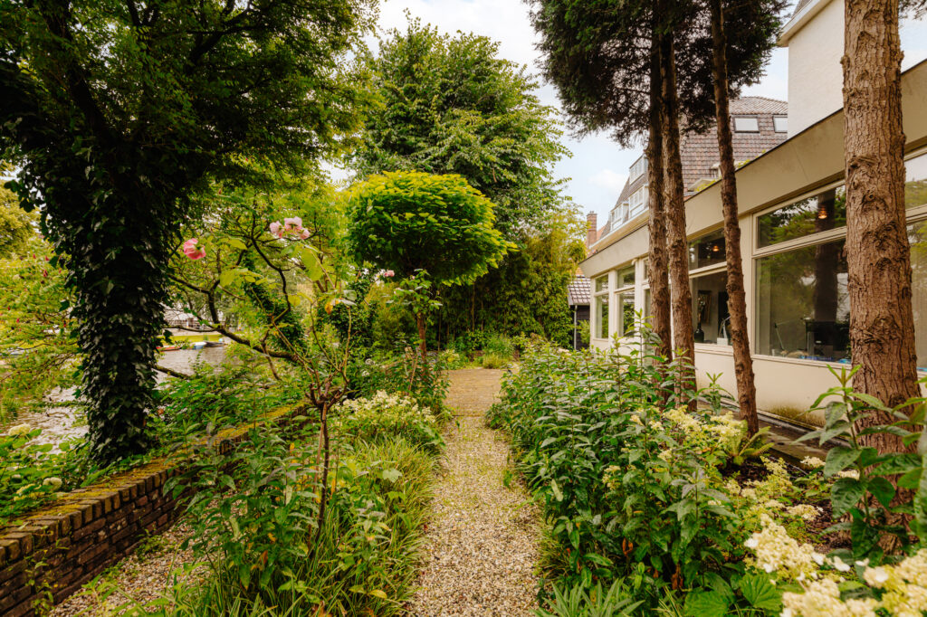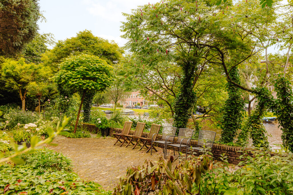 De fraaie achtertuin is via openslaande deuren vanuit een tweetal kantoorkamers te betreden. De tuin is voorzien van groene beplanting, grint paden en twee terrassen met sierbestrating. Deze bieden ruim voldoende plek voor een gezellige lunch of borrel na een werkdag. Aan de linkerkant is een trap die naar een steiger leidt waar gelegenheid is om een boot aan te leggen.