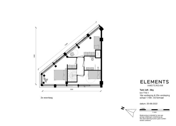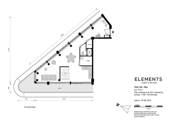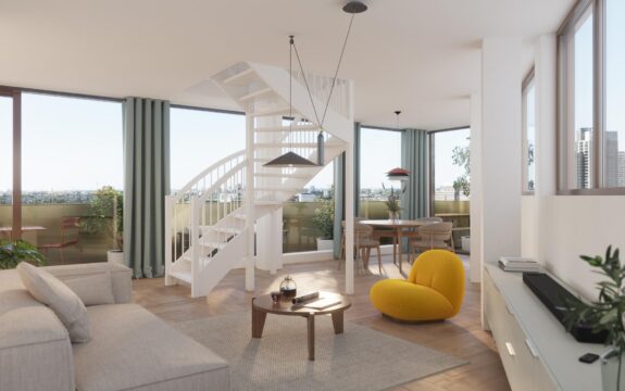 Deze Sky twin loft van 116 m2 op de 19e en 20e verdieping ligt in de punt, met aan twee zijden ramen. Dat staat garant voor heel veel licht en waanzinnig panoramisch uitzicht over de Amstel, de stad en het groene achterland. Het terras van circa 22 m2 ligt op het zuidwesten. Het appartement heeft een open indeling met op de negentiende verdieping de keuken en ruimte voor een zithoek en eethoek. Via de trap kom je op de tweede woonlaag met drie slaapkamers en de badkamer.