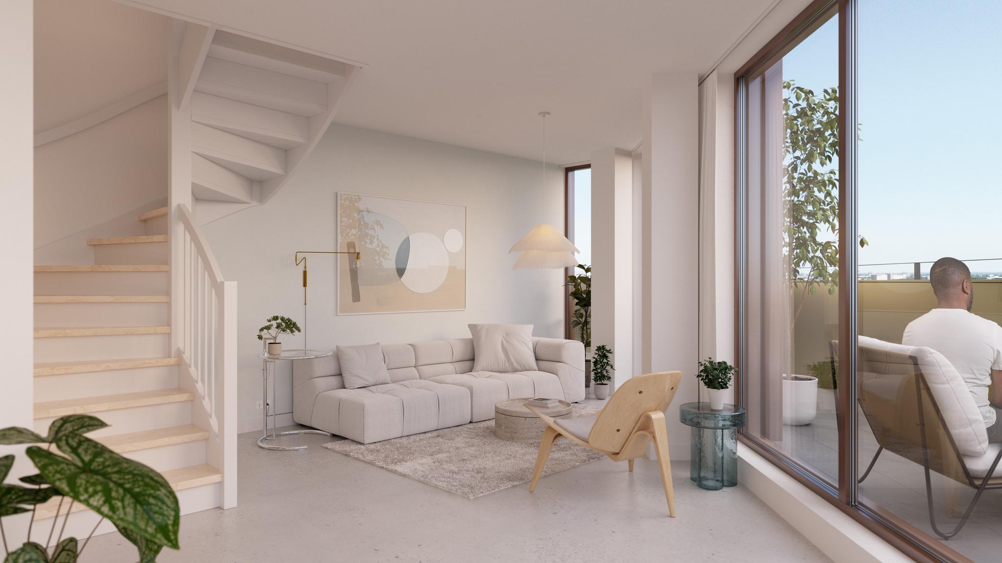 Deze royale Sky Twin Loft ligt op de 15e en 16e verdieping van Elements en heeft twee slaapkamers. De loft heeft een heerlijke windluwe ligging op het zuidoosten. De living op de eerste woonlaag heeft een open loft-achtige indeling en geeft toegang tot een royaal terras over de gehele breedte van de woning. Hier beleef je het uitzicht dat ieder moment van de dag weer anders is. Door de grote raampartijen geniet je de hele dag van heerlijk lichtinval.