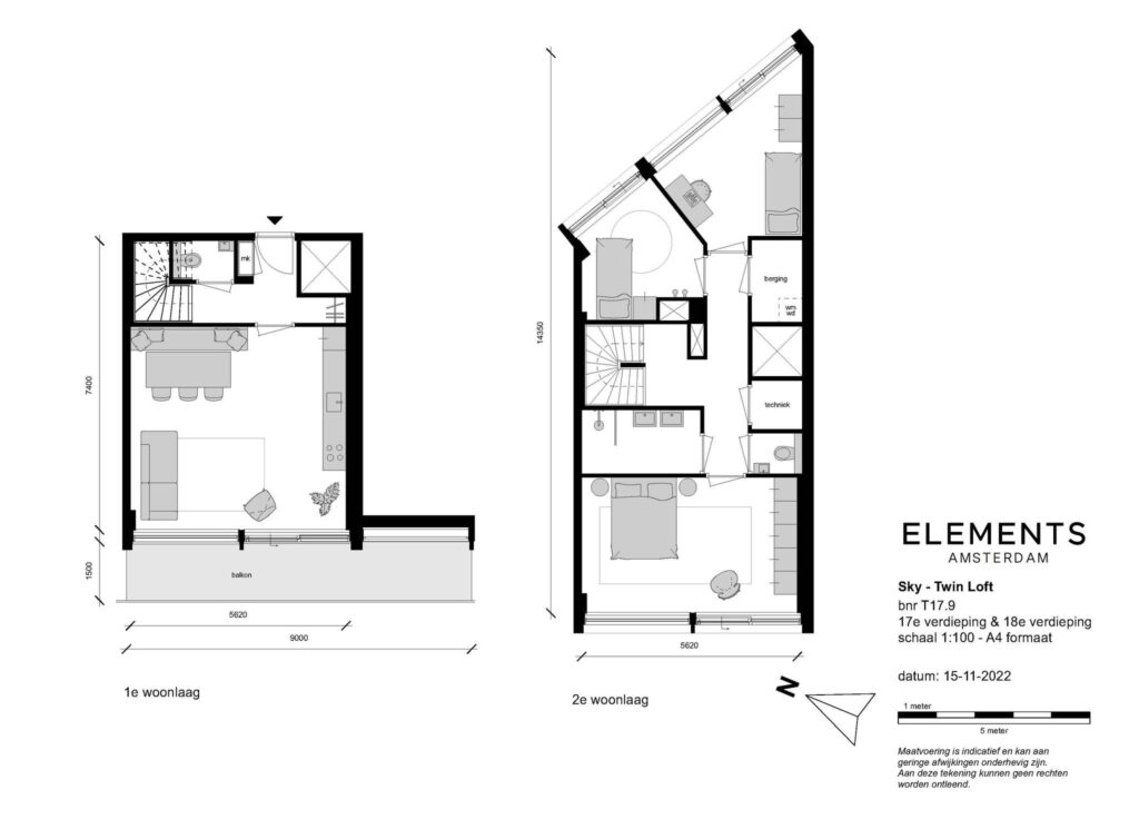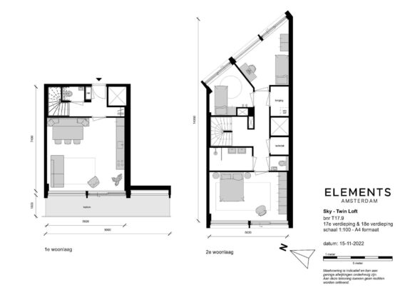 Deze royale Sky Twin Loft ligt op de 17e en 18e verdieping van Elements. Deze zogenaamde doorzonloft heeft grote raampartijen aan de slaapkamerzijde met uitzicht over de Amstel en de skyline van Amsterdam, dat ieder moment van de dag weer anders is. De loft heeft drie slaapkamers. Het balkon over de volle breedte van de woning heeft een perfecte zonligging, waardoor je de hele dag zon hebt.