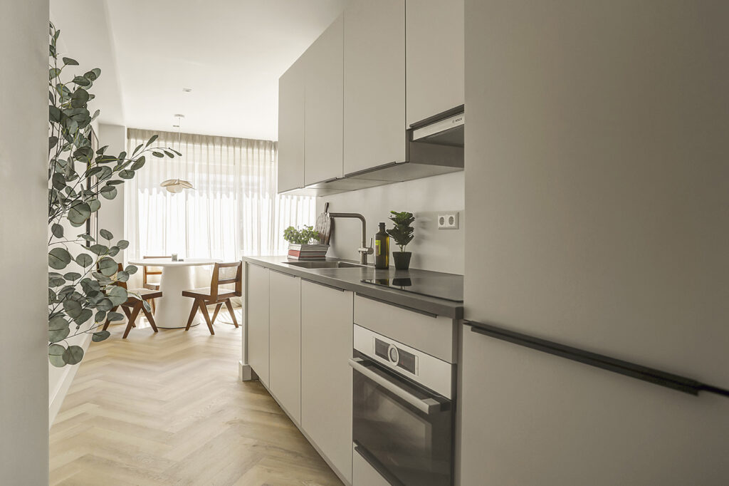 Upon entering the building, you're greeted by the well-maintained entrance in the central hall, providing access to the ground floor residences. To the left side of the corridor, you'll find the studio apartments 48 A through F, offering a lively street view. Studio 48 B is particularly luminous, situated on the corner with an additional window along the longer wall. Stepping into the apartment, you encounter an entrance area designed for a wardrobe. The kitchen spans the length of the apartment and is equipped with a dishwasher, washer-dryer combo, induction cooktop, and fridge with a freezer. The living room offers ample space for a seating area and a dining table. Sliding open the large windows allows access, via a small step, to the wide sidewalk where you can enjoy a coffee in the sun. The sleeping area is open and can be partially separated by a clever closet wall or room divider. The bathroom is spacious, featuring a toilet, wide sink with an illuminated mirror, and a walk-in shower.