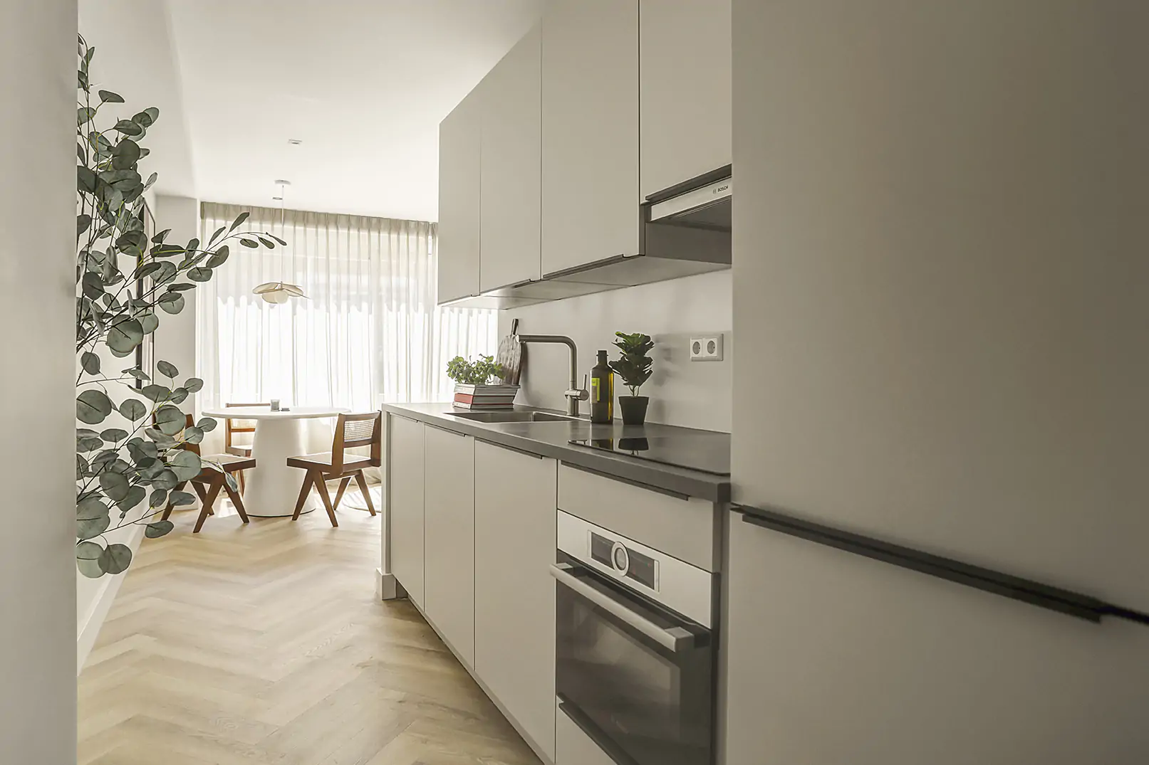 Bij binnenkomst in het appartement tref je een entree met een plek voor een garderobe. De keuken strekt zich uit over de lengte van het appartement en is voorzien van een vaatwasser, was-droog combinatie, inductiekookplaat en ijskast met vriezer.