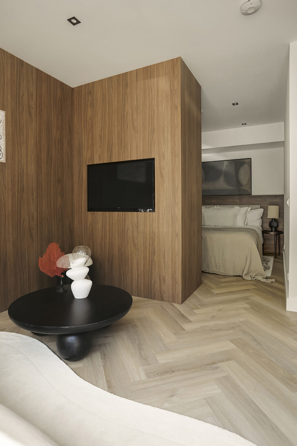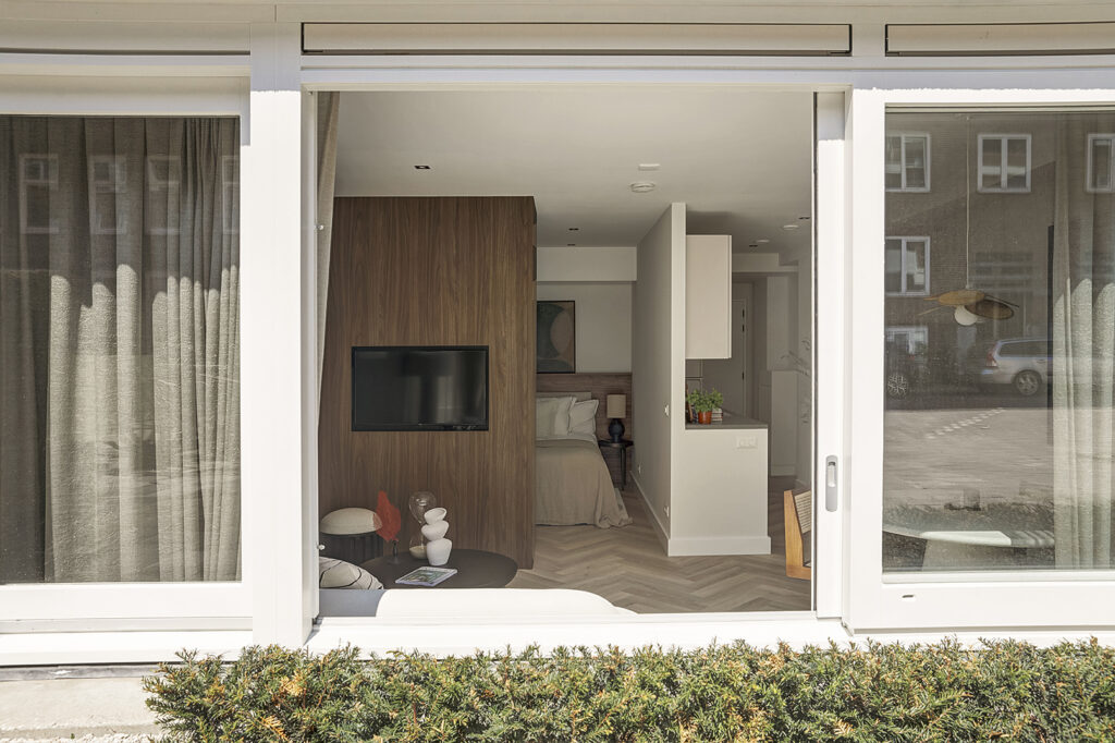 De woonkamer biedt voldoende ruimte voor een zitgedeelte en een eettafel. Als je de grote ramen openschuift, zou je via een trappetje het brede trottoir op kunnen stappen om een koffie te drinken in de zon. Het slaapgedeelte is open en kan gedeeltelijk worden afgescheiden door een slimme kastenwand of kamerscherm. De badkamer is ruim opgezet en beschikt over een toilet, brede wastafel met een verlichte spiegel en inloopdouche.