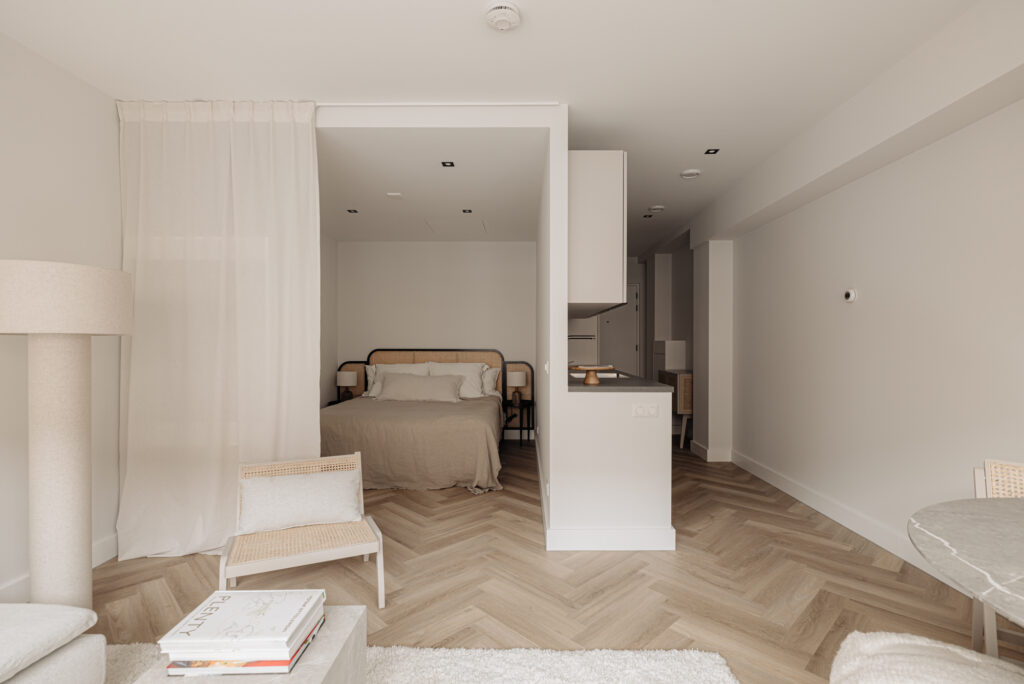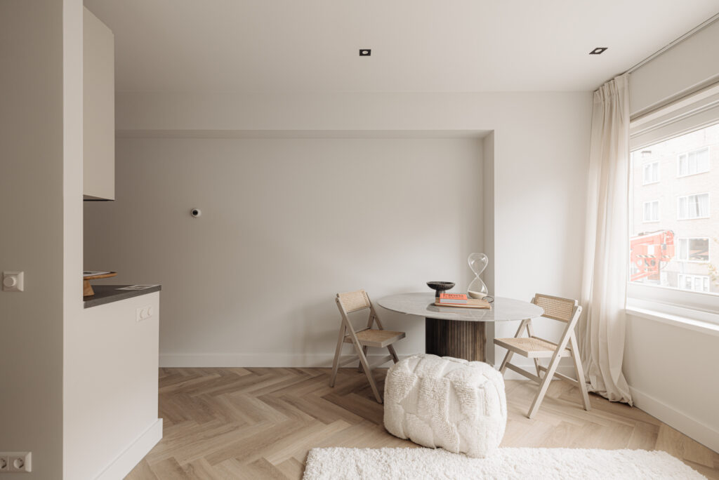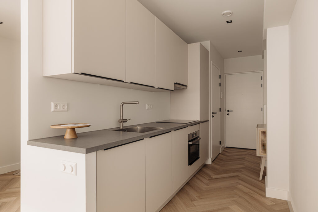 De studio appartement aan de voorzijde verwelkomt je met een entree met garderobe. De keuken, die zich over de lengte van het appartement uitstrekt, is uitgerust met moderne gemakken zoals een vaatwasser, ingebouwde wasmachine/droger combinatie, inductiekookplaat, ijskast en vriezer.