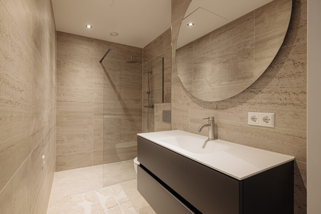 De badkamer is royaal en heeft een luxe uitstraling door de marmerlook wandtegels. Er is een toilet, brede wastafel met verlichte, ronde spiegel en een inloopdouche. Het duurzame karakter van dit project komt o.a. tot uiting in de toepassing van dubbel glas.