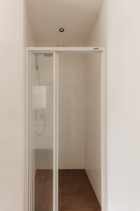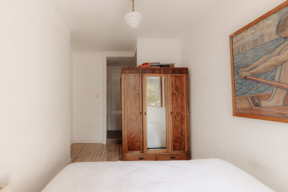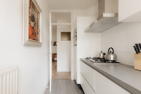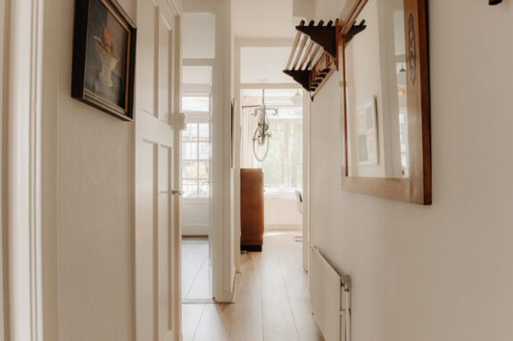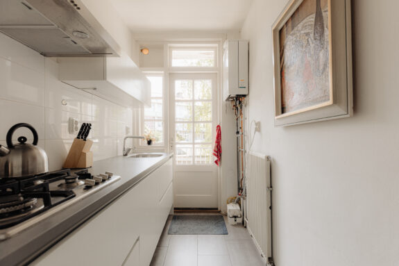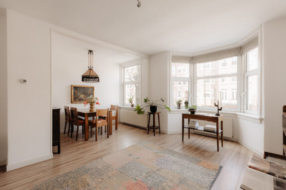Private entrance into the porch from the street. Entrance hall with access to all rooms and toilet. The living room is located at the front of the apartment, overlooking the street. In the open side room is the dining room with enough space for a large dining table.