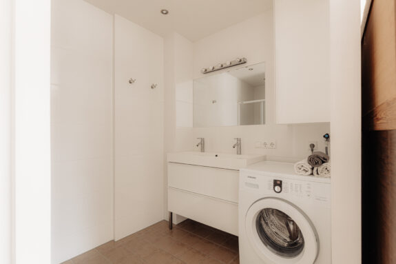At the rear is the closed kitchen with built-in appliances and access to the balcony. The main bedroom has French doors to the sunny south-facing balcony and has an en suite bathroom with shower, double sink, and washing machine connection. The second bedroom is also located at the rear and also has access to the balcony.