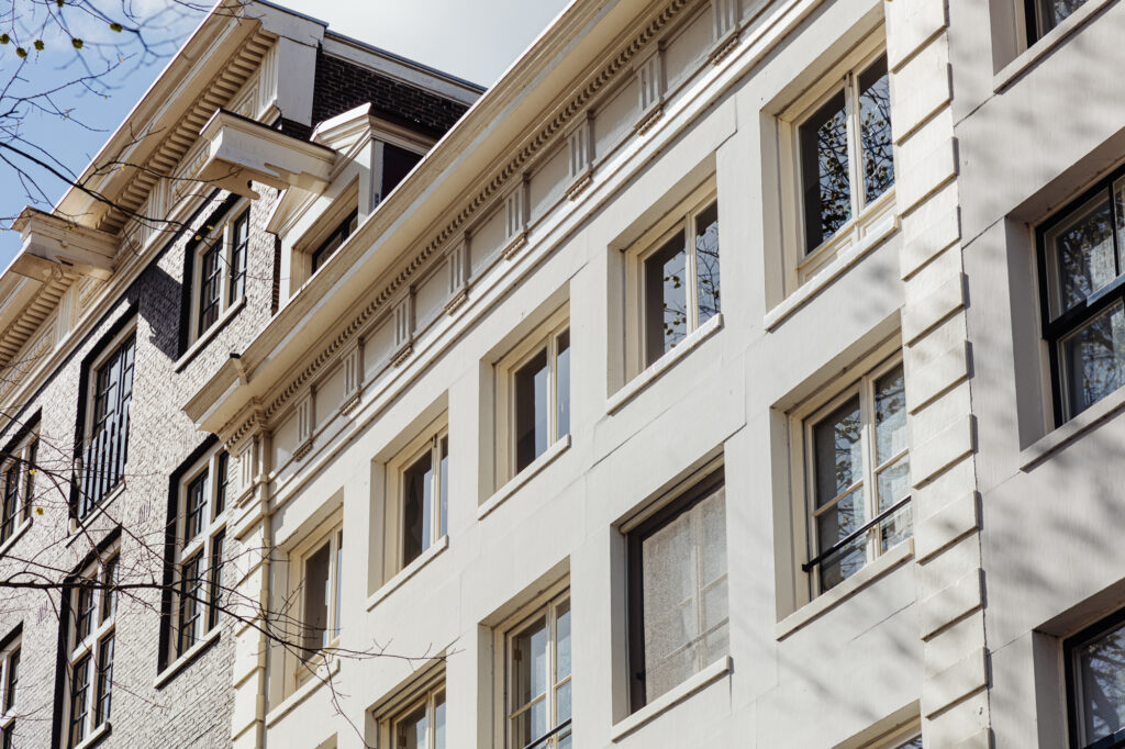 These are the main features of the building: a sandstone building with corner pilaster strips and triglyph string courses, spanning the width of five windows (18th century). Carved door transom. Stucco hall, marble hall stairs with copper banister, carved hall door, staircase with carved wooden banister. Very little is known about the history of the building at Amstel 222. There is no information about the original architect, for example, or who it was built for and why. However, we do know who occupied the building from around 1900 to 1960. It was a company called Stibbe & Co, which imported gramophone records bearing the Odeon record label. Hence the name of the building: Odeon. The renovations to divide the building into the current residential apartments started in the 1990s. These are now: a downstairs apartment comprising the ground floor, lower-ground floor, basement and garden; a first-floor apartment in the front part of the building and the second floor of the rear part of the building; an apartment on the second floor of the front part of the building and the third floor of the rear part; and finally the apartment that is currently for sale.