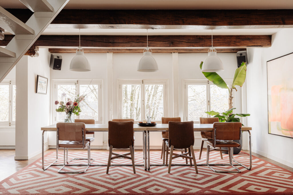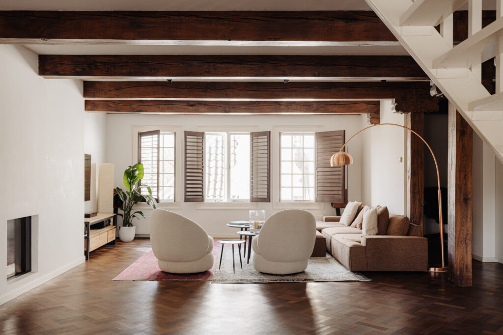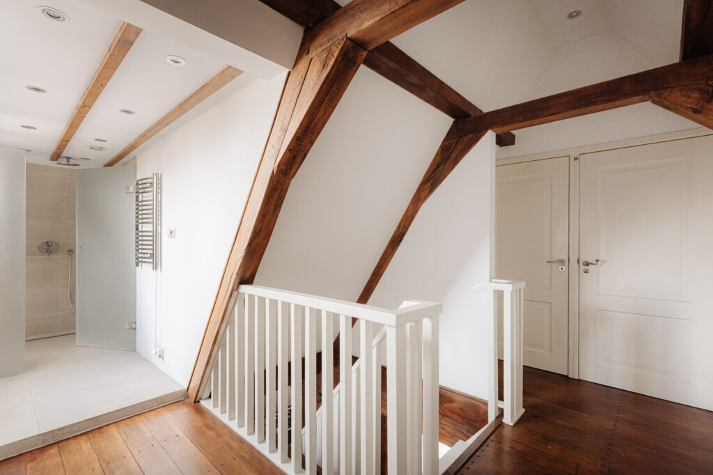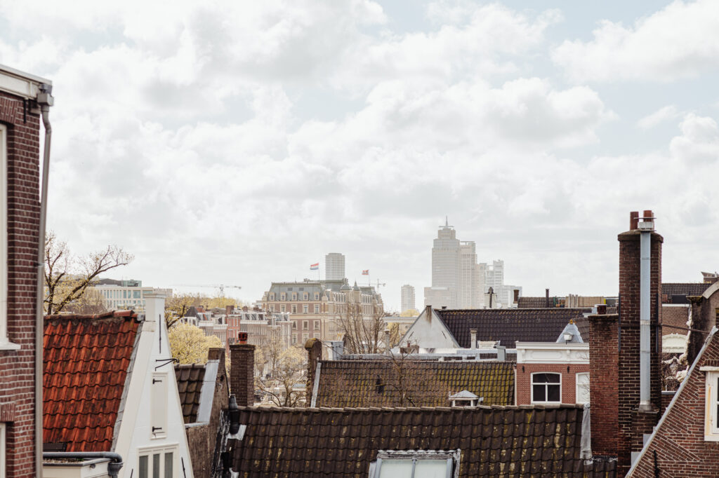 You enter the building via a beautiful communal stucco hall with an original marble floor. A low-rise staircase with a carved wooden banister leads up to the third floor. The first thing that strikes you on entering the apartment is the 9-metre front wall with a staggering five windows overlooking the River Amstel! The original beams with white plaster ceilings give this floor an authentic feel. The ceiling height between the beams is 2.73 metres, which is unusually high for a top floor. The space is divided into a kitchen/diner on the Amstel side and a sitting room. The kitchen has a kitchen island, various fitted appliances, and a marble worktop. Thanks to the width of the property, there is also room for large dining table for entertaining. The sitting room with a central gas fireplace is on the inside, next to the lightwell. Three windows overlook the courtyard gardens of properties on the River Amstel and Keizersgracht canal.