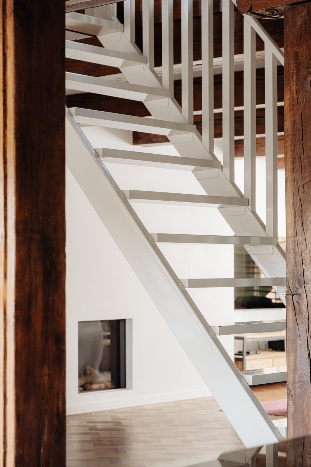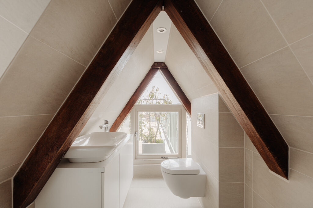 A central steel staircase leads to the bedroom floor upstairs. There is a sizeable bedroom with private bathroom at the front. The bathroom features a closed-off section with a shower and toilet, and an open section with a bath and vanity unit in the bedroom. The bedroom is completed with large fitted wardrobes. Another bedroom/office is at the front. A second good-sized bedroom at the rear has two large skylights facing the rooftop terrace and a fitted wardrobe. A bathroom in the middle features a walk-in shower, wash basin, and toilet.