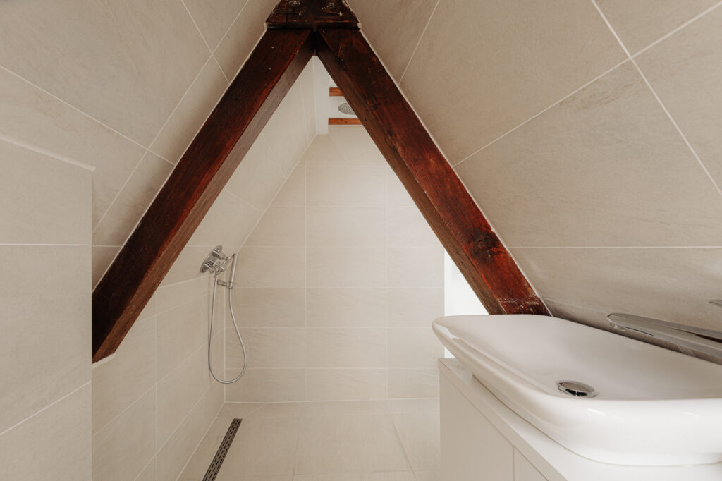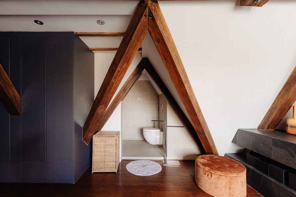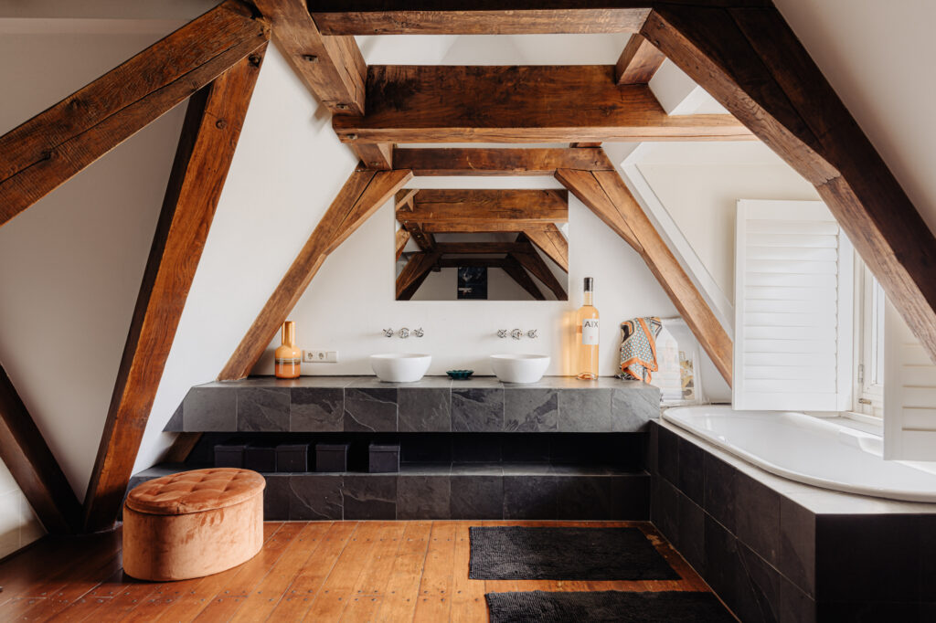 Op de bovengelegen slaapverdieping bevinden zich drie slaapkamers, waarvan één met eigen badkamer met afgesloten douche, ligbad en wastafelmeubel. De andere twee slaapkamers delen een centraal gelegen badkamer met inloopdouche, wastafel en toilet.