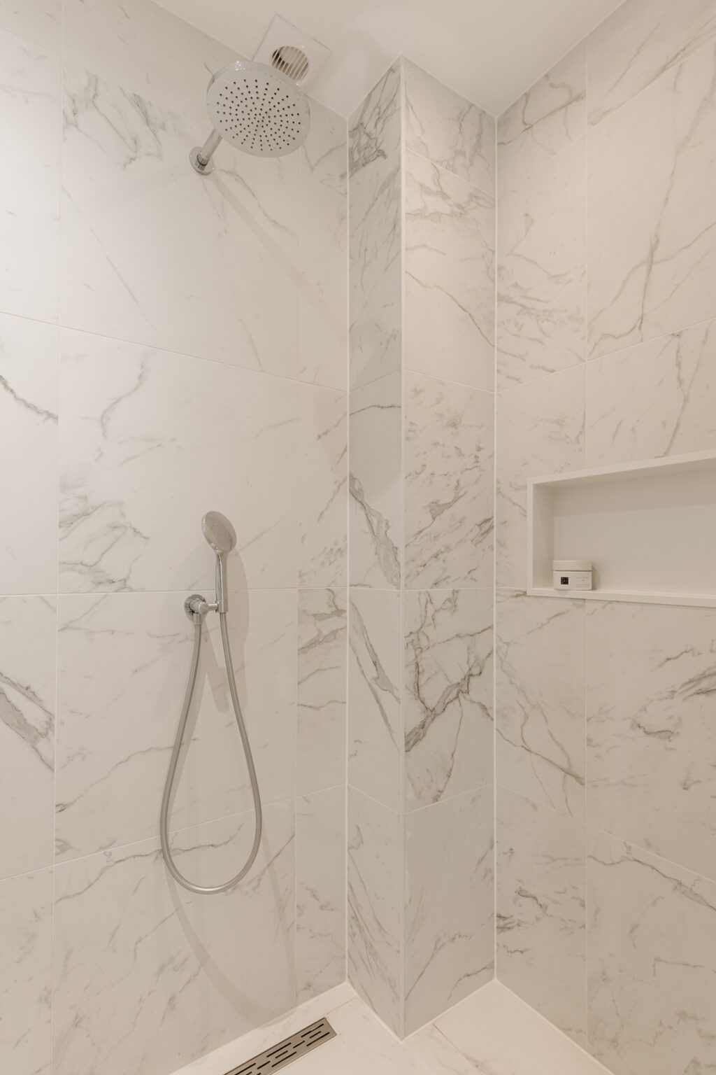 The modernized and inviting bathroom presents an elegant in-wall shower and a double sink, ensuring a serene and comfortable bathing experience.