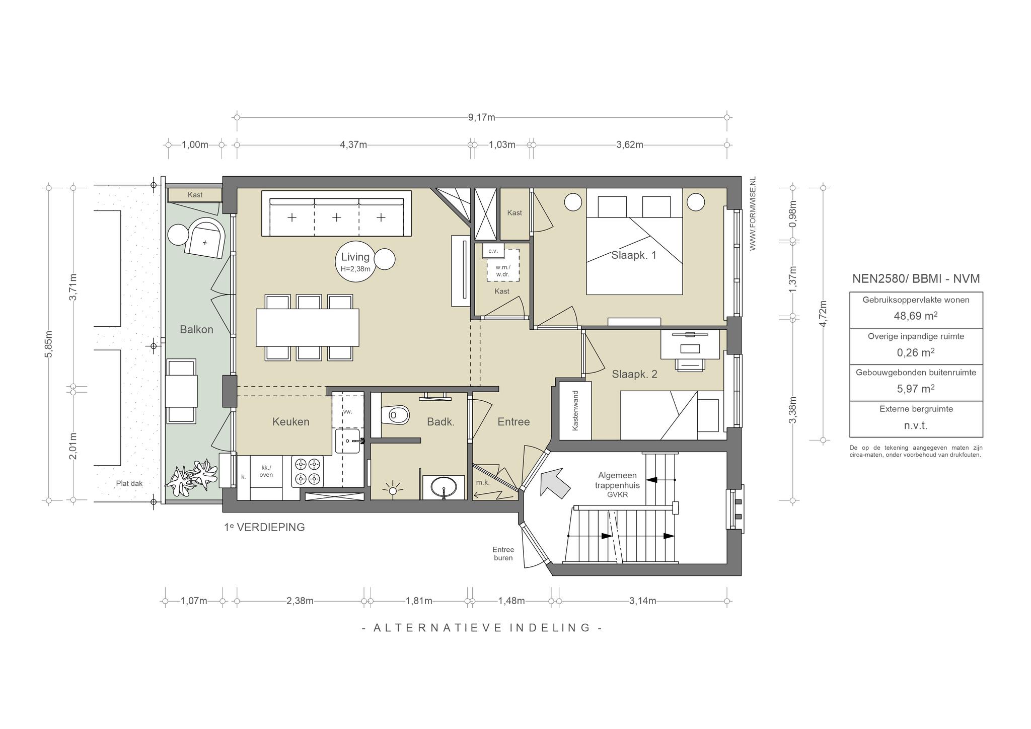 De royale slaapkamer is aan de voorzijde en heeft een prachtige kastenwand. Er is een mogelijkheid om een tweede slaapkamer te creëren. Zie alternatieve indeling. De hippe badkamer is ruim opgezet en heeft een inloopdouche, wastafelmeubel en toilet.