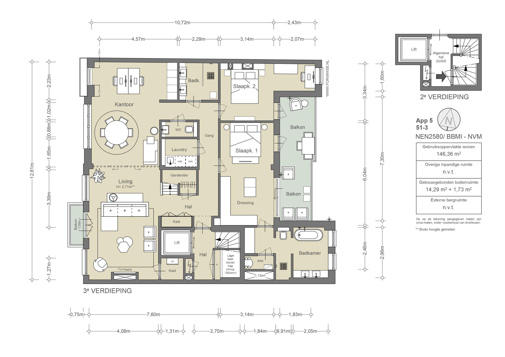 The spacious living room has large west-facing windows. On the garden side are two bedrooms, each with its own bathroom and balcony. The master bedroom has an adjoining spacious dressing room. Optionally, a third bedroom can be created.